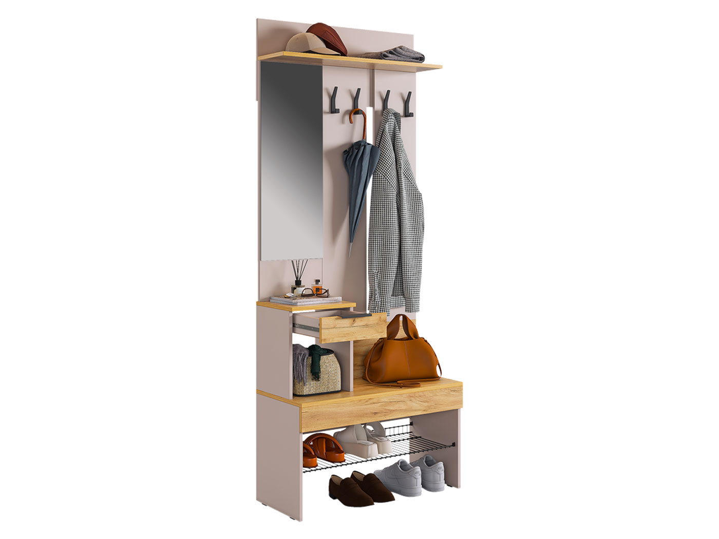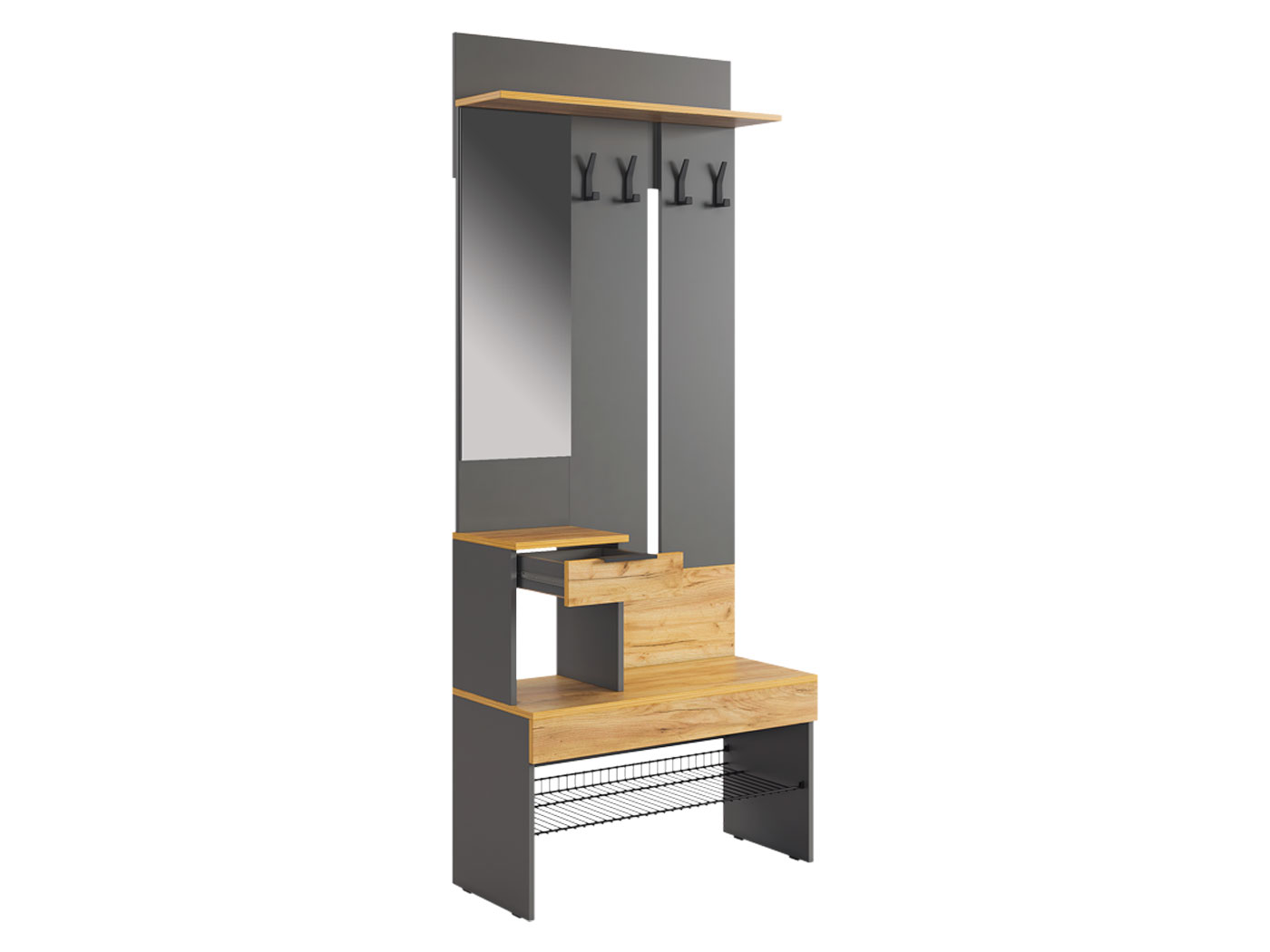 Прихожая Баско — идеальный вариант для небольшого пространства. Несмотря на компактность, в ней есть всё, чтобы организовать идеальный порядок при входе в квартиру. Открытая вешалка с крючками обеспечит место для курток и плащей, сотовая полка подойдет для хранения уличной обуви. Зеркало добавит обстановке света, а выдвижной ящик удобен для важных мелочей.