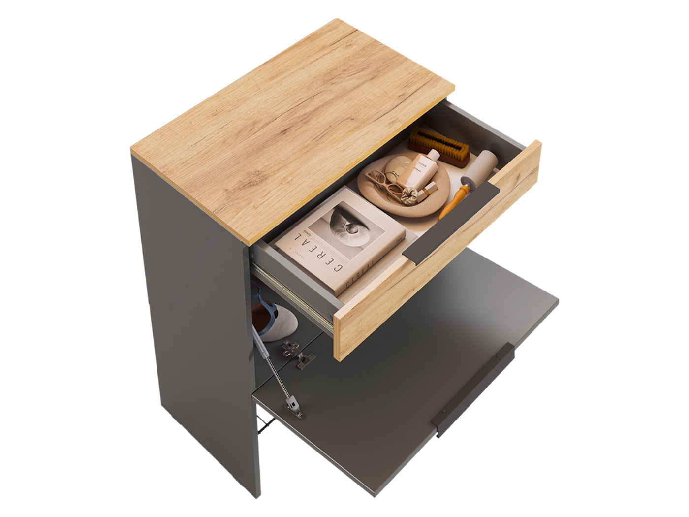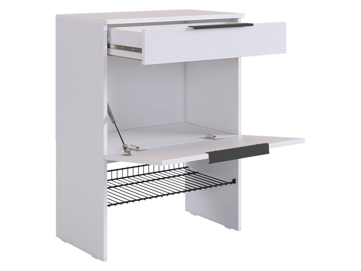 Обувница Баско — компактная современная модель, которая позволит разместить несколько пар туфель, ботинок, кроссовок, а также домашние тапочки. Выдвижной ящик подойдет для аксессуаров, за откидной дверцей можно спрятать сезонную обувь, а на открытой полке удобно хранить повседневную.