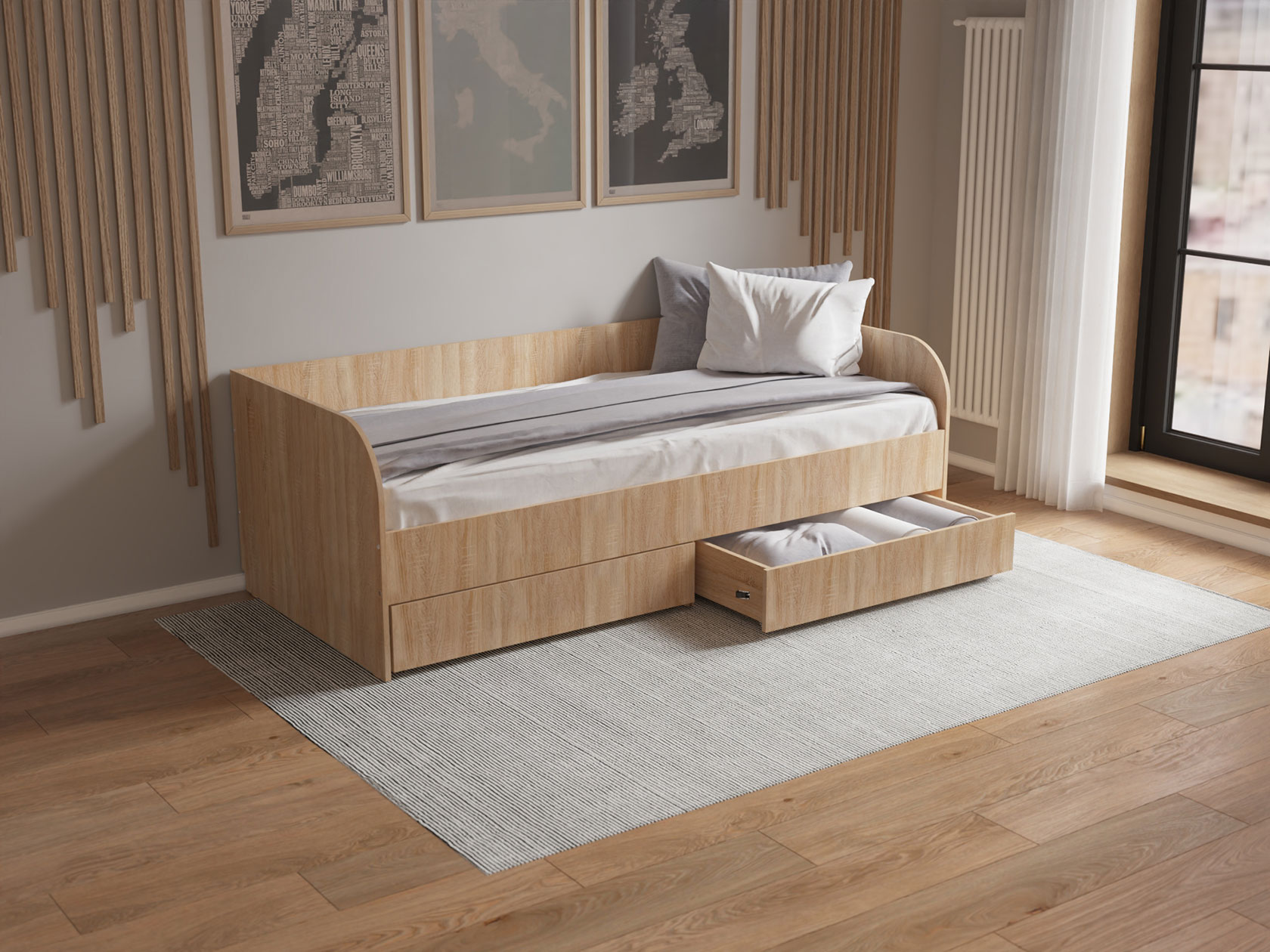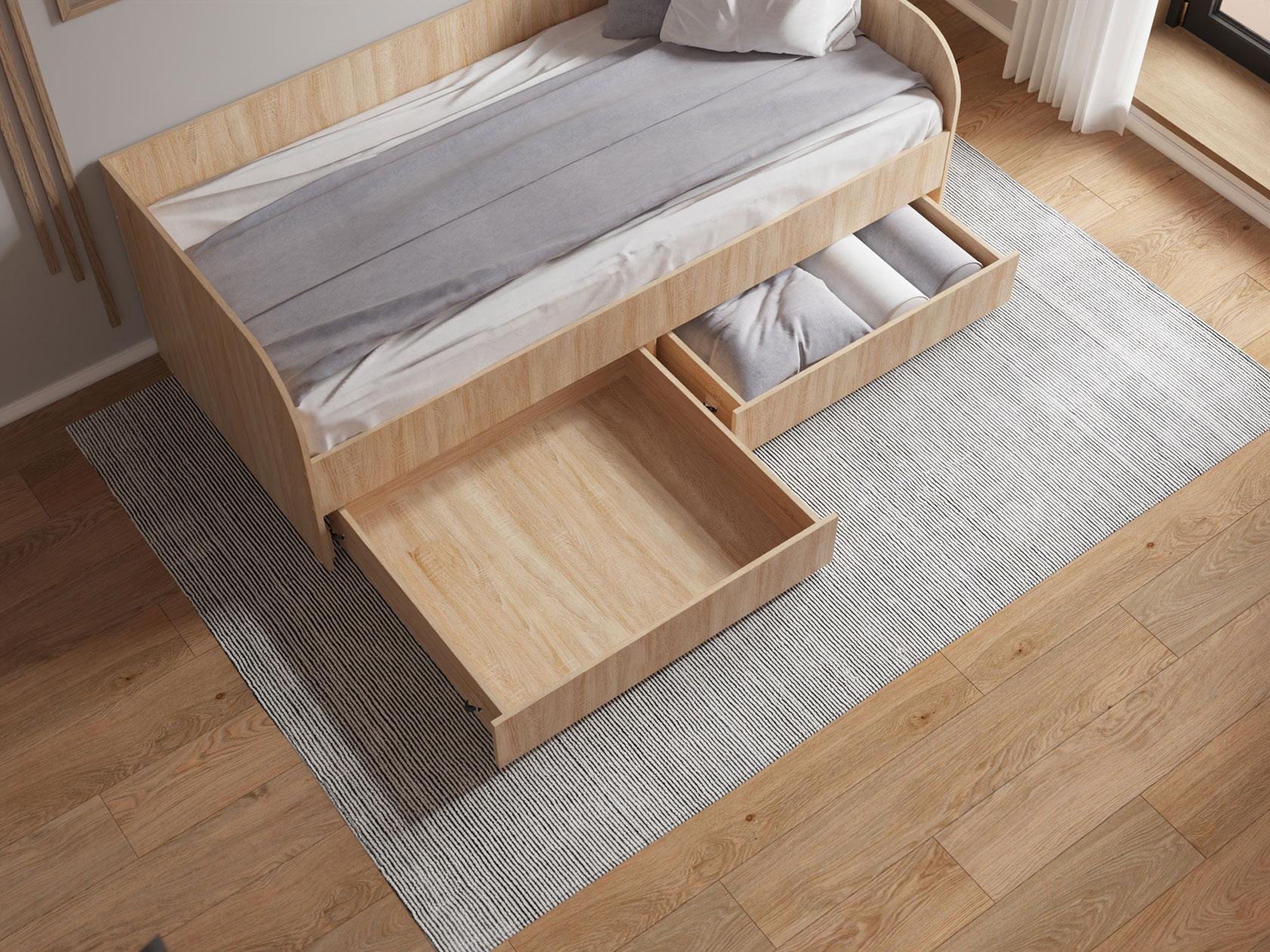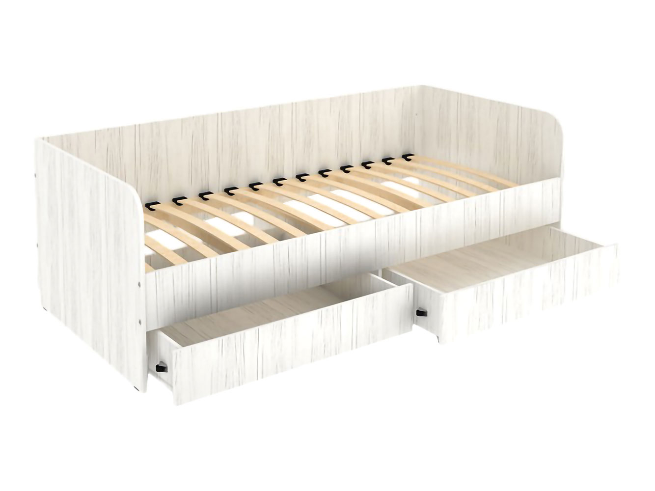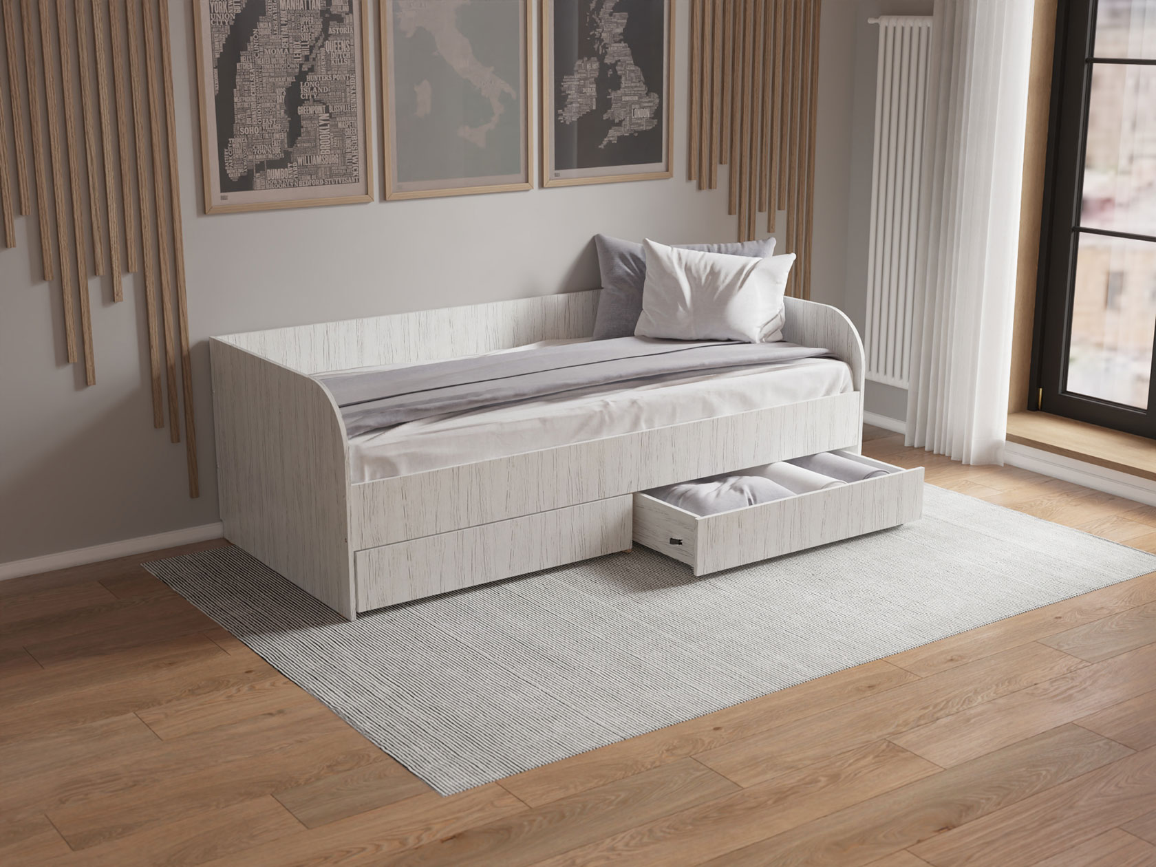 Привлекательная своей простотой кровать Мерлен — практичное решение для гостевой комнаты, детской или студии. Днем модель послужит уютным местом для отдыха, а на время сна заменит полноценную кровать. Основание с ламелями обеспечивает комфортную опору для матраса, а выдвижные ящики создают дополнительное пространство для хранения.