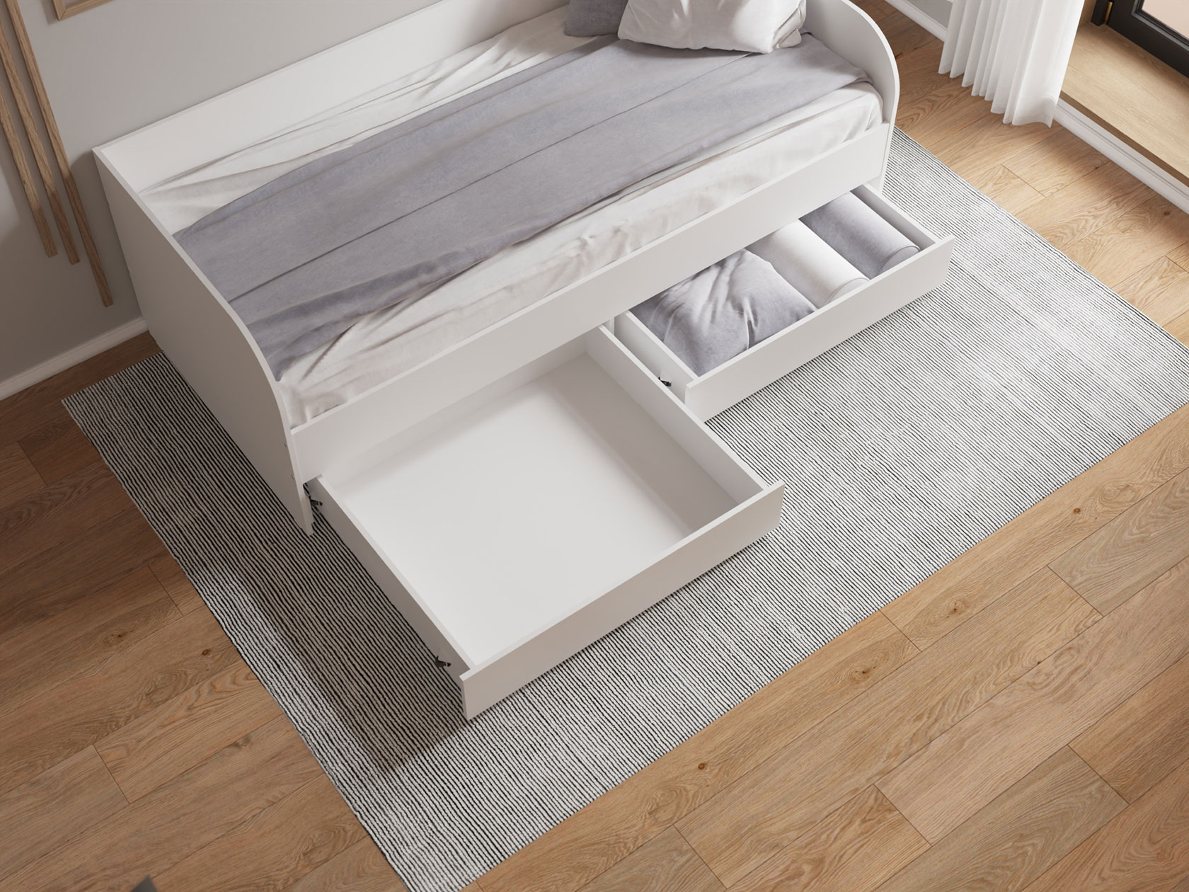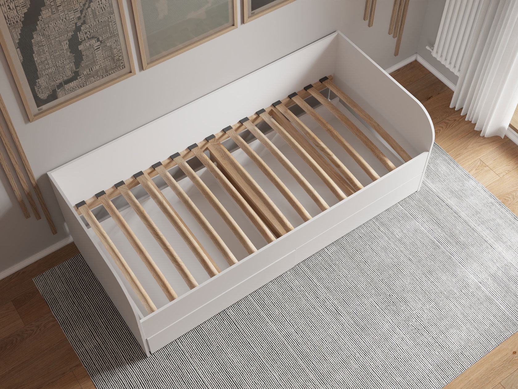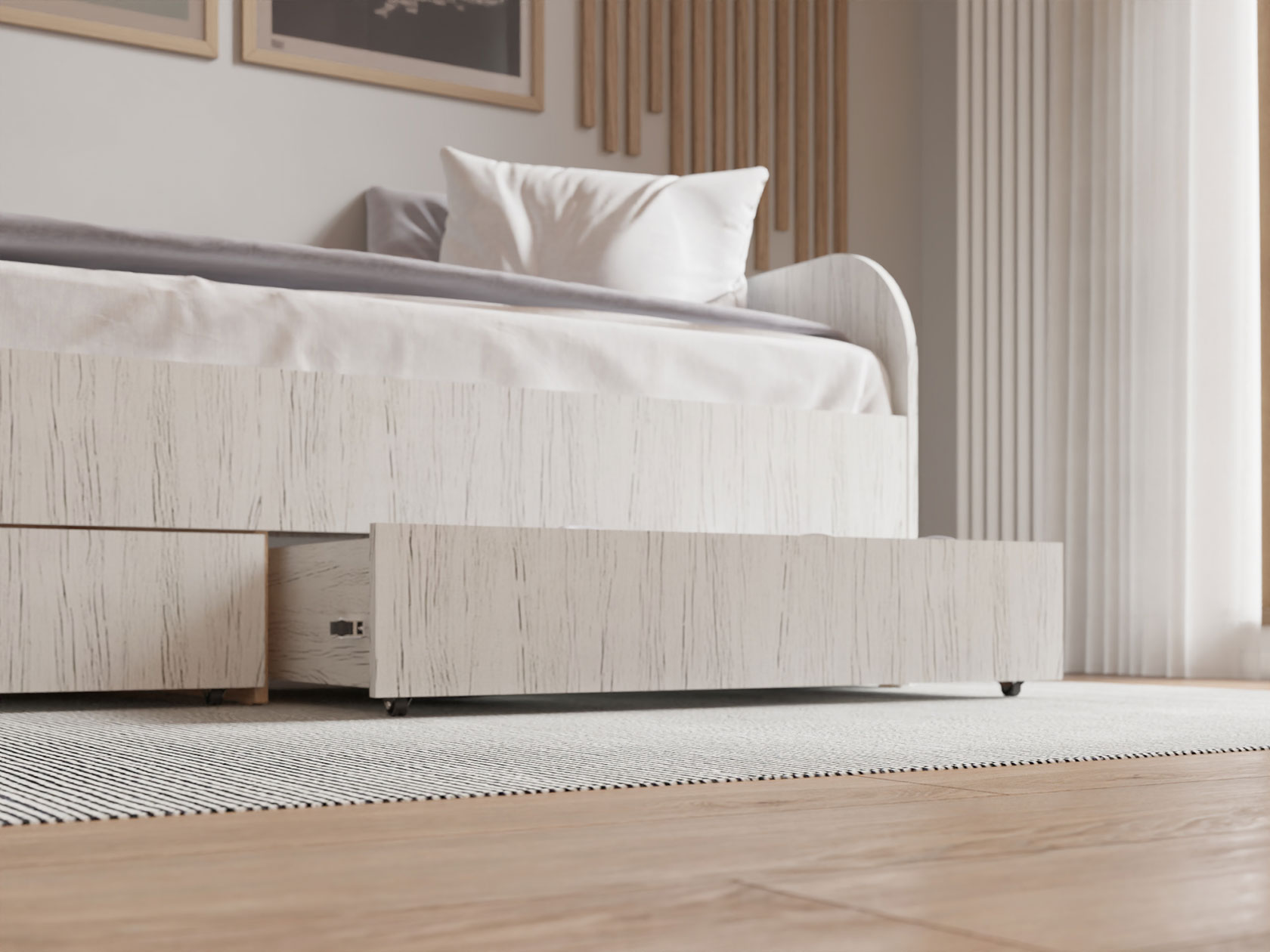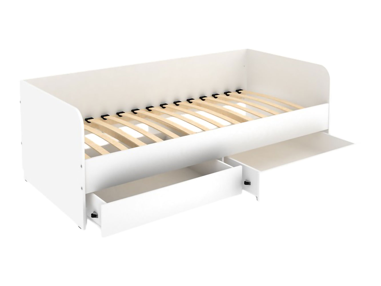 Привлекательная своей простотой кровать Мерлен — практичное решение для гостевой комнаты, детской или студии. Днем модель послужит уютным местом для отдыха, а на время сна заменит полноценную кровать. Основание с ламелями обеспечивает комфортную опору для матраса, а выдвижные ящики создают дополнительное пространство для хранения.