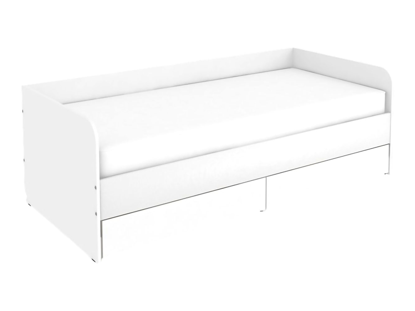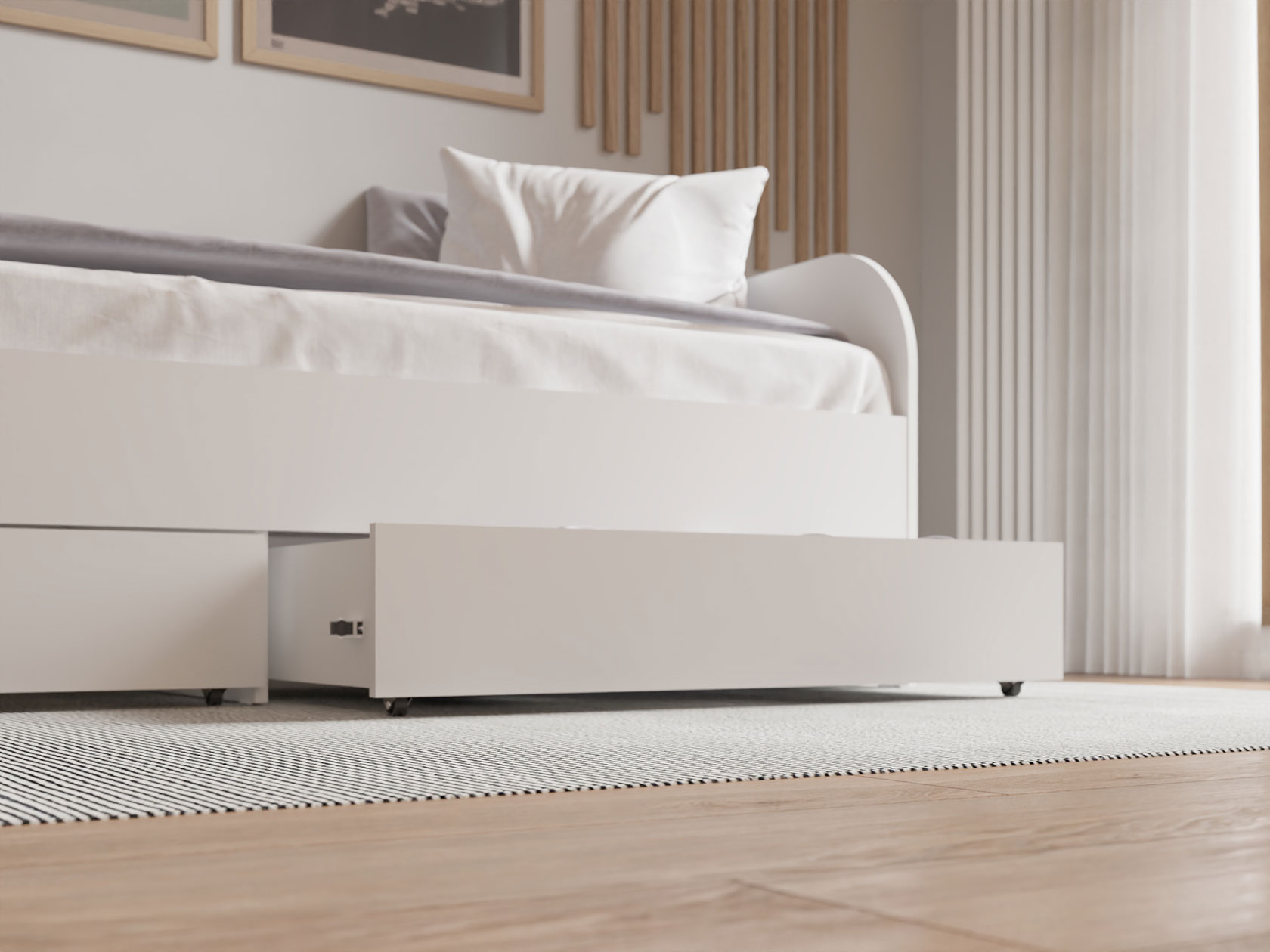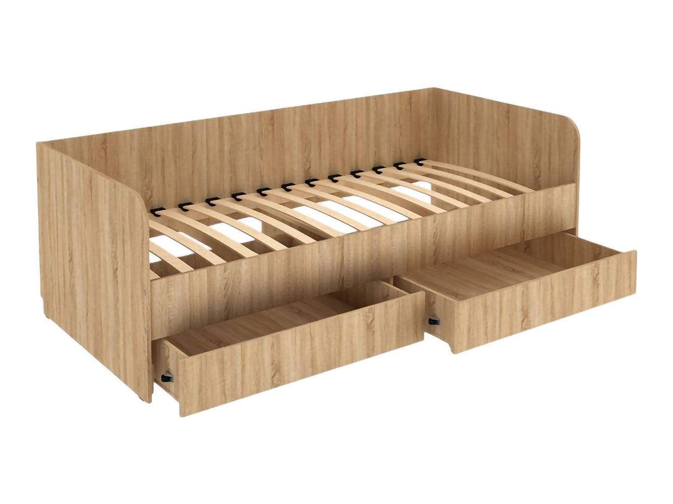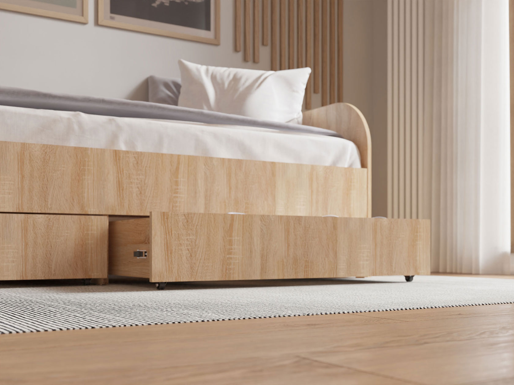 Привлекательная своей простотой кровать Мерлен — практичное решение для гостевой комнаты, детской или студии. Днем модель послужит уютным местом для отдыха, а на время сна заменит полноценную кровать. Основание с ламелями обеспечивает комфортную опору для матраса, а выдвижные ящики создают дополнительное пространство для хранения.