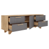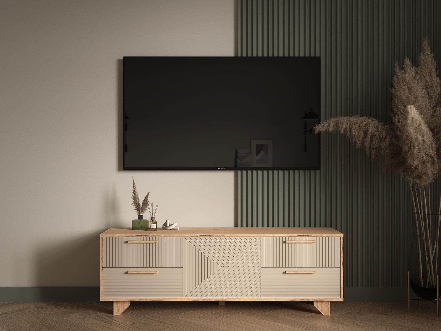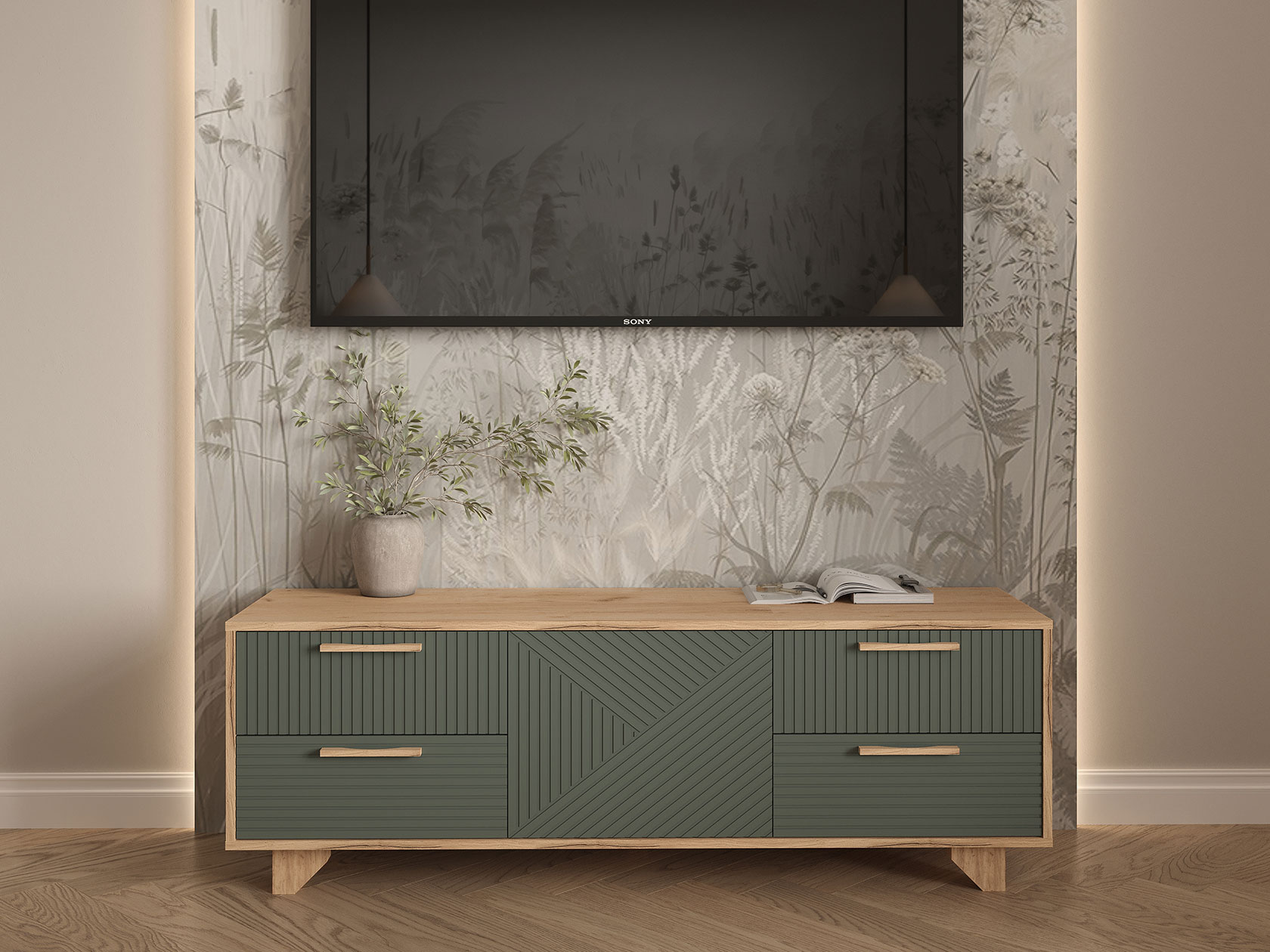 ТВ-тумба Ньерд поможет разместить необходимую технику и создать комфортный уголок для просмотра любимых фильмов. Сочетание выдвижных ящиков и ниш за глухой дверцей создает привлекательный облик мебели и позволяет удобно хранить сопутствующие мелочи. Фрезеровка на фасадах добавляет интерьеру интересные акценты.