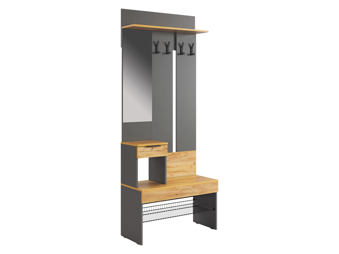 Прихожая Баско Трио — практичный набор мебели, который создаст единую систему хранения для предметов гардероба, обуви, сумок и аксессуаров. Распашной шкаф дополнен антресольными секциями, чтобы удобно разместить вещи, которые не требуются каждый день. Строгий дизайн легко станет частью современного интерьера.