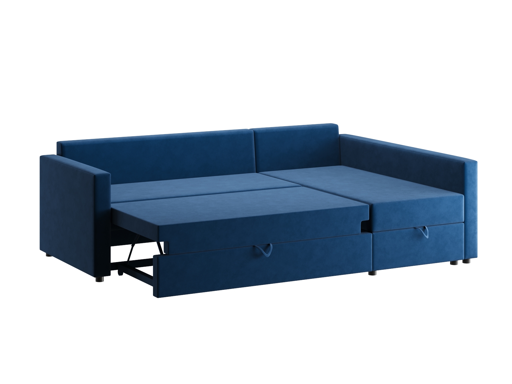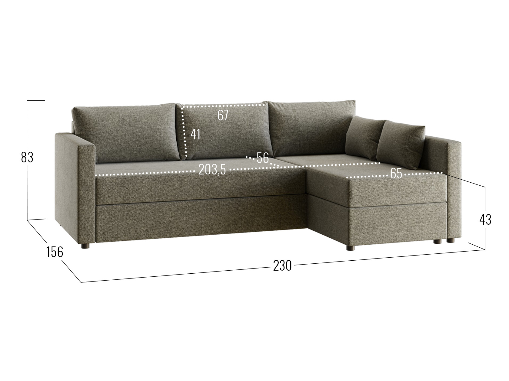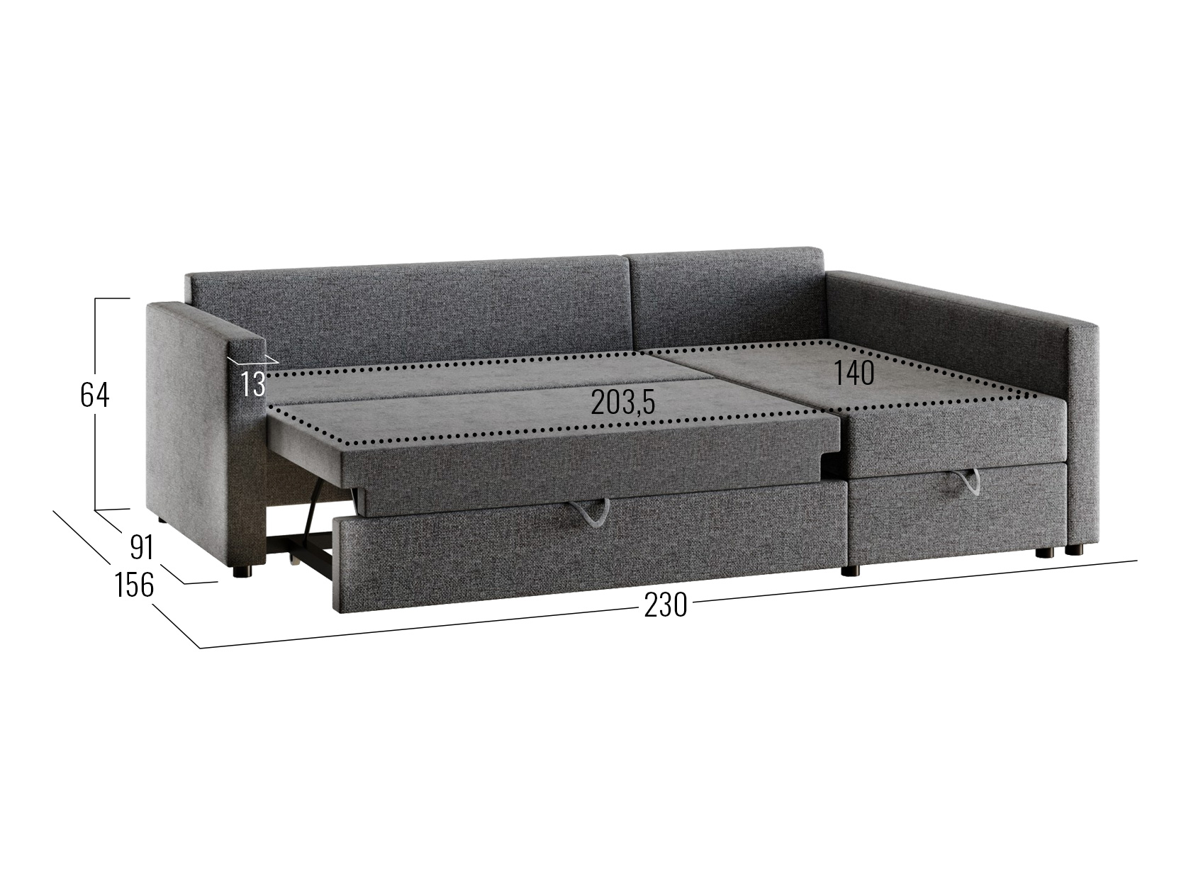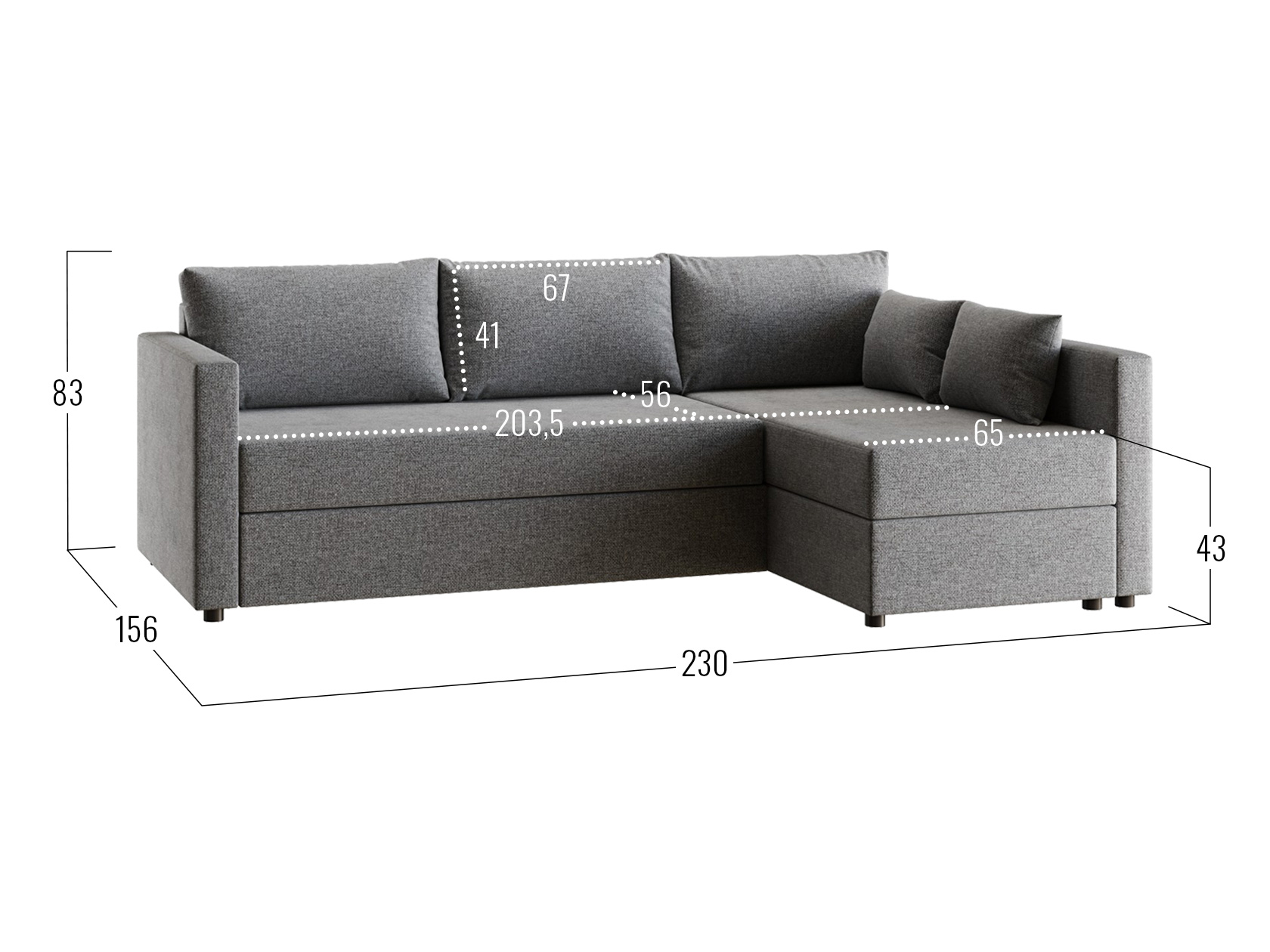 Диван без лишних усилий превращается в ровное спальное место, при этом удлиненный подлокотник делает его еще комфортнее. Небольшой бельевой короб — практичное дополнение модели. Угол можно установить с любой стороны, что позволяет адаптировать диван к любой планировке.