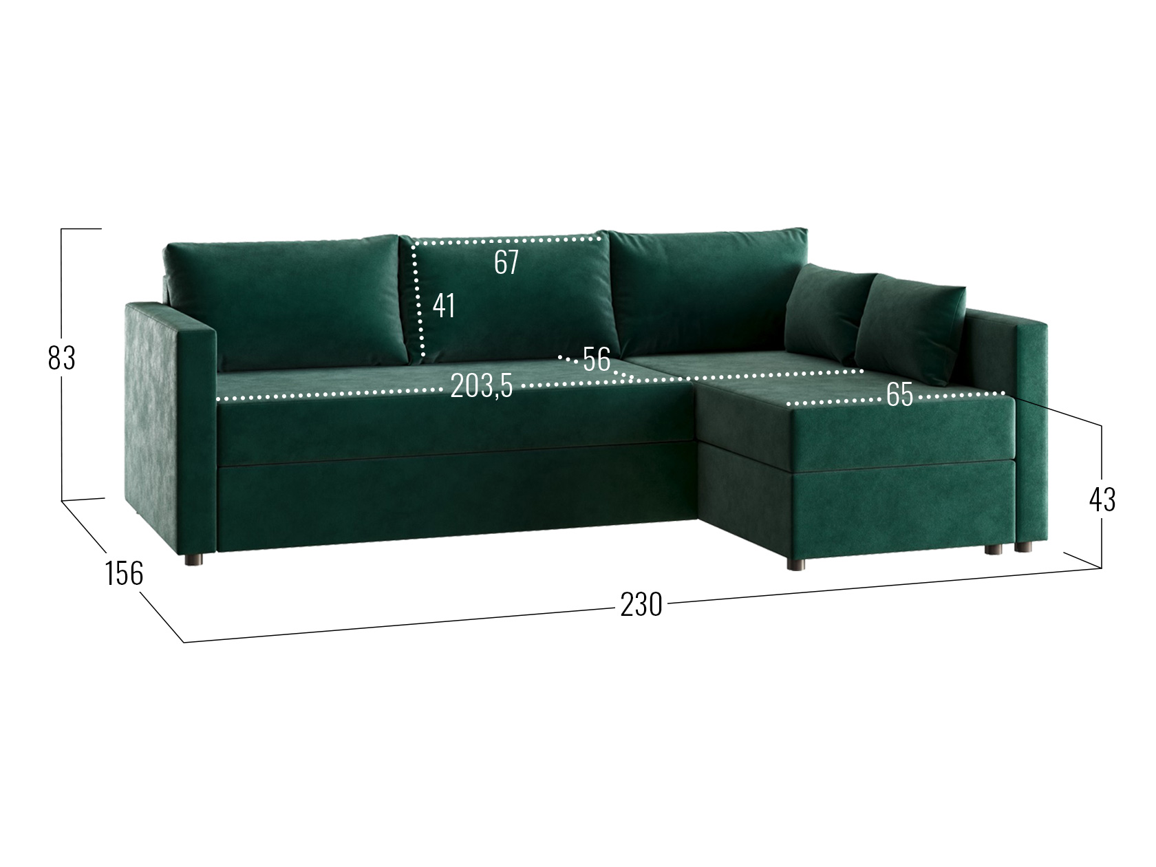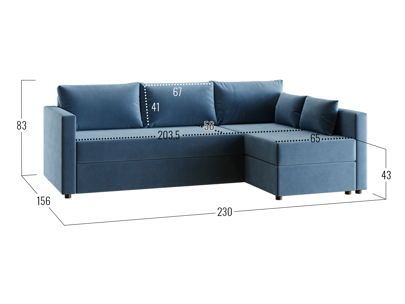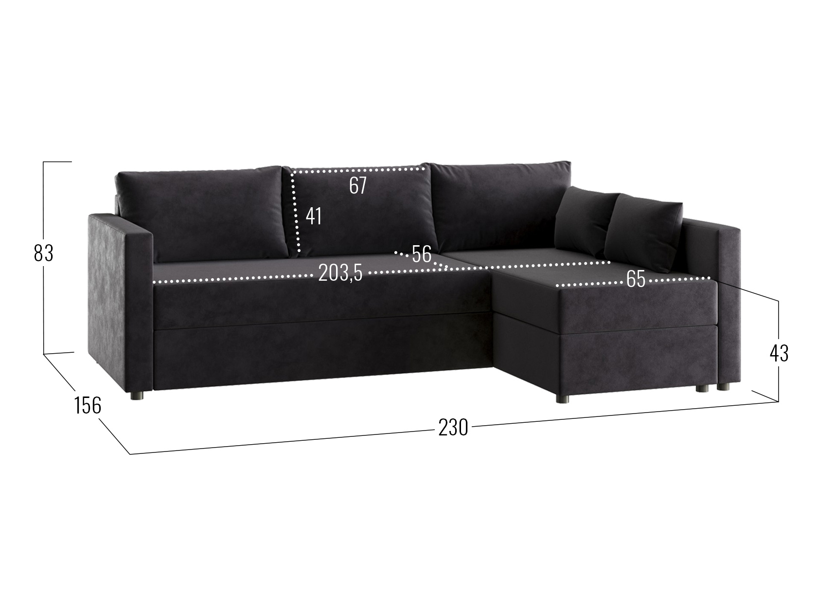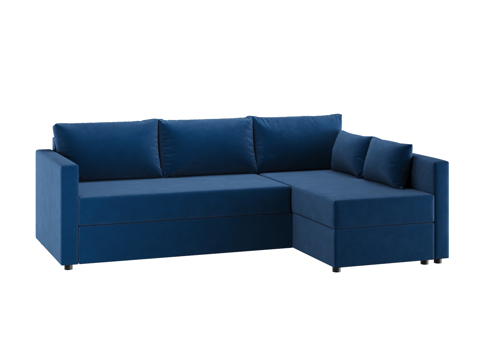 Диван без лишних усилий превращается в ровное спальное место, при этом удлиненный подлокотник делает его еще комфортнее. Небольшой бельевой короб — практичное дополнение модели. Угол можно установить с любой стороны, что позволяет адаптировать диван к любой планировке.