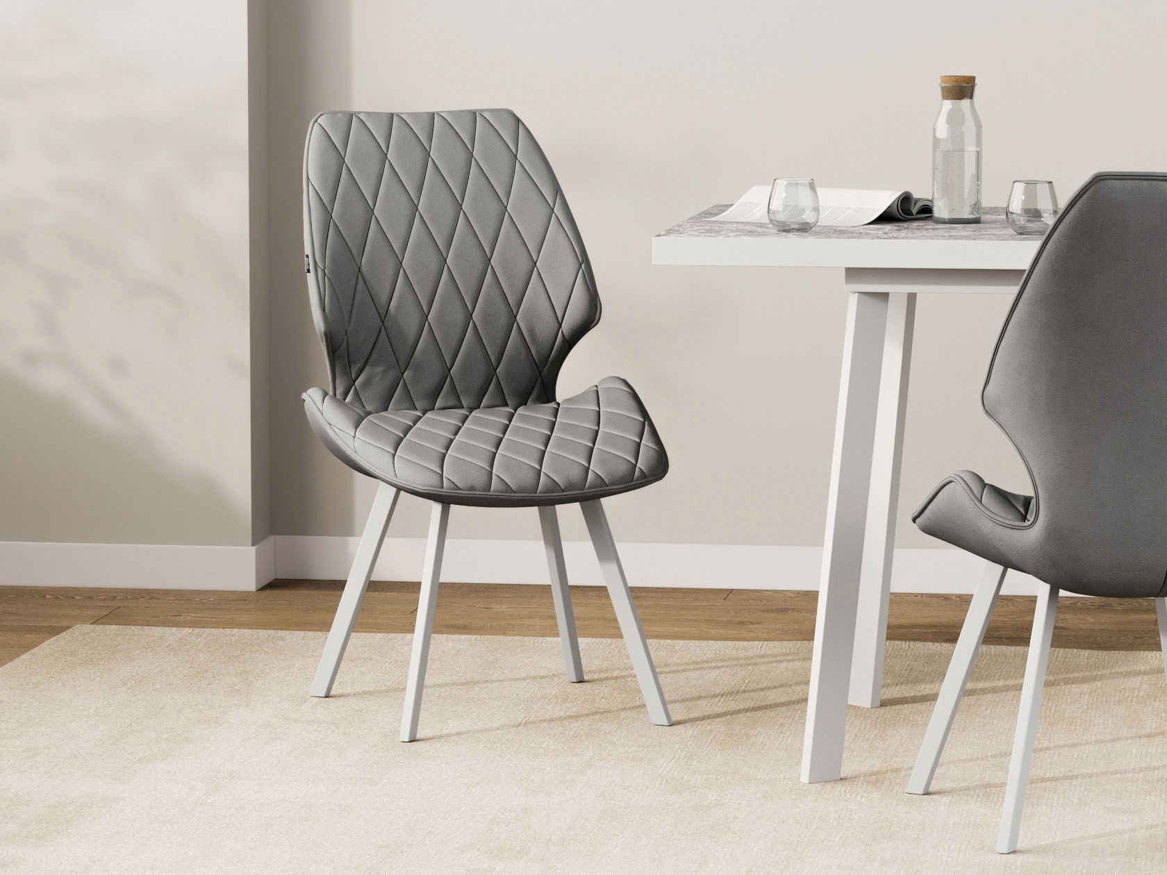 Стул Эндрю привлекает необычной формой спинки и сиденья, а также приятной на ощупь обивкой. Каркас и устойчивые опоры — металлические, что делает стул более долговечным. Стежка в виде ромбов выполняет не только декоративную функцию, но и защищает ткань от растяжения.