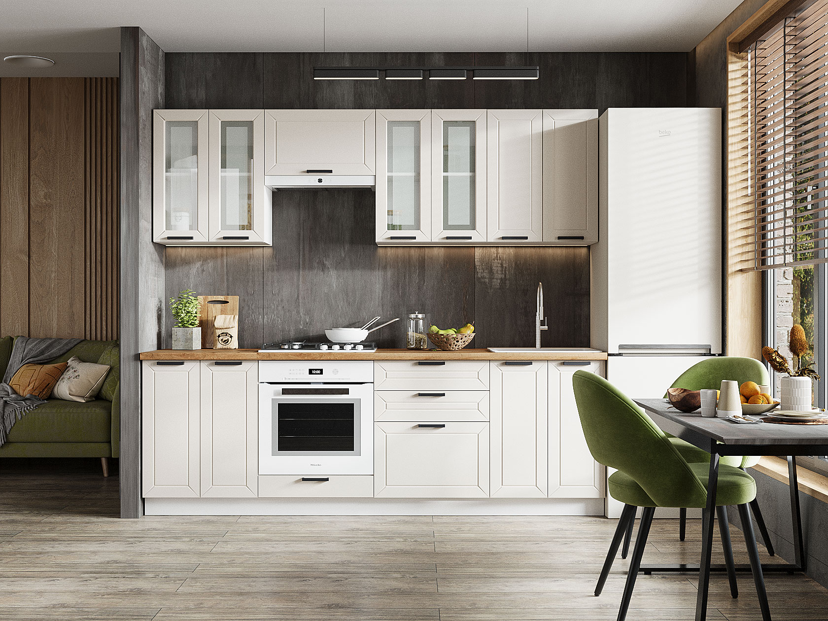 Кухонный гарнитур Оптима 240 см — практичное решение для небольшой квартиры. Мебель удобно разместит посуду, различную утварь, продукты и специи. Фасады украшены рамочной фрезеровкой и лаконичными ручками. Такой дизайн отлично сочетается с разными интерьерными стилями.