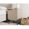 Прикроватная тумба Волкер — незаменимая модель для спальни. Внутреннее пространство разделено горизонтальной полкой. Две равные секции подходят для хранения книг, зарядки от телефона и очков. Необычная фрезеровка на фасаде и шероховатая текстура дерева — изюминка дизайна, которая создает уютные акценты.