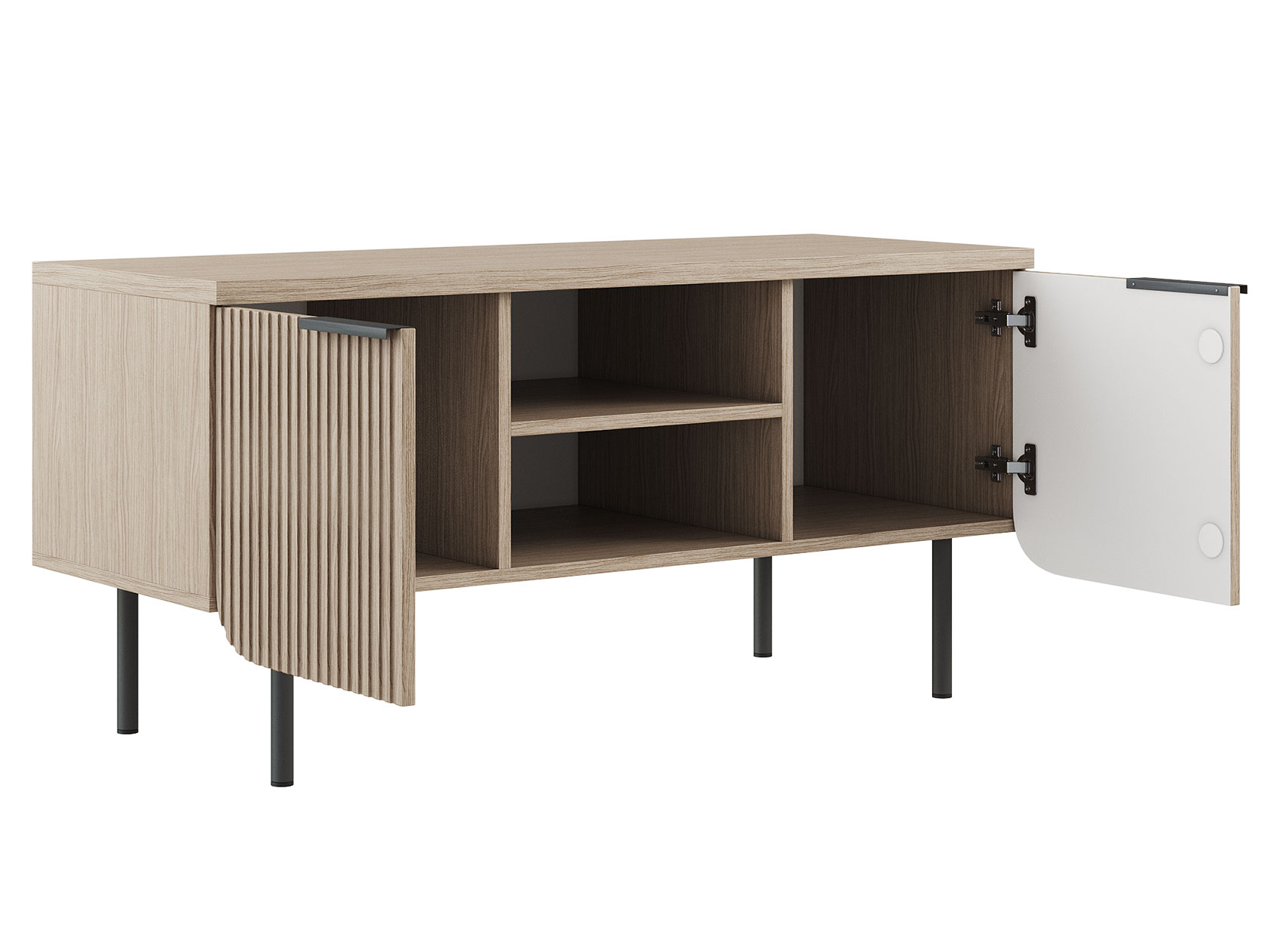 ТВ-тумба Волкер с нишей подойдет для размещения монитора с большой диагональю и других мультимедийных устройств. Боковые отделения с дверцами и открытые секции по центру помогут поддерживать порядок в комнате. Вертикальная фрезеровка служит стильным декором, а древесный оттенок добавляет оформлению уютный акцент.
