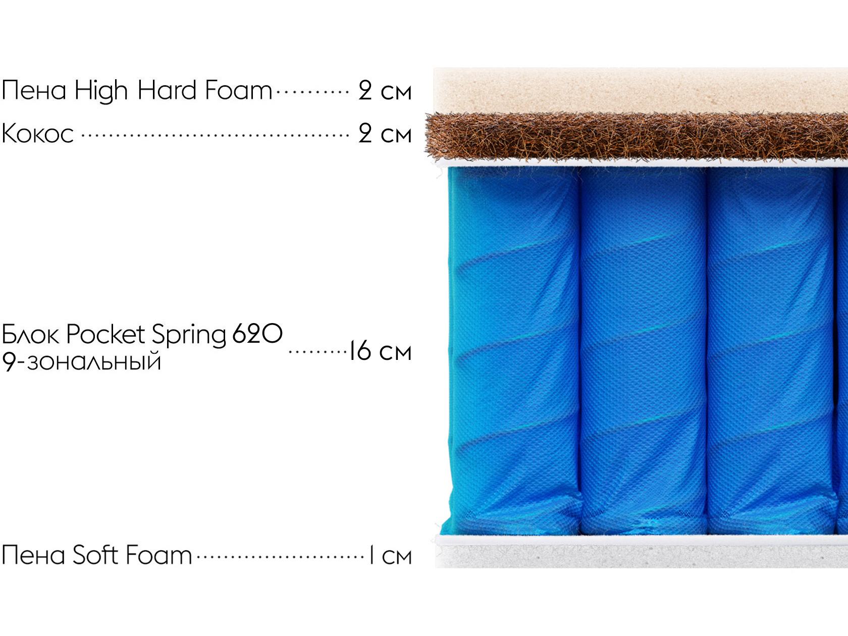 Пружинный матрас Status Ultra SX 24 — один из самых жестких в линейке. Мультизональный пружинный блок Pocket Spring 620 точечно подстраивается под вес человека, сохраняет правильное положение позвоночника и снимает напряжение с проблемных зон. Верхняя сторона дополнена упругой пеной High Hard Foam и слоем кокоса, а нижняя — «умной» пеной Soft Foam. Такое сочетание наполнителей защищает матрас от деформации, делает его особенно прочным и долговечным, а также исключает эффект «гамака».