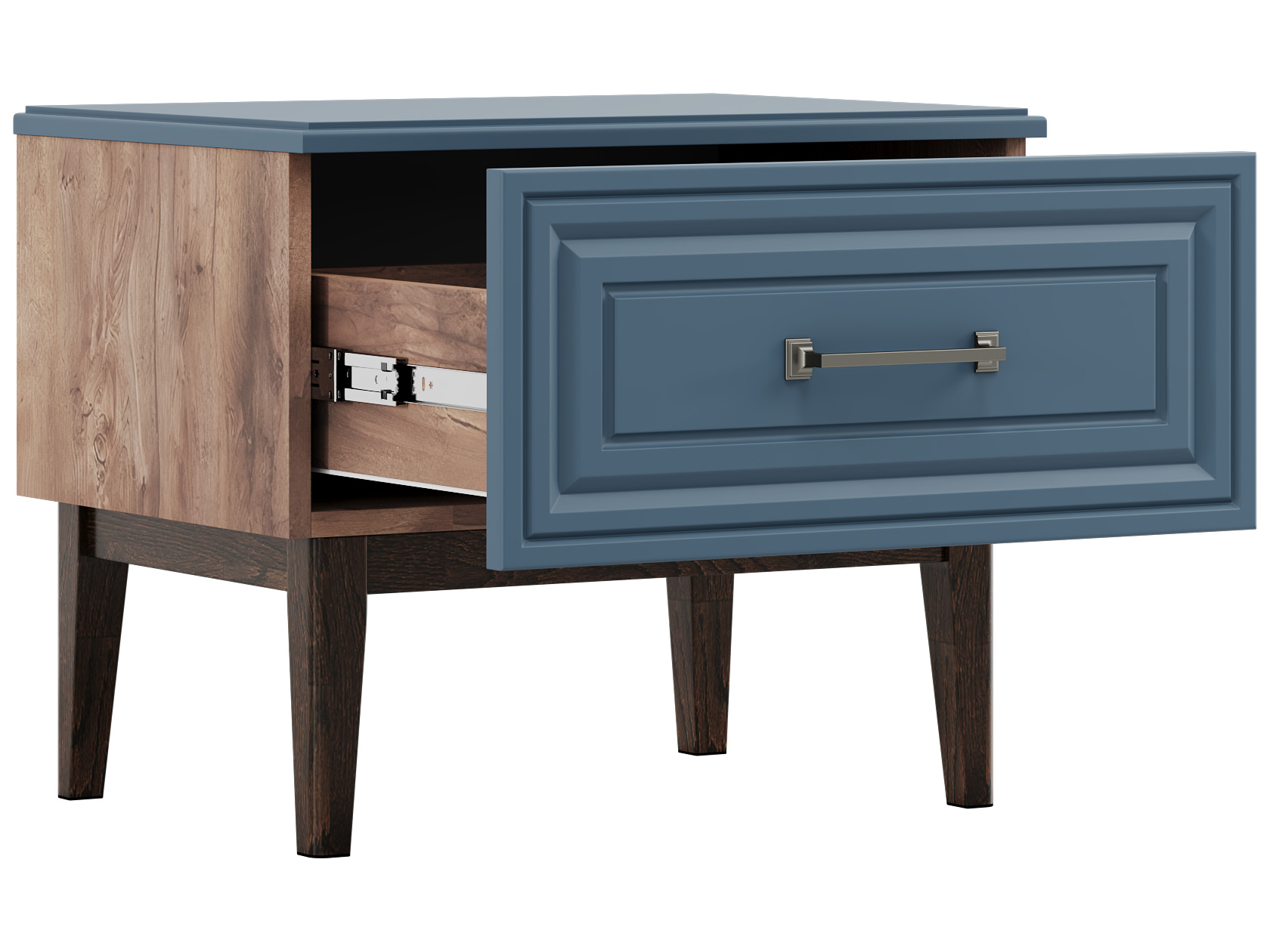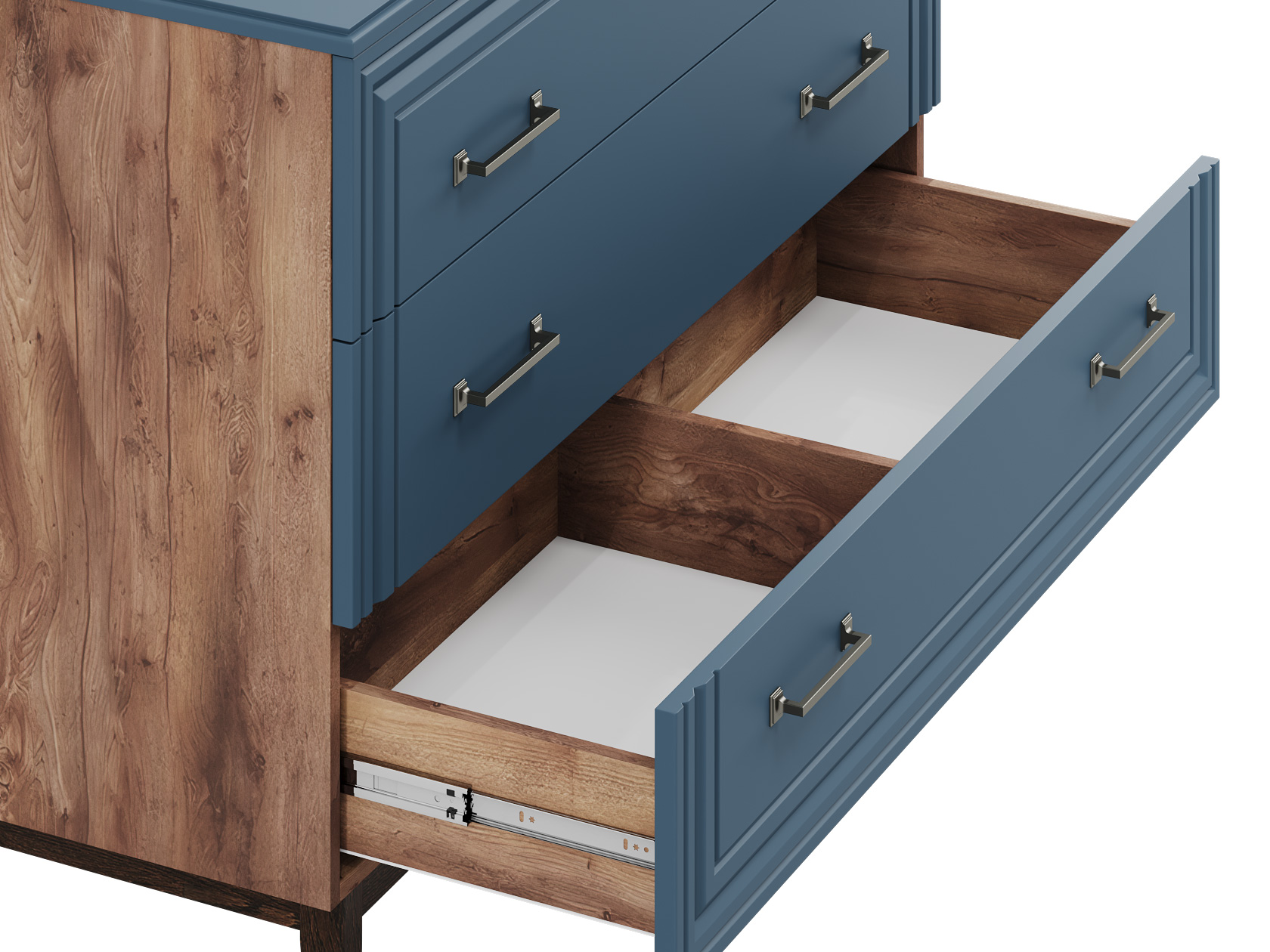 Преимущество данной коллекции — крашеные МДФ-фасады, покрытые матовым лаком. Они отличаются прочностью, экологичностью и уникальным внешним видом благодаря глубокому проникновению краски в структуру плиты. Матовая текстура без «пальчикового» эффекта придает мебели особую эстетику, а также обеспечивает легкий уход и долговечность.