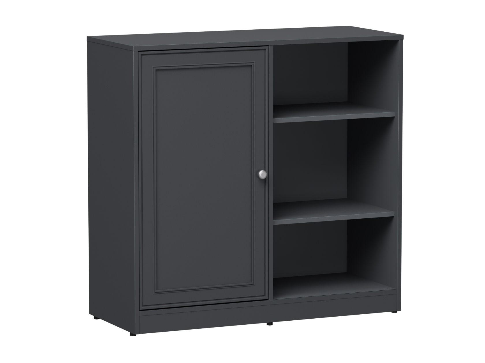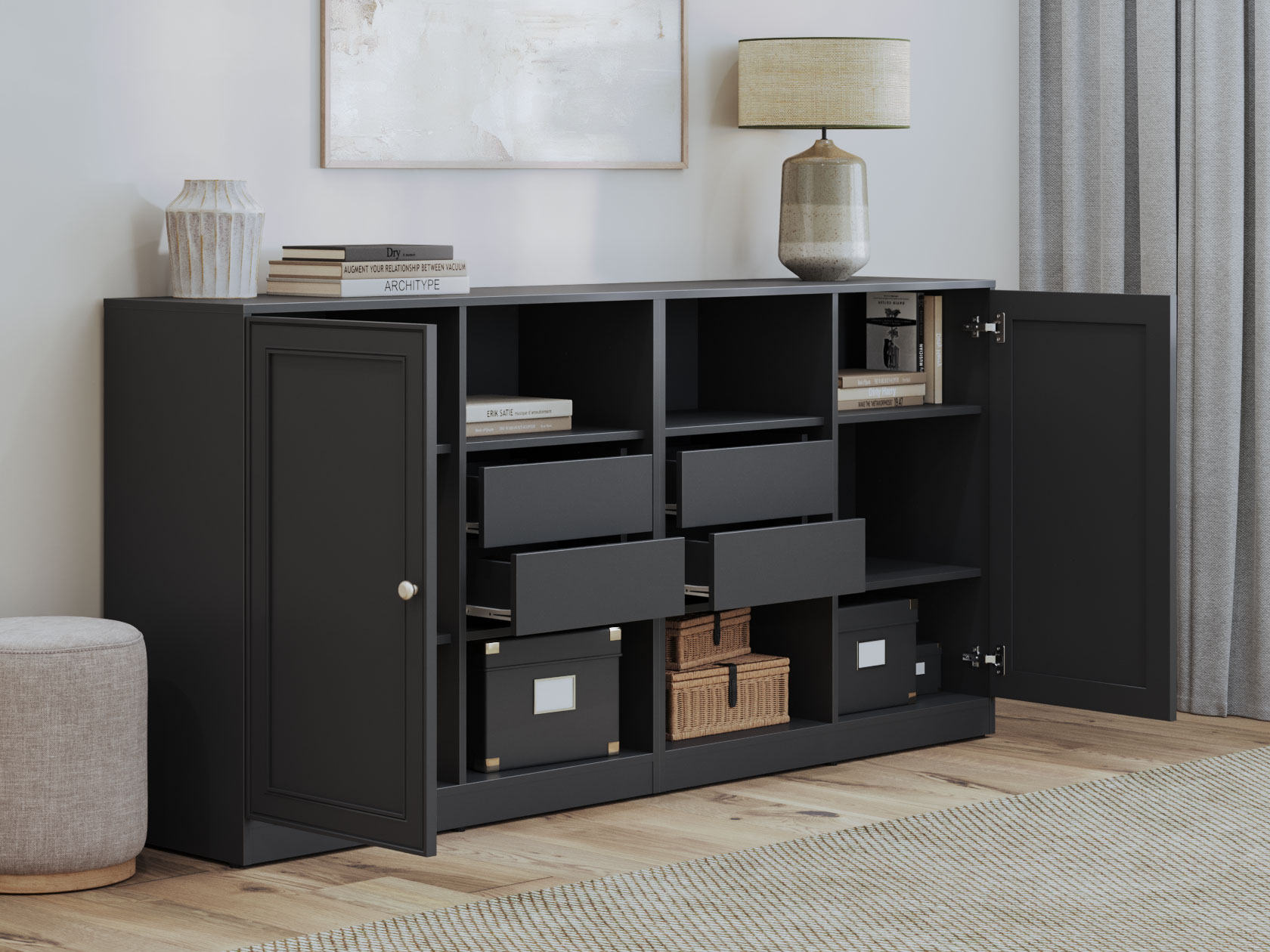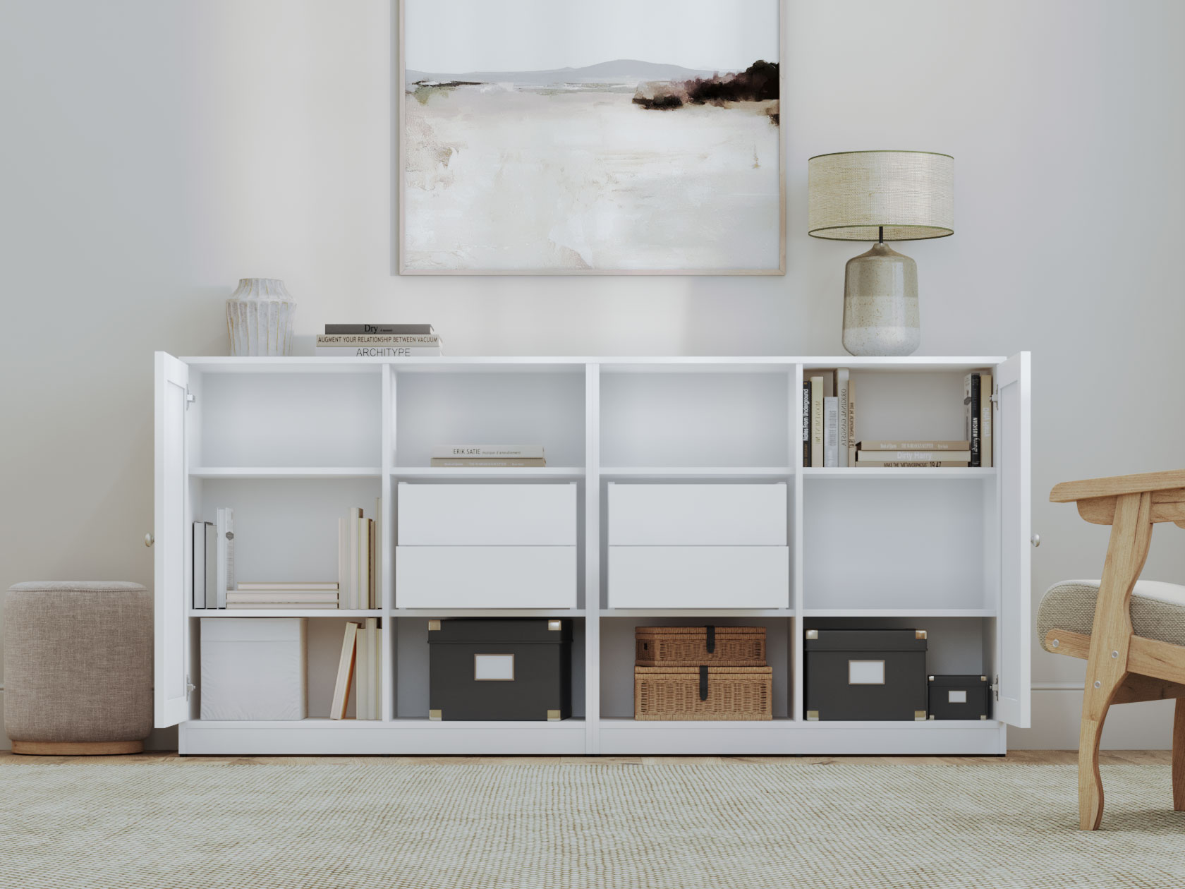 Гостиная Люси Мини с ящиками поможет эстетично хранить домашнюю библиотеку, декор и личные вещи. Дверцы защищают содержимое от пыли и солнца, а открытые ниши создают ощущение свободного пространства, не загромождая интерьер. Рамочные фасады гармонично сочетаются с разными стилями меблировки.