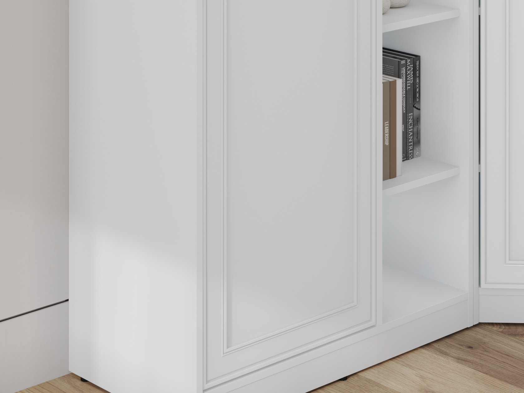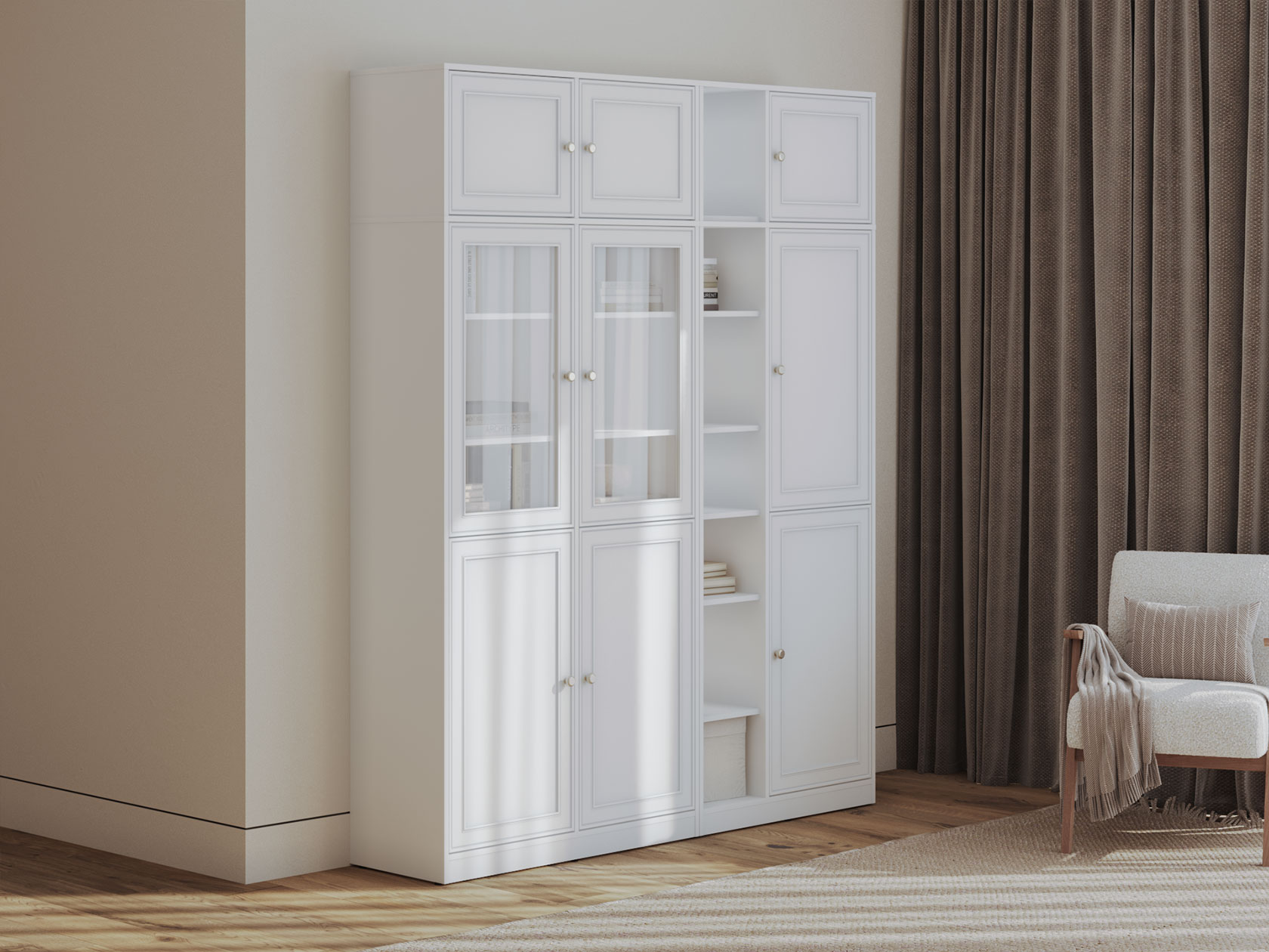 Гостиная Люси с нишей объединила всё необходимое для практичного хранения домашней библиотеки, декора и красивой посуды. Мебель позволяет как продемонстрировать содержимое на открытых полках и за витринами, так и скрыть часть личных вещей за глухими фасадами.