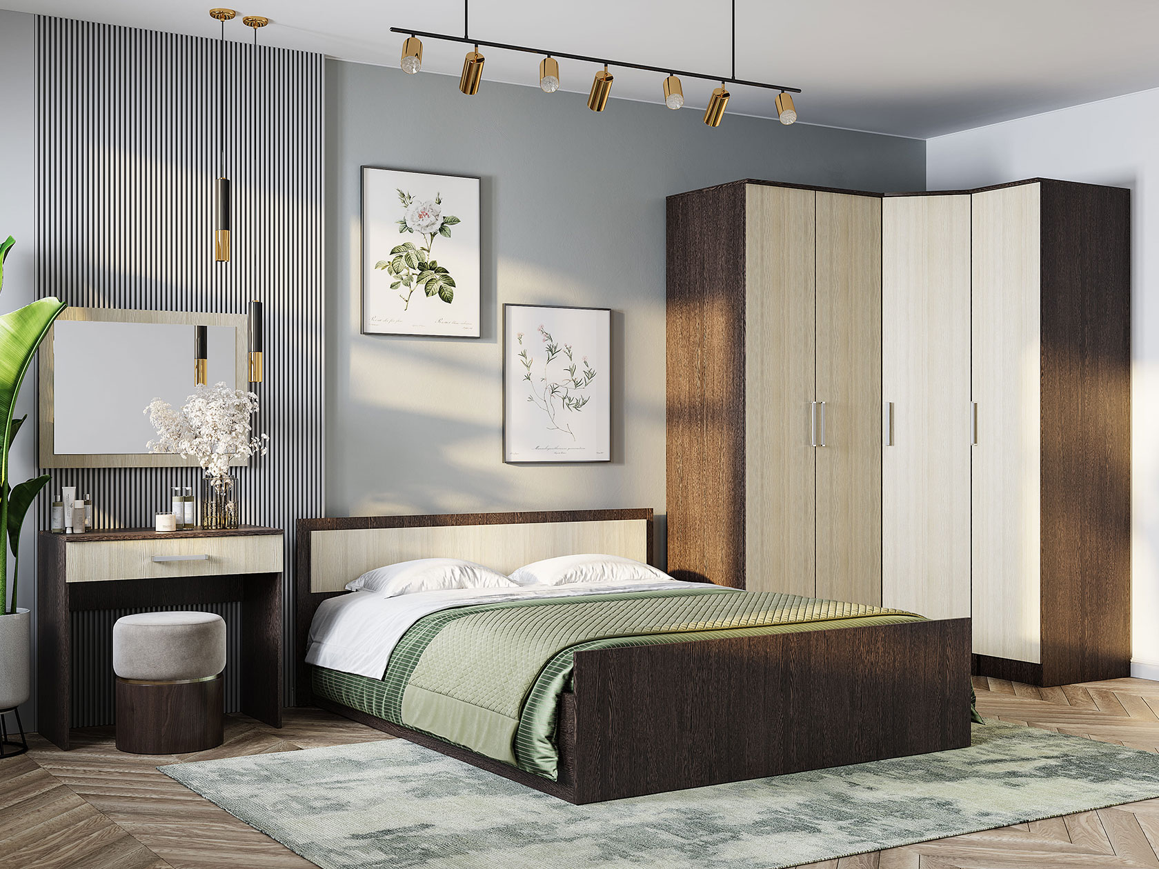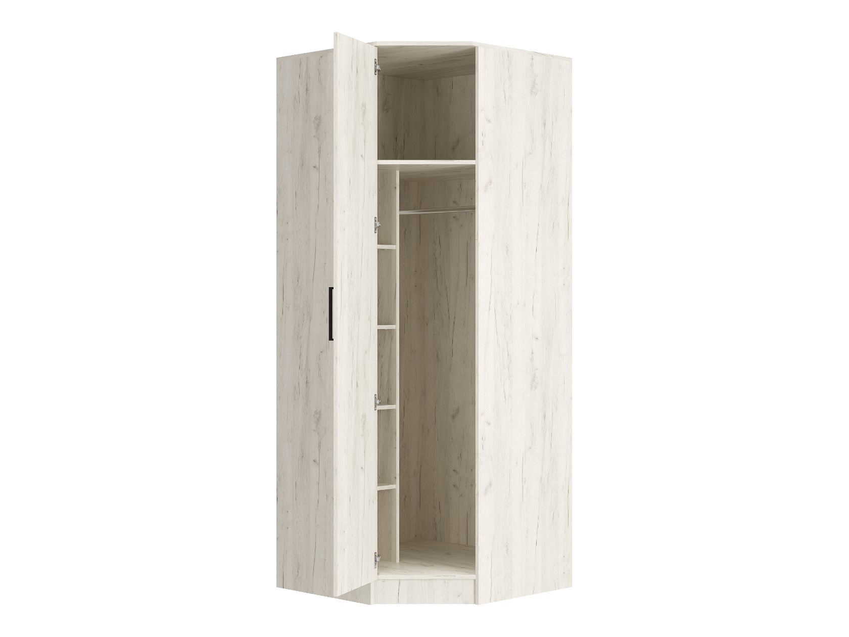 Угловой шкаф Фиеста станет полноценной системой хранения всех предметов гардероба, аксессуаров и всевозможных мелочей. Благодаря особенностям конструкции модель не занимает много места. За глухой распашной дверцей скрывается просторное и разнообразное наполнение — штанга для плечиков, открытые ниши, а также глубокая антресольная полка.