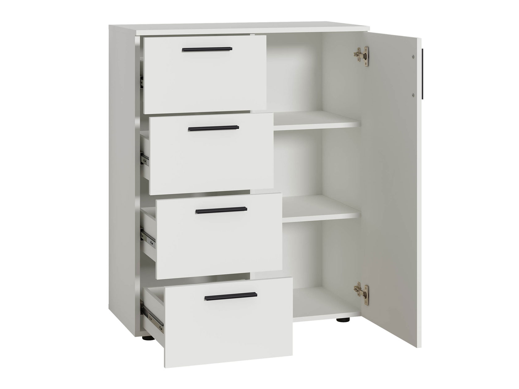 Комод Эйр удачно дополнит интерьер гостиной. Вместительная модель организует удобное хранение белья, одежды и сопутствующих аксессуаров. Ящики с плавным бесшумным ходом выдвигаются на всю глубину, обеспечивая доступ к содержимому. За распашной дверцей находятся полки, которые подходят для текстиля и личных вещей. На поверхности можно поставить лампу, рамки с памятными фотографиями или живые растения.