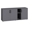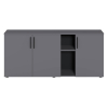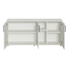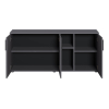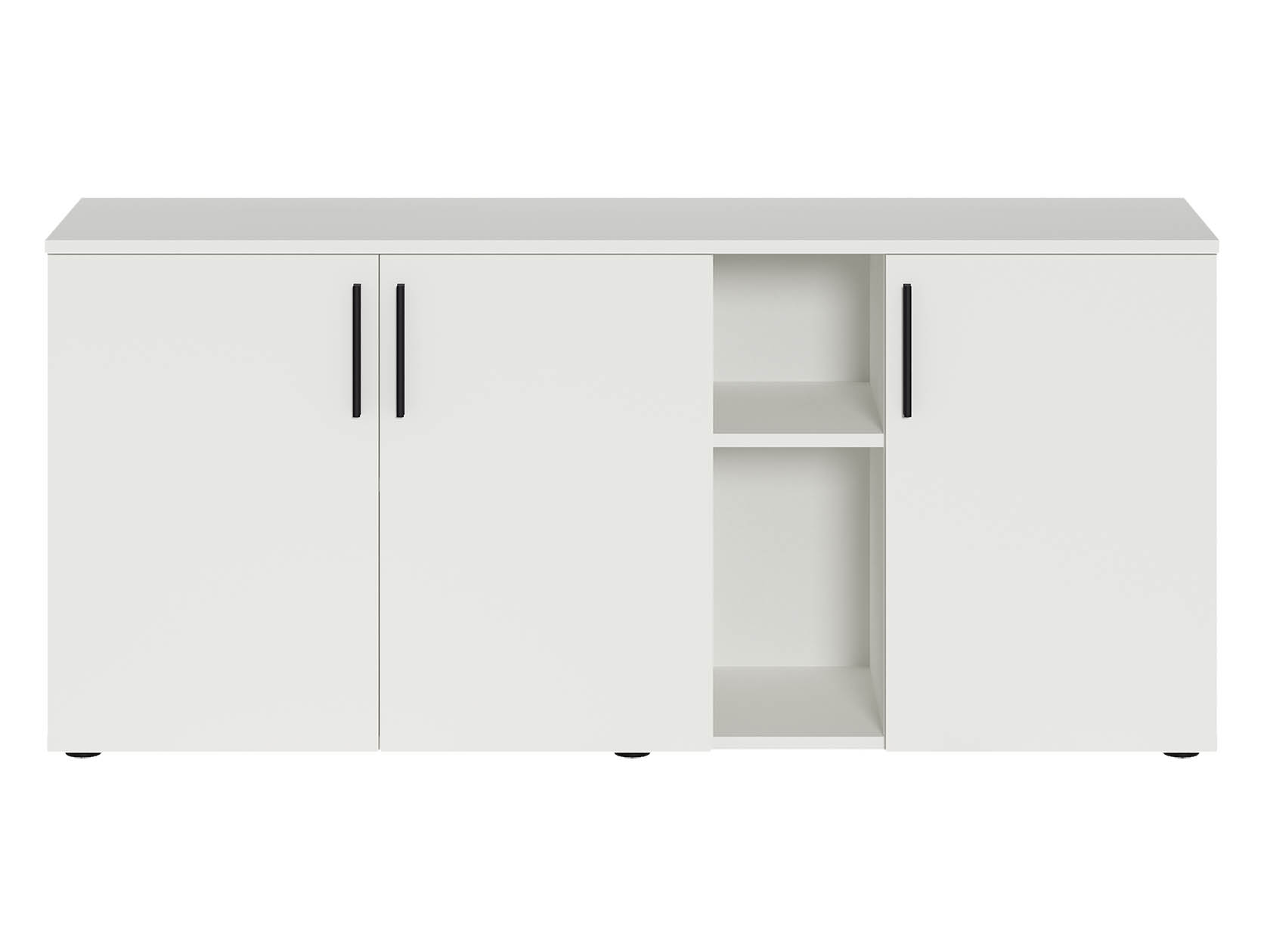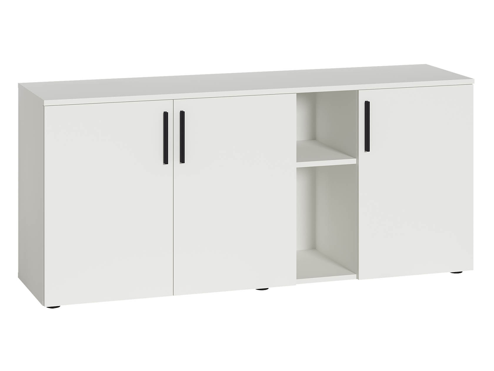 ТВ-тумба Эйр — практичное решение для широкоформатного телевизора, мультимедиа-техники и сопутствующих аксессуаров. За глухими дверцами скрыто два отделения с полкой, где удобно хранить документы, печатную продукцию, а в открытой нише по центру можно найти место для элементов декора. Гладкие фасады дополнены вертикальными ручками, которые подчеркивают строгую геометрию.