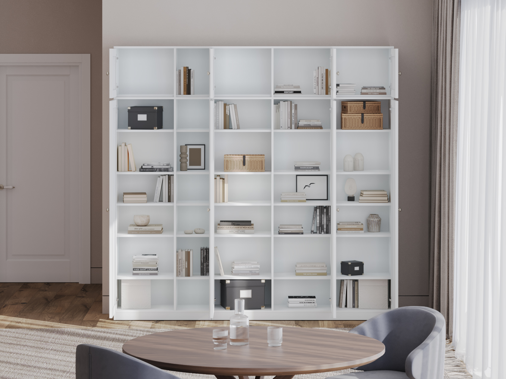 Гостиная Люси Классик поможет поддерживать порядок благодаря продуманным решениям для хранения. Открытая ниша по центру позволяет разместить на виду книги, посуду и декор. Распашные шкафы создают удобство при распределении предметов обихода. Изящные рамочные фасады дополнены лаконичными круглыми ручками, что уместно выглядит в любом интерьере.