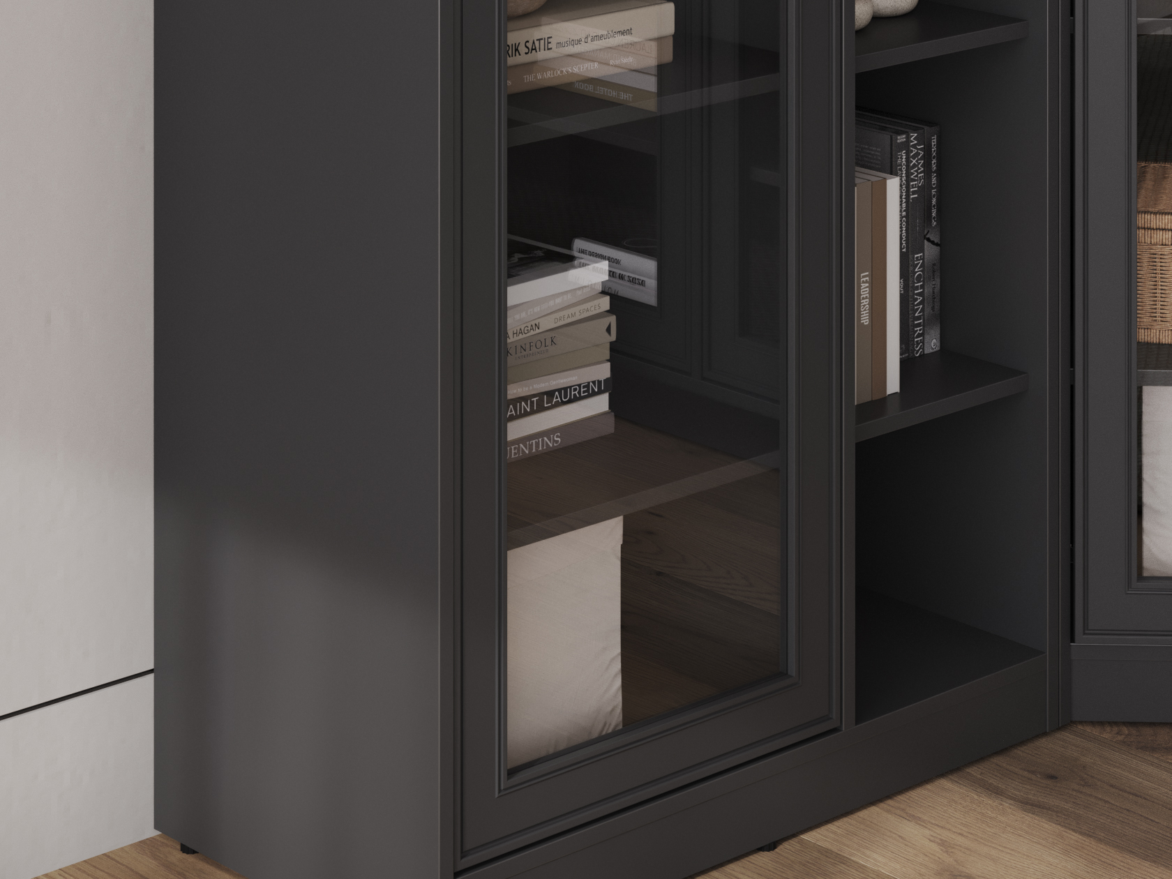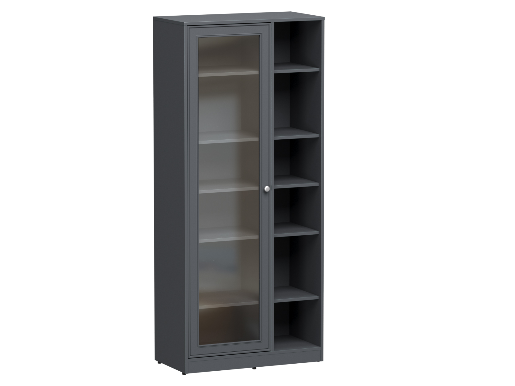 Угловая гостиная Люси с витринами станет полноценной системой хранения для просторной комнаты или офисного пространства. Угловая конструкция включает эстетичные стеклянные дверцы, открытые ниши и антресольные шкафы, чтобы с комфортом разместить самые разные вещи. Элегантные рамочные фасады с ручками-кнопками создают уютную обстановку.