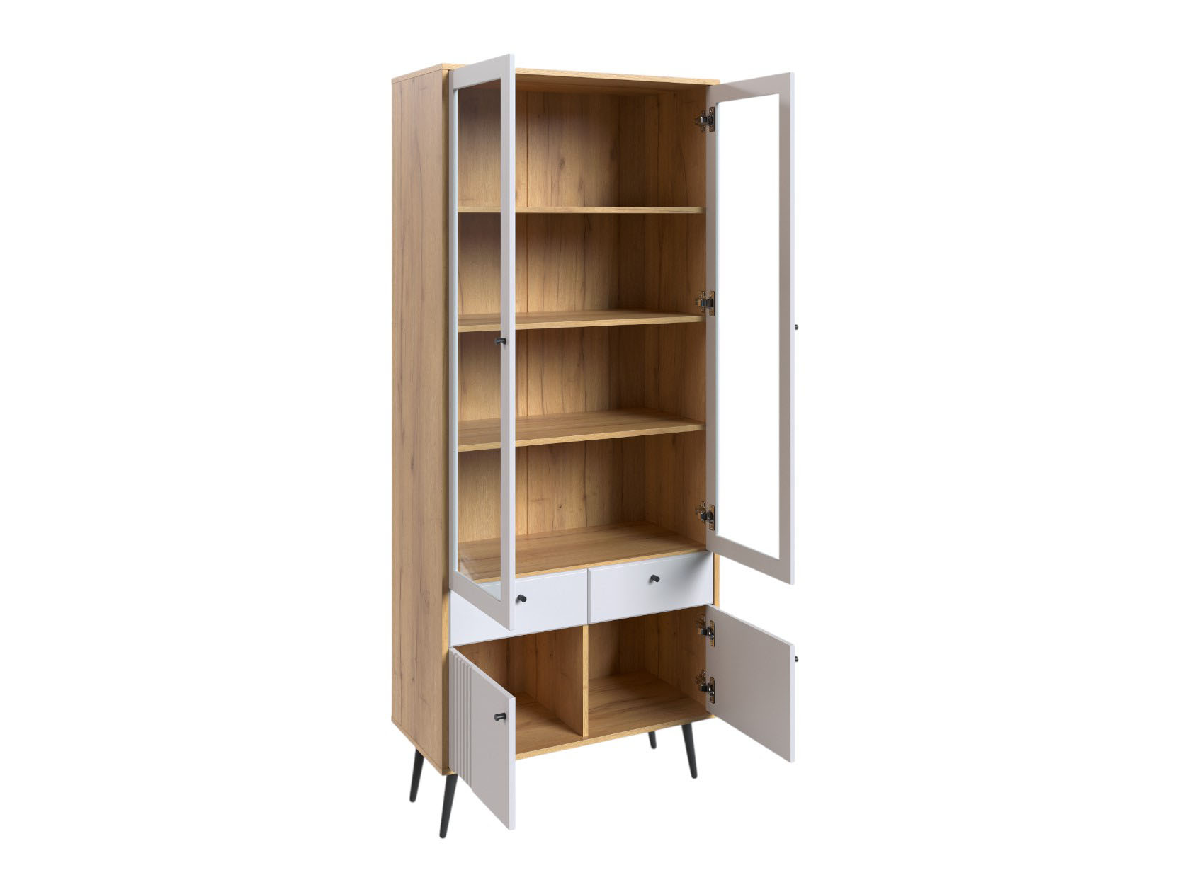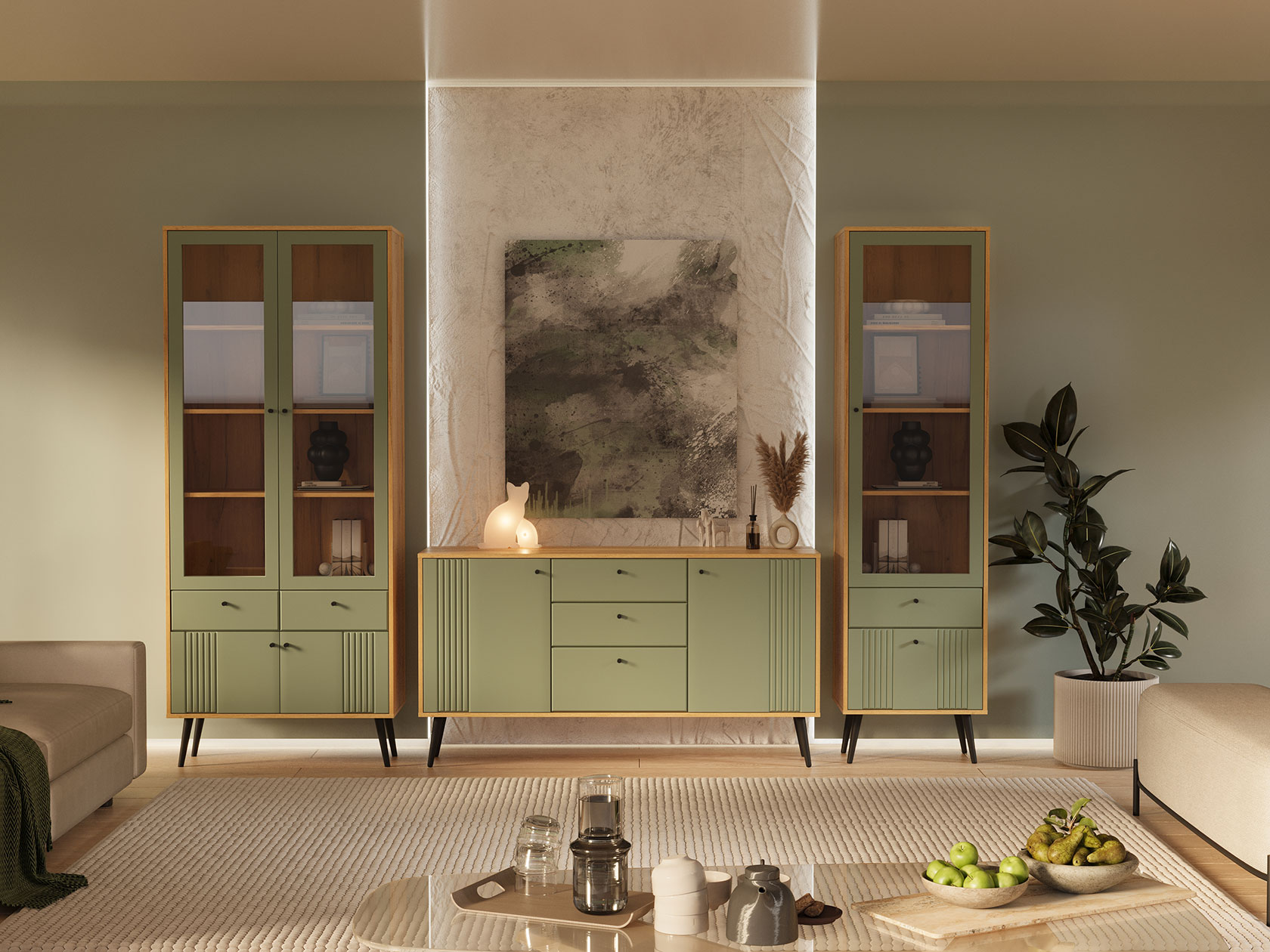 Гостиная Вега Саксония с комодом поможет красиво оформить домашнюю библиотеку и продемонстрировать ценные издания книг. Шкафы-витрины подходят для изящного хранения: стекло оберегает содержимое от пыли, а фасады с фрезеровкой и аккуратная фурнитура подчеркивают элегантный облик мебели.