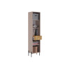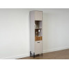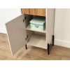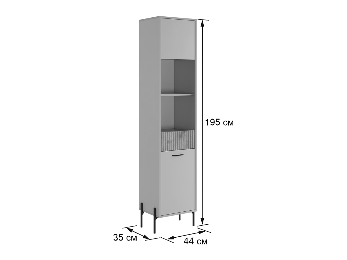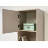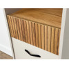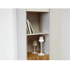 Стеллаж Доминика — функциональное решение для хранения. Конструкция объединила открытые ниши, полки за распашными дверцами и выдвижной ящик, что позволяет упорядочить всё необходимое. Фактура дерева в отделке добавляет интерьеру нотки теплоты и природную гармонию, а высокие ножки визуально облегчают облик мебели.