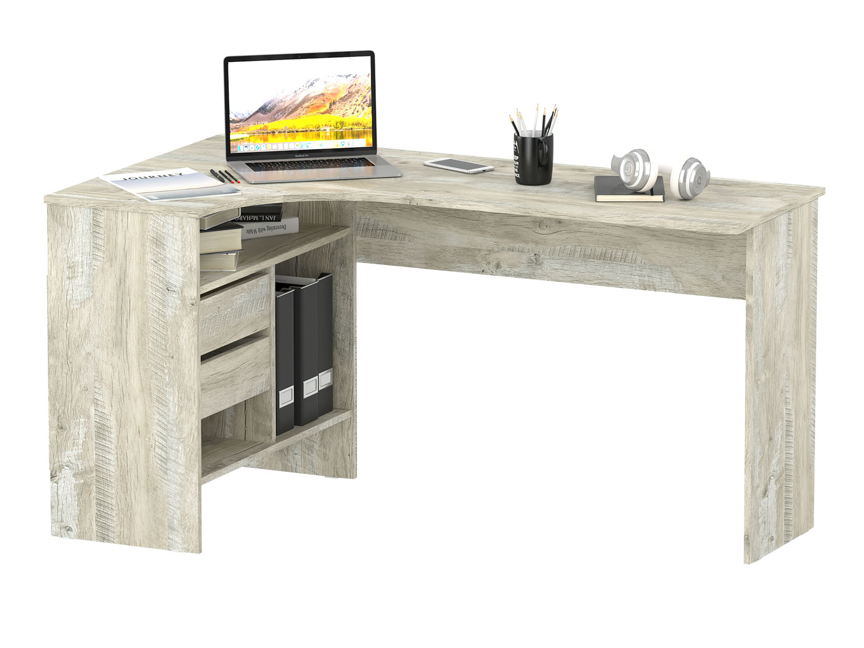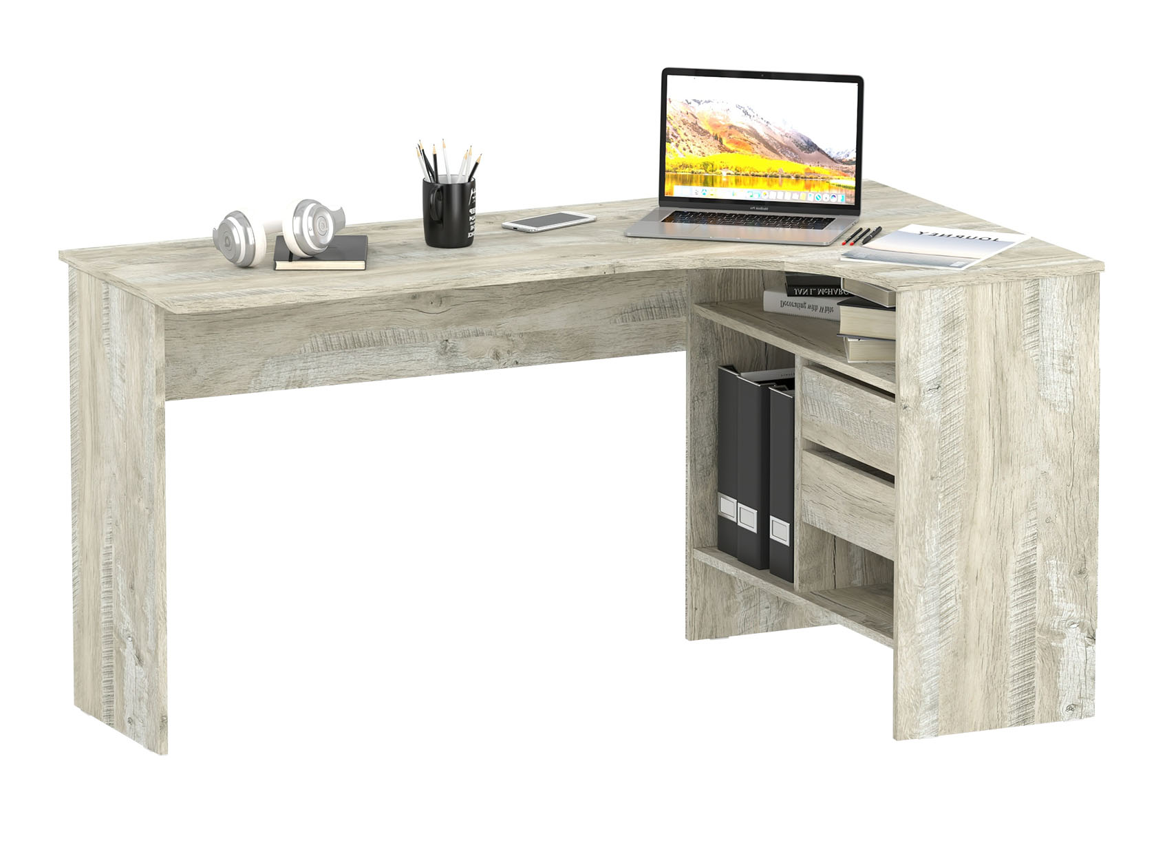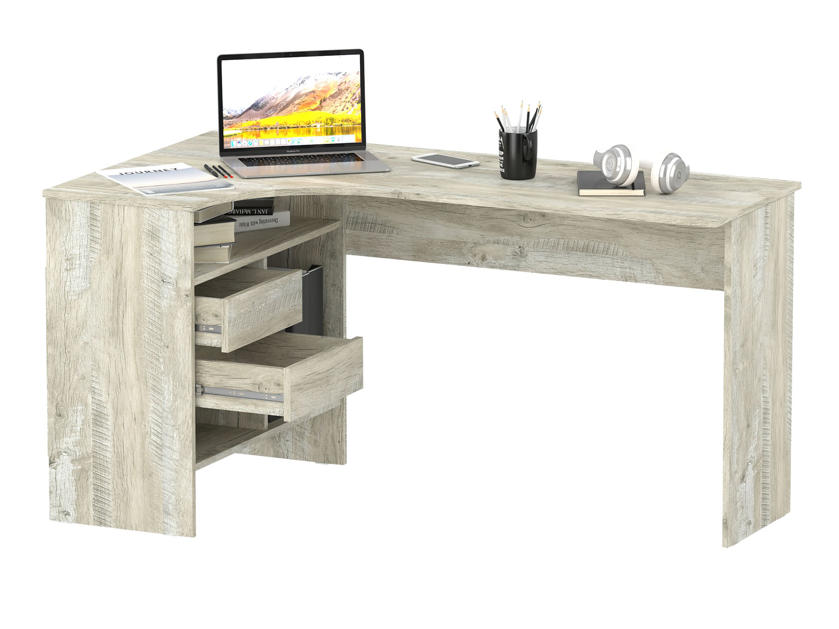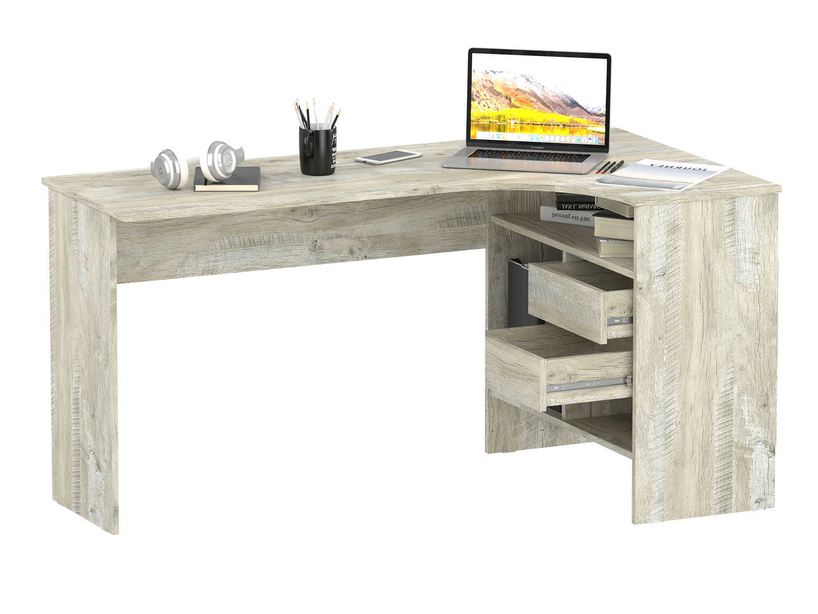 Угловой письменный стол Шепард — идеальное решение для обустройства полноценного рабочего места в домашнем кабинете или офисе. На широкой столешнице найдется место для большого монитора, клавиатуры или ноутбука, а также сопутствующей техники. В выдвижных ящиках и открытых отделениях удобно хранить книги и канцелярию.