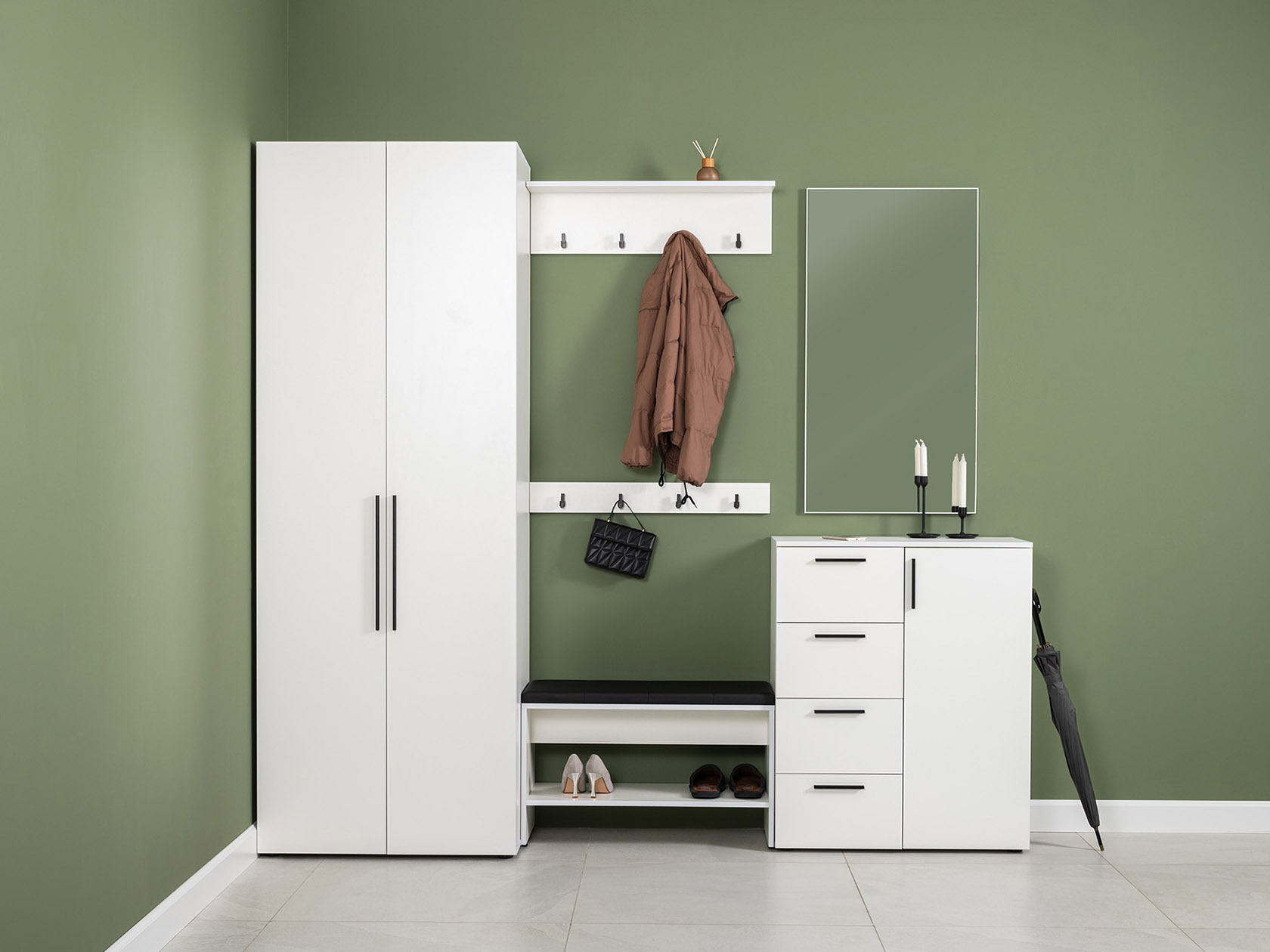Распашной шкаф Эйр организует порядок в вещах и станет аккуратным дополнением интерьера прихожей. Модель оснащена удобной штангой и двумя нишами для хранения одежды и аксессуаров. Матовые фасады с вертикальными ручками смотрятся стильно и не перегружают обстановку нарочитыми деталями. Демпферы помогают избежать резких звуков при закрывании дверей.