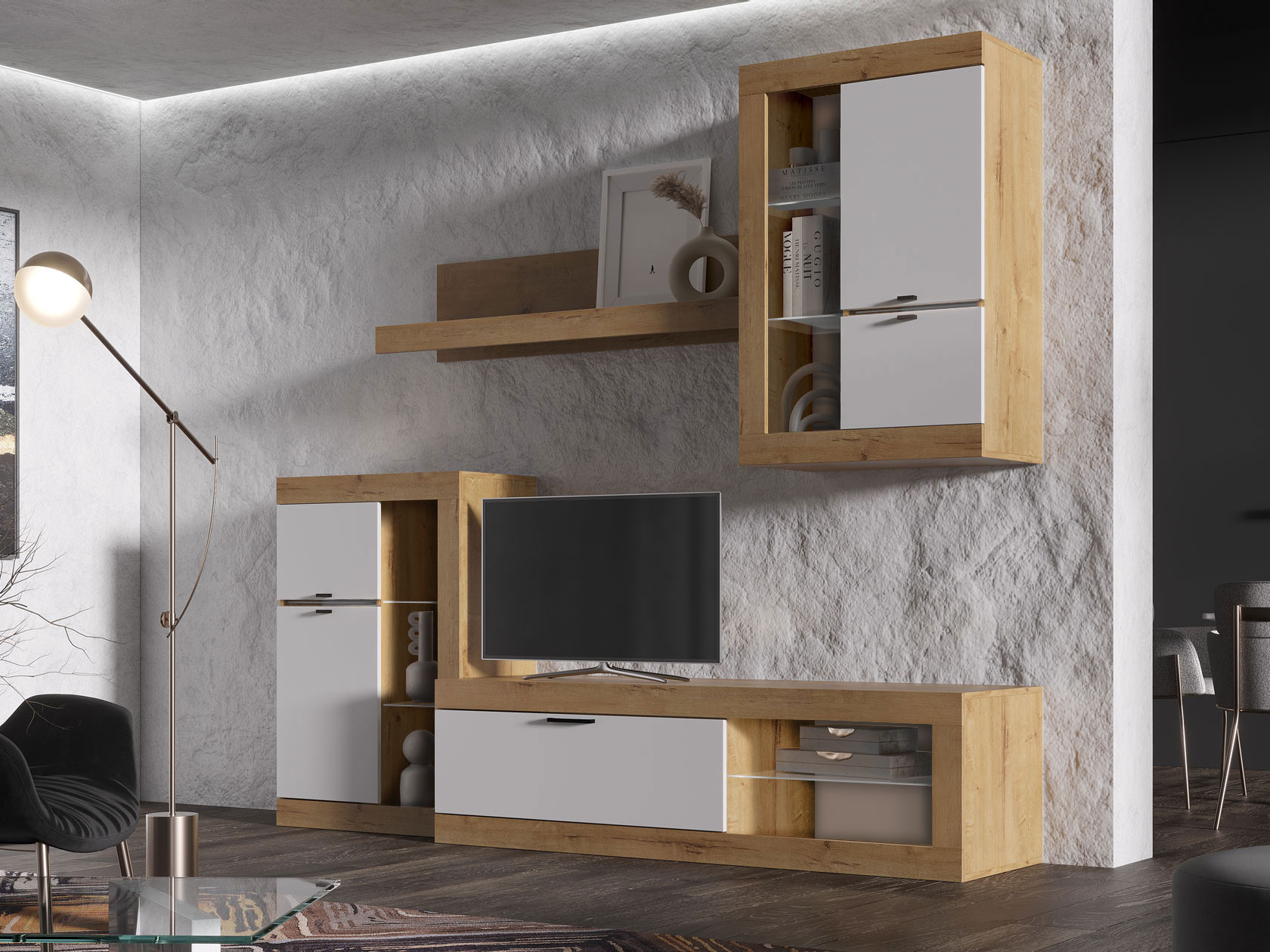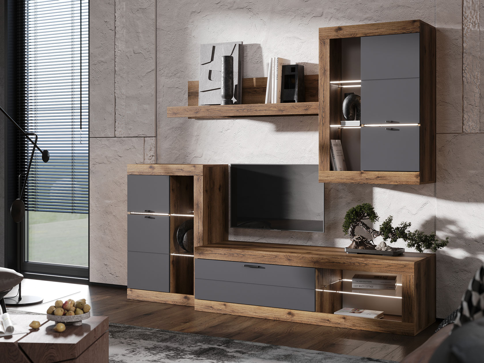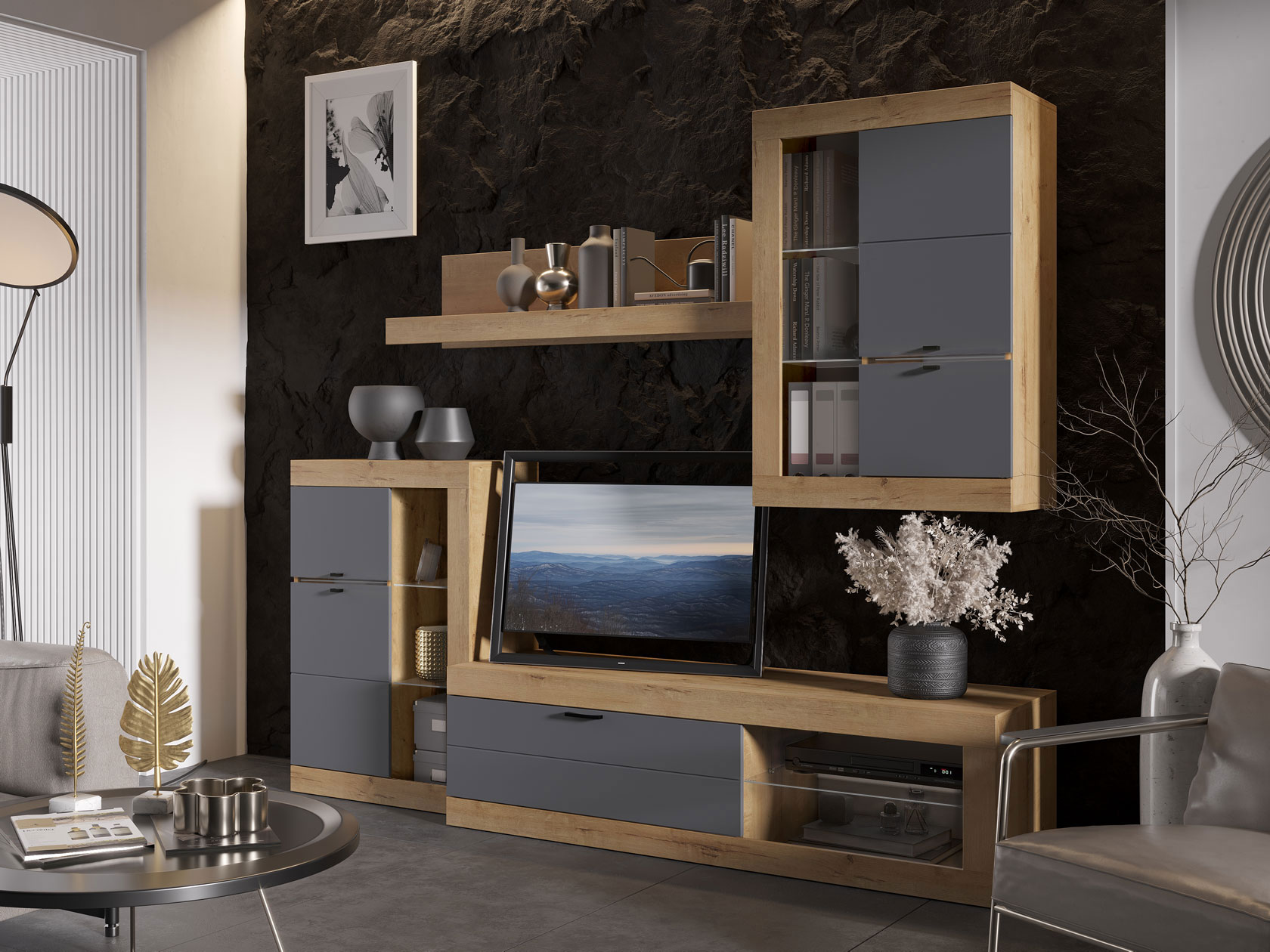 Гостиная Прага Мини — продуманное сочетание элементов, которое добавит интерьеру максимальную функциональность. Симметрично расположенная мебель создаст гармоничную атмосферу и обеспечит место для каждой вещи. Текстура дерева привносит теплые и уютные нотки в обстановку комнаты.
