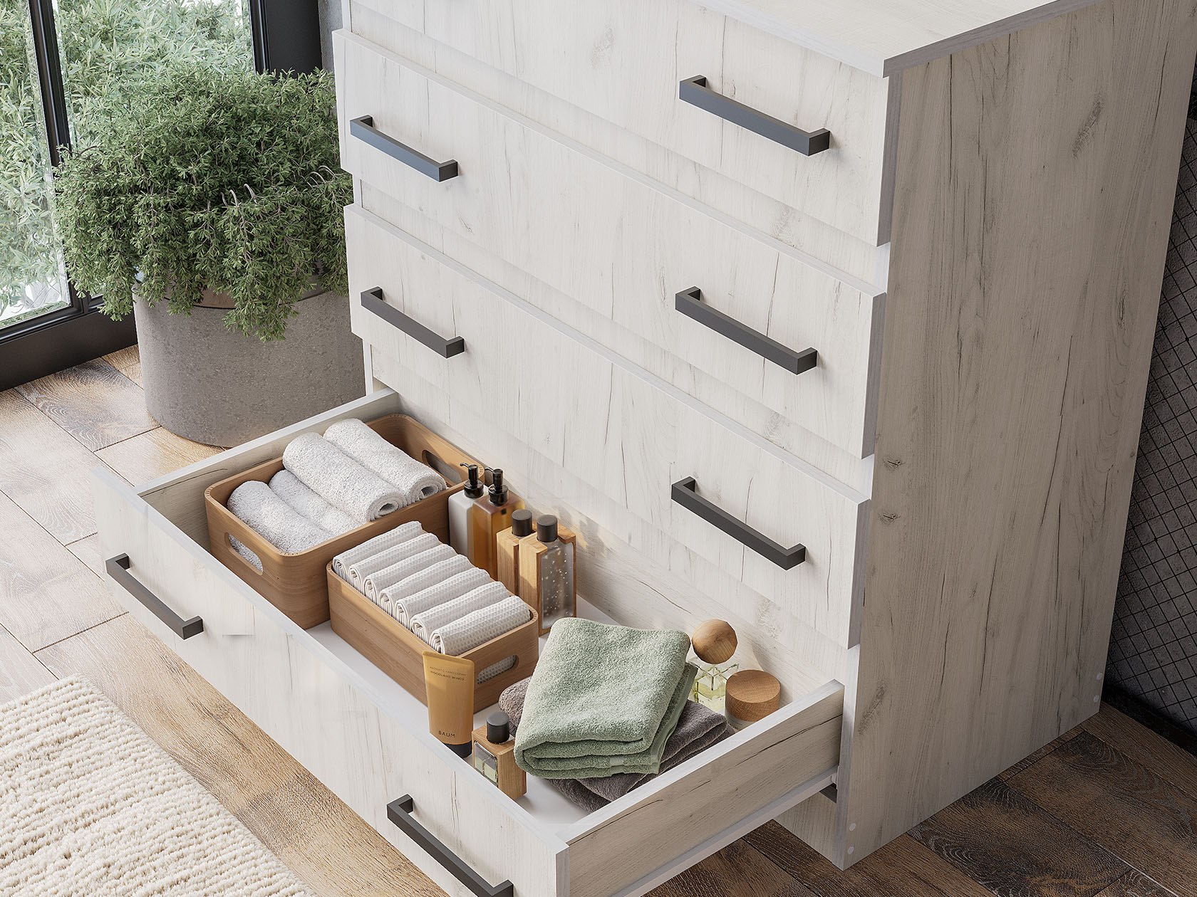 Комод Стандарт 6 станет практичным решением для хранения разных категорий вещей. Широкие ящики с удобными ручками позволят разместить всё необходимое и обеспечат быстрый доступ к нужным предметам. Привлекательный дизайн с текстурой дерева и строгими ручками удачно сочетается с разными интерьерами.