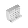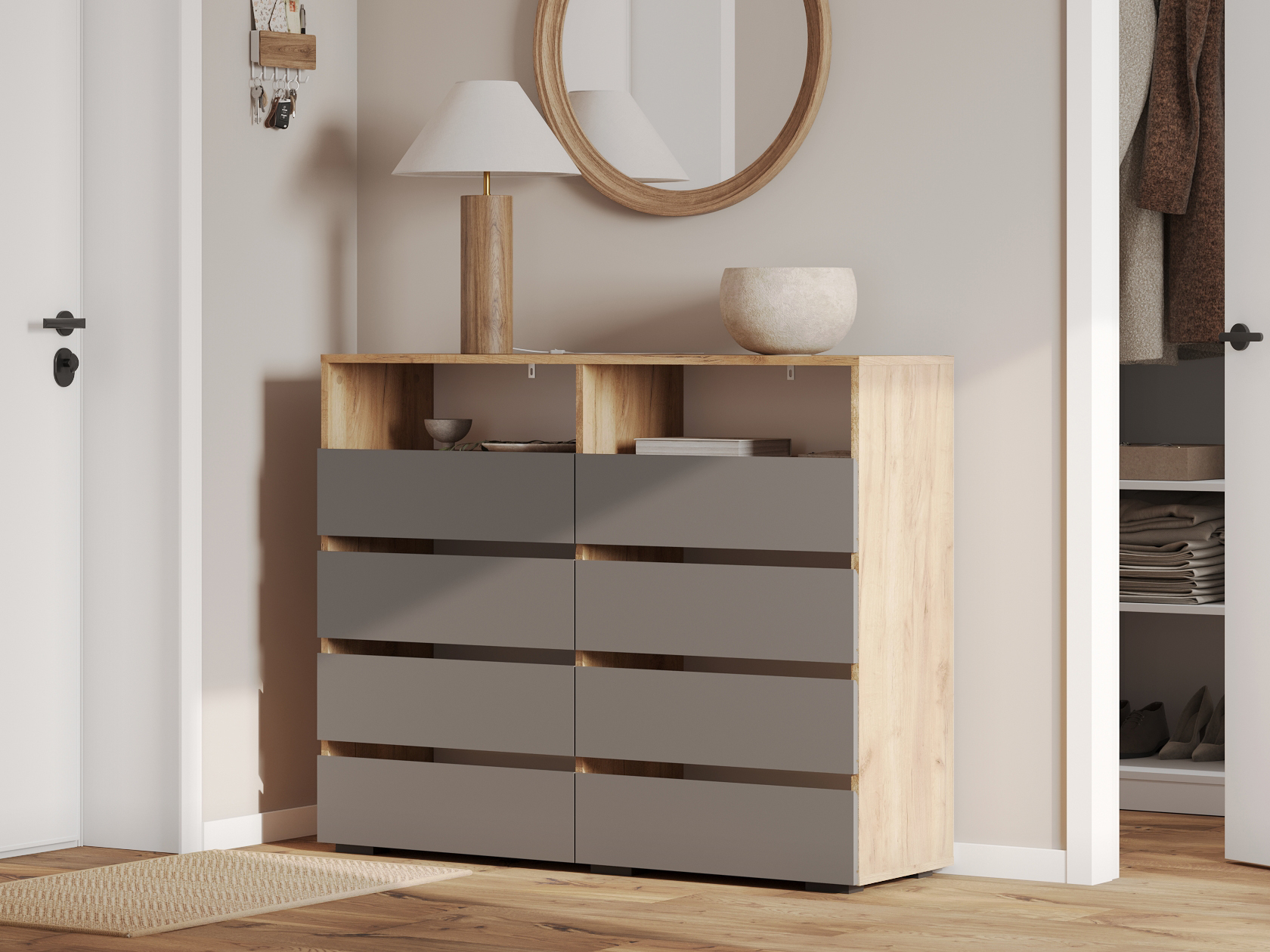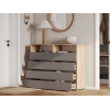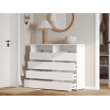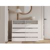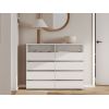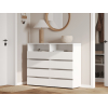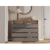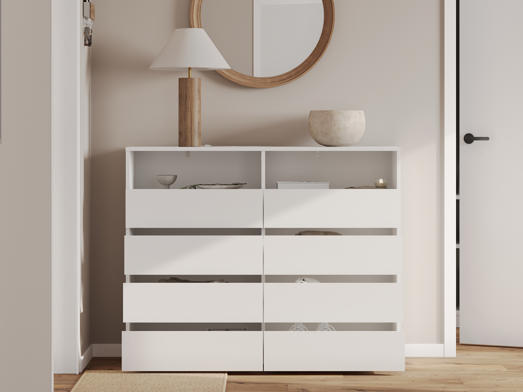 Комод Эссо организует хранение разных категорий вещей. Выдвижные секции открывают полный обзор содержимого и быстрый доступ к нему. Открытые ниши позволяют украсить обстановку элементами декора и держать на виду то, что требуется постоянно. Лаконичная эстетика гладких фасадов без фурнитуры делает модель актуальным приобретением для любого интерьера.