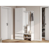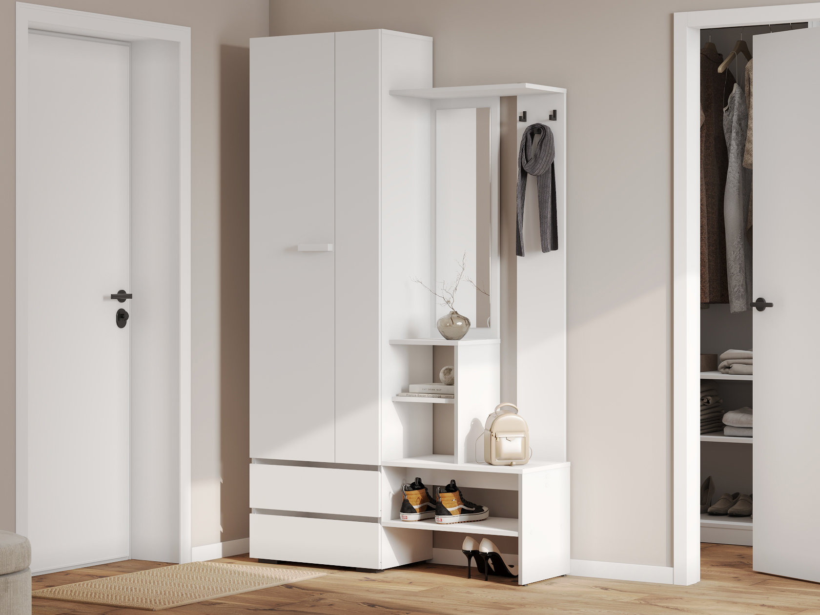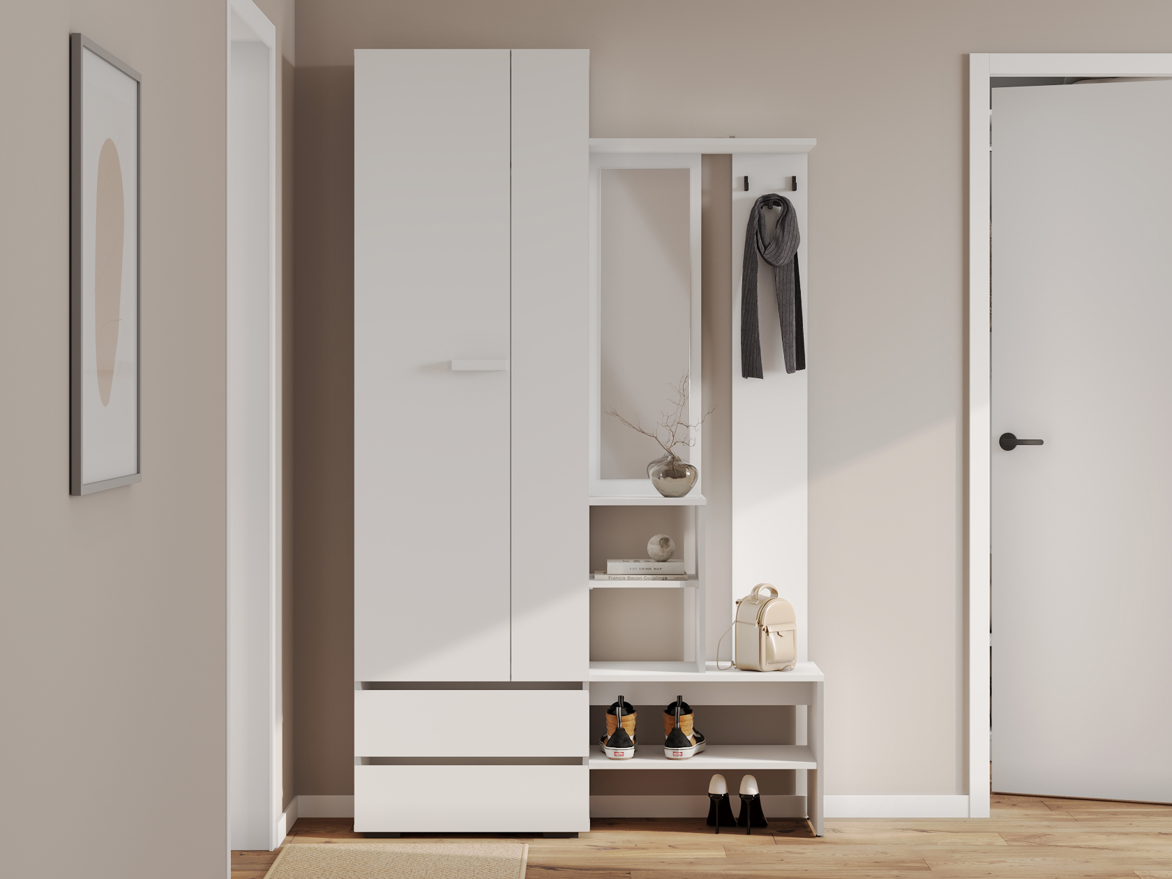 Прихожая Эссо с комодом организует продуманную систему хранения в современном интерьере. Практичный дуэт мебели идеально подойдет для небольшой квартиры или студии. Конструкция предусматривает крючки для повседневной верхней одежды и открытые полки для головных уборов, аксессуаров и обуви. Шкаф и комод обеспечат место для сезонных предметов гардероба.