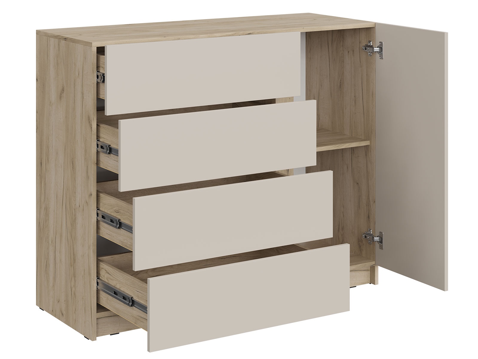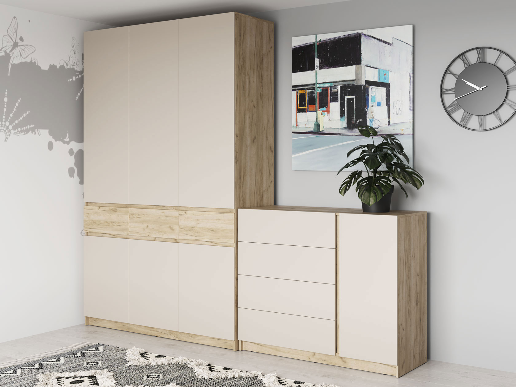 Прихожая Бостон украсит интерьер и дополнит систему хранения. Вместительные шкаф и комод станут идеальным тандемом для разных категорий вещей: от аксессуаров до верхней одежды. Фасады без ручек отражают актуальный мебельный тренд. Ящики с плавным ходом выдвигаются на всю глубину, обеспечивая полный обзор содержимого. Древесная фактура в оформлении создает нотки теплоты и уюта.