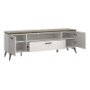 ТВ-тумба Винати Комби подойдет для размещения монитора с большой диагональю и других мультимедийных устройств. Отделения с дверцами, выдвижной ящик и открытая ниша по центру помогут поддерживать порядок в комнате. Вертикальная фрезеровка послужит стильным декором, а древесный оттенок добавит обстановке уютный акцент. Ножки в цвет фурнитуры расположены чуть под углом, что также придает мебели привлекательный вид.