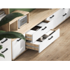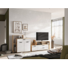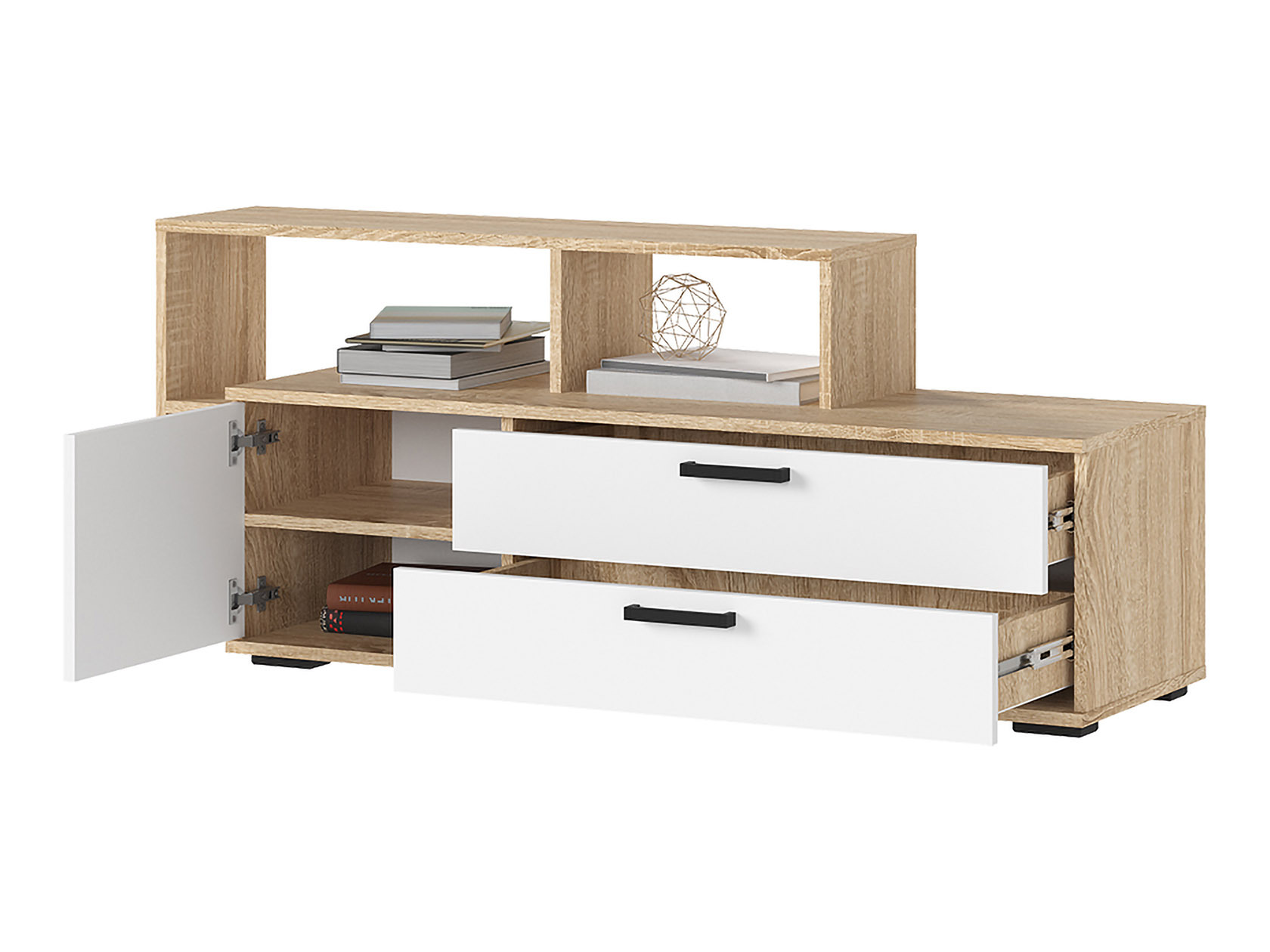 ТВ-тумба Санса организует хранение видео- и аудиотехники, а также сопутствующих аксессуаров. На широкой поверхности без труда поместится телевизор с большой диагональю. Небольшие выдвижные ящики отлично подходят для разных мелочей, а открытые полки создают эффект свободного пространства.