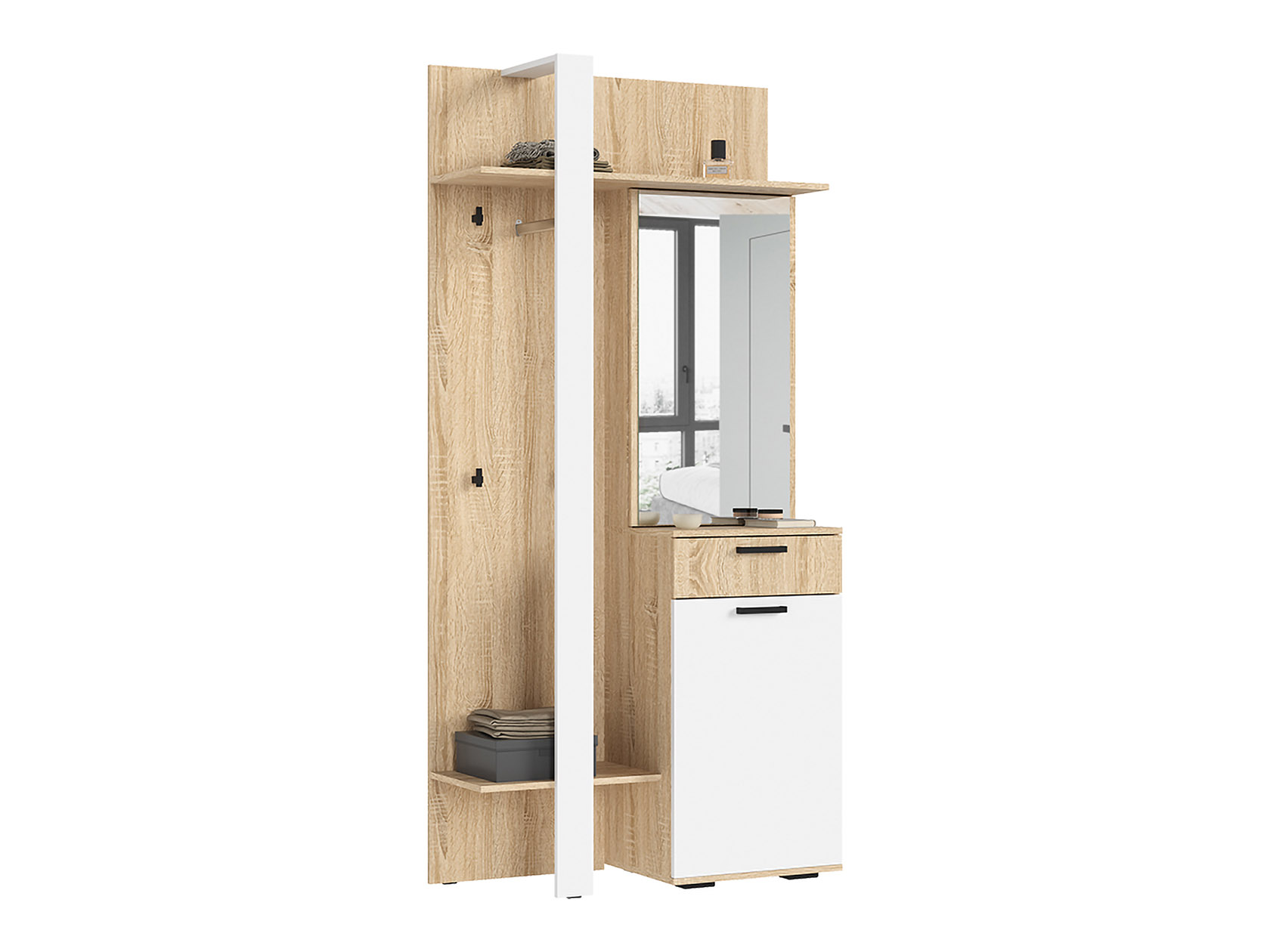 Прихожая Санса — практичное решение для меблировки входной зоны. Конструкция предусматривает всё необходимое, чтобы разместить одежду и сопутствующие аксессуары. За зеркалом скрывается секция с полками для косметики и парфюма. Панель с крючками дополнена открытыми нишами для хранения важных мелочей.