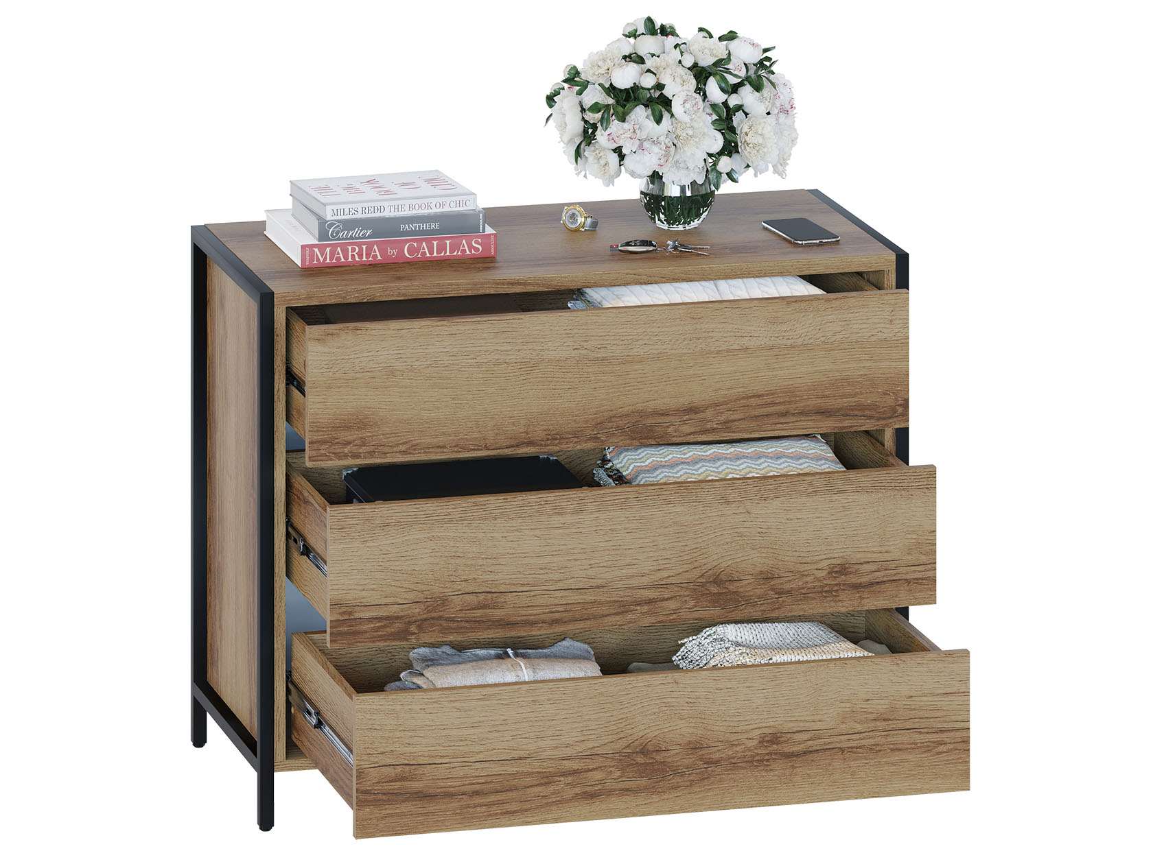 Комод Морен — стильное и функциональное решение для домашнего кабинета или офисного пространства. Внутреннее наполнение предусматривает удобные выдвижные ящики, где можно хранить личные вещи и документы. Контрастные металлические ножки выступают акцентами интерьера и позволяют легко проводить уборку.