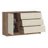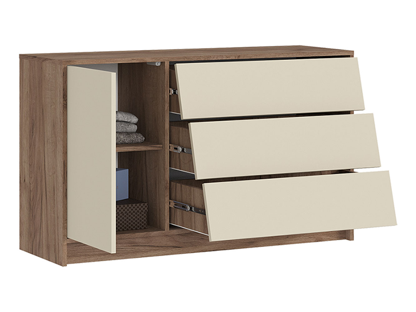 Комод Рейн предоставит достаточно места для хранения одежды, белья и аксессуаров. Комбинированное наполнение с распашной дверцей и выдвижными ящиками поможет удобно распределить всё необходимое. Скошенные линии фасадов добавляют меблировке динамики и стиля.