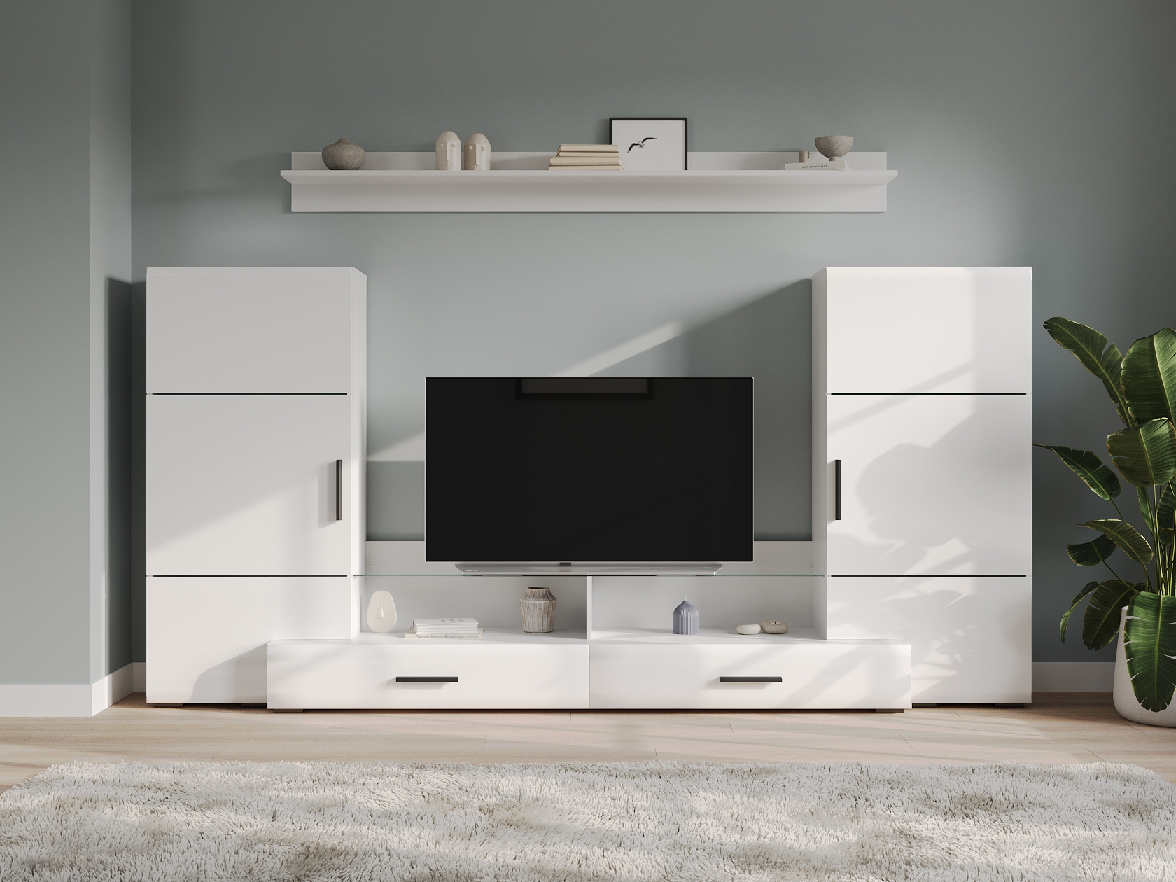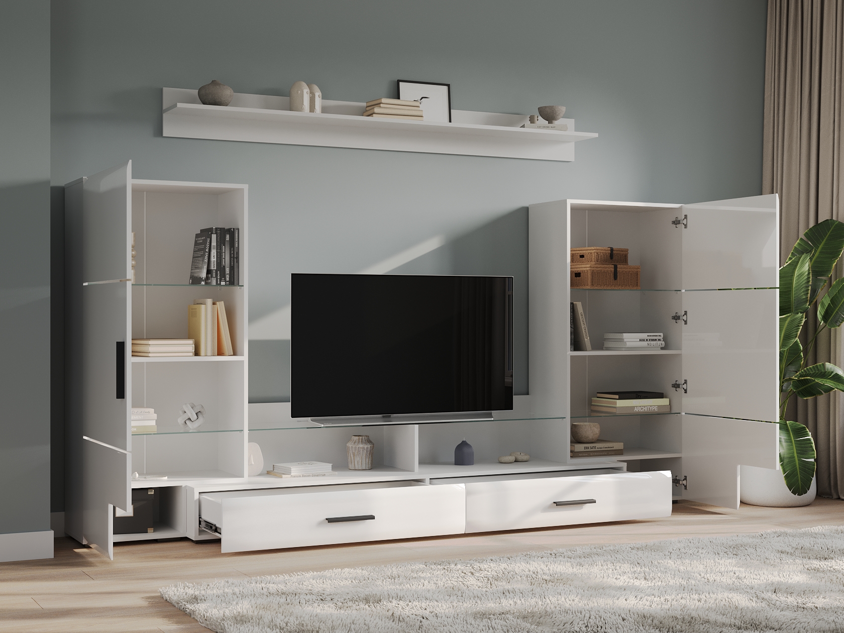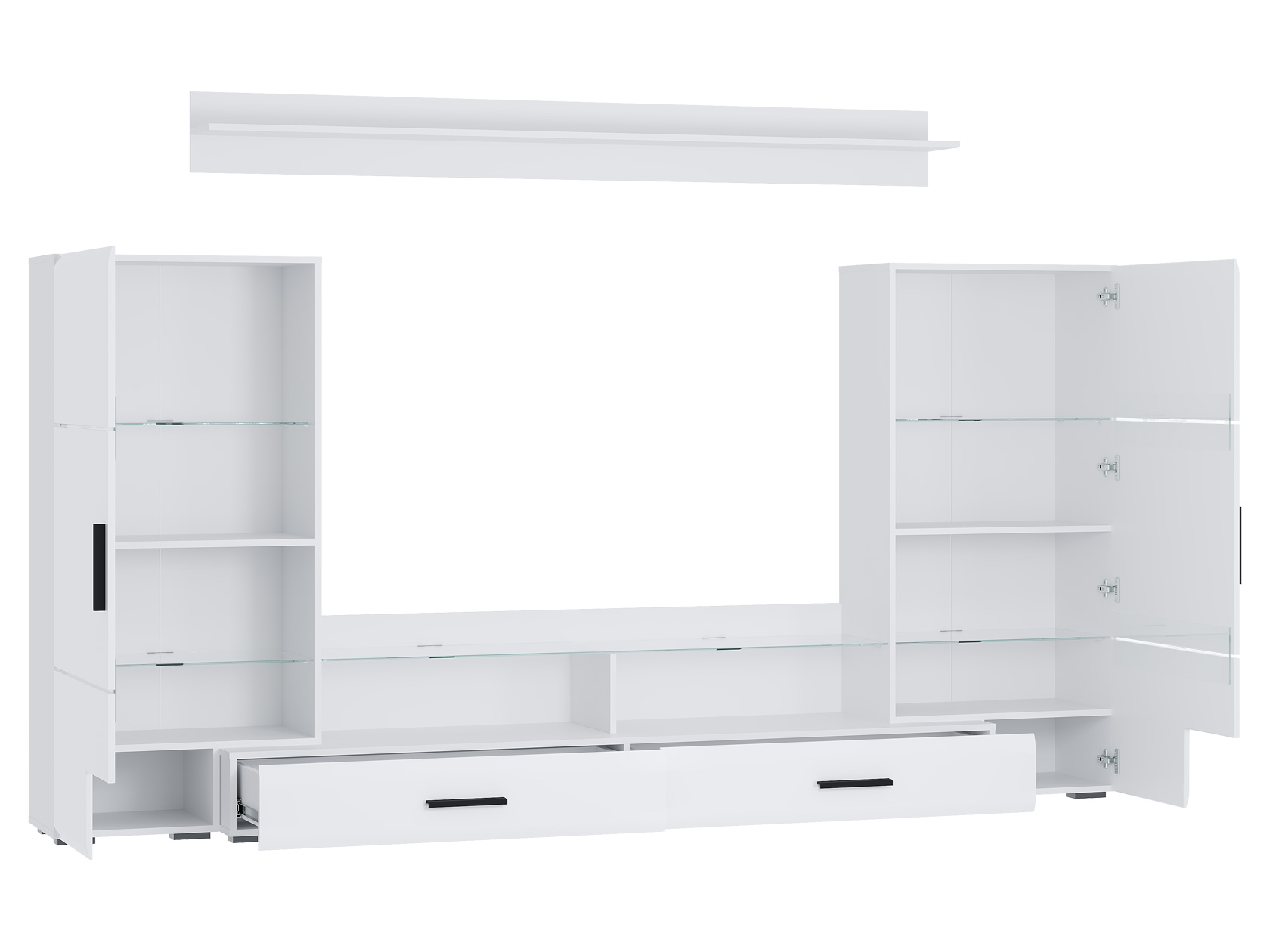 Гостиная Алегро — удобная система хранения с просторной нишей для телевизора. В дизайне сделан акцент на строгую геометрию, которая подчеркнута контрастными ручками. За глухими фасадами можно разместить книги, документы, бытовые мелочи и личные вещи, а на открытых полках — стильный декор и то, что привычно держать на виду.