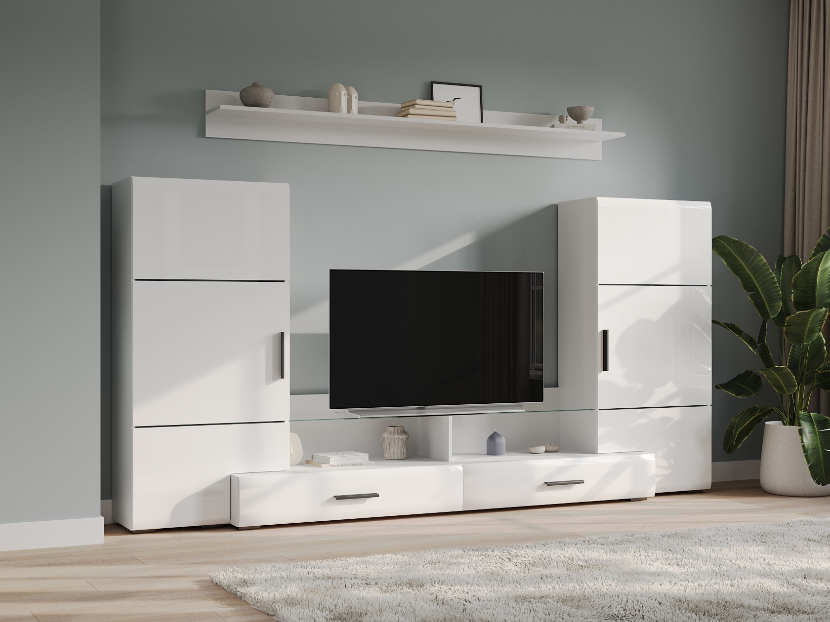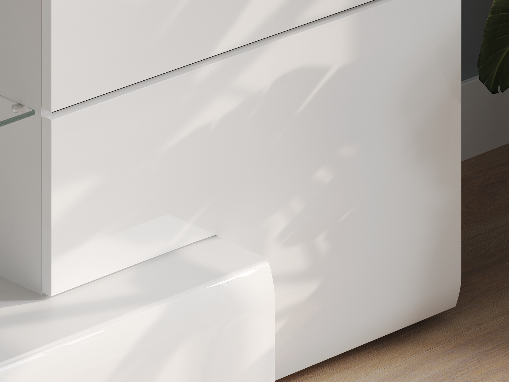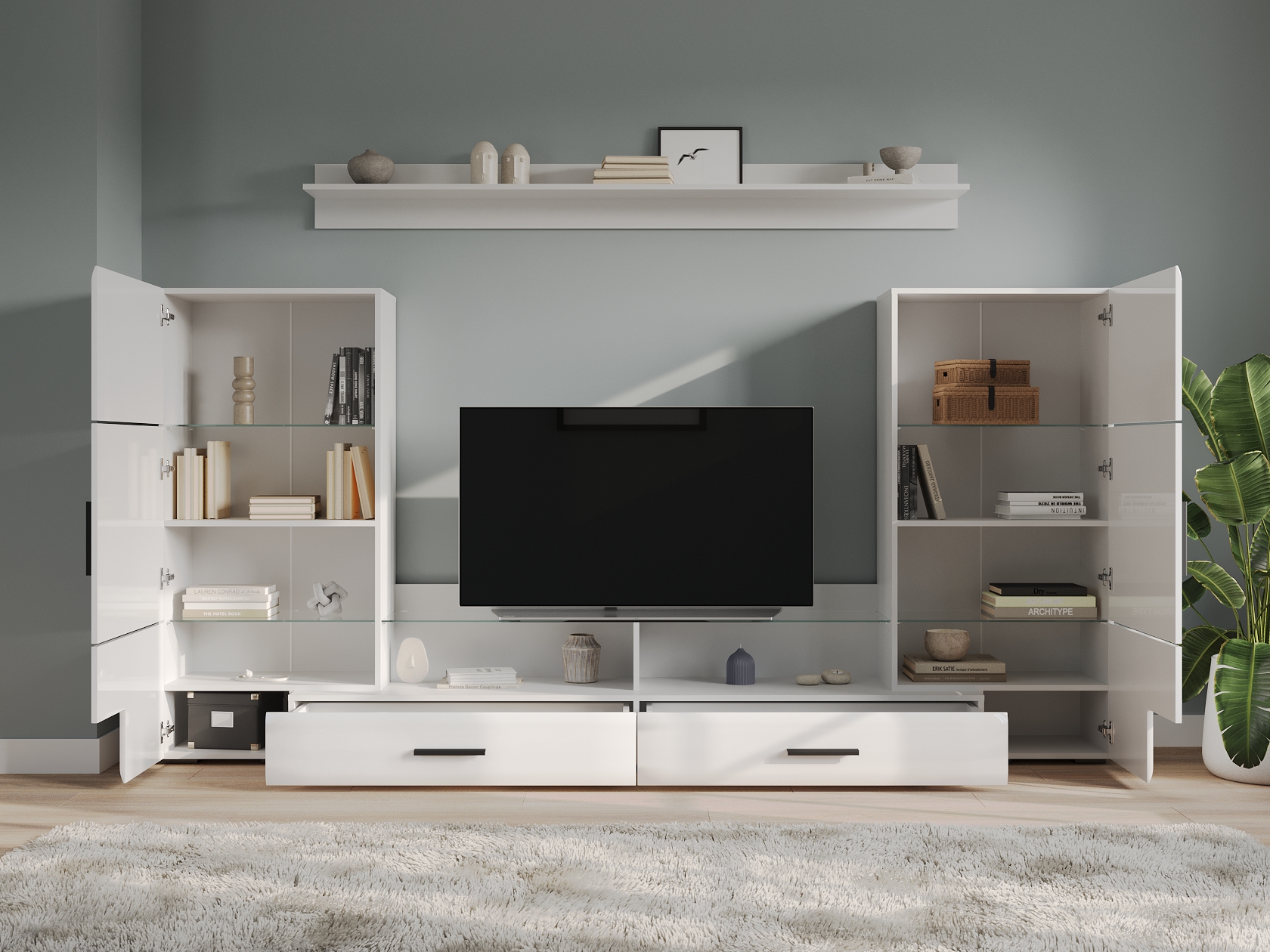 Гостиная Алегро — удобная система хранения с просторной нишей для телевизора. В дизайне сделан акцент на строгую геометрию, которая подчеркнута контрастными ручками. За глухими фасадами можно разместить книги, документы, бытовые мелочи и личные вещи, а на открытых полках — стильный декор и то, что привычно держать на виду.