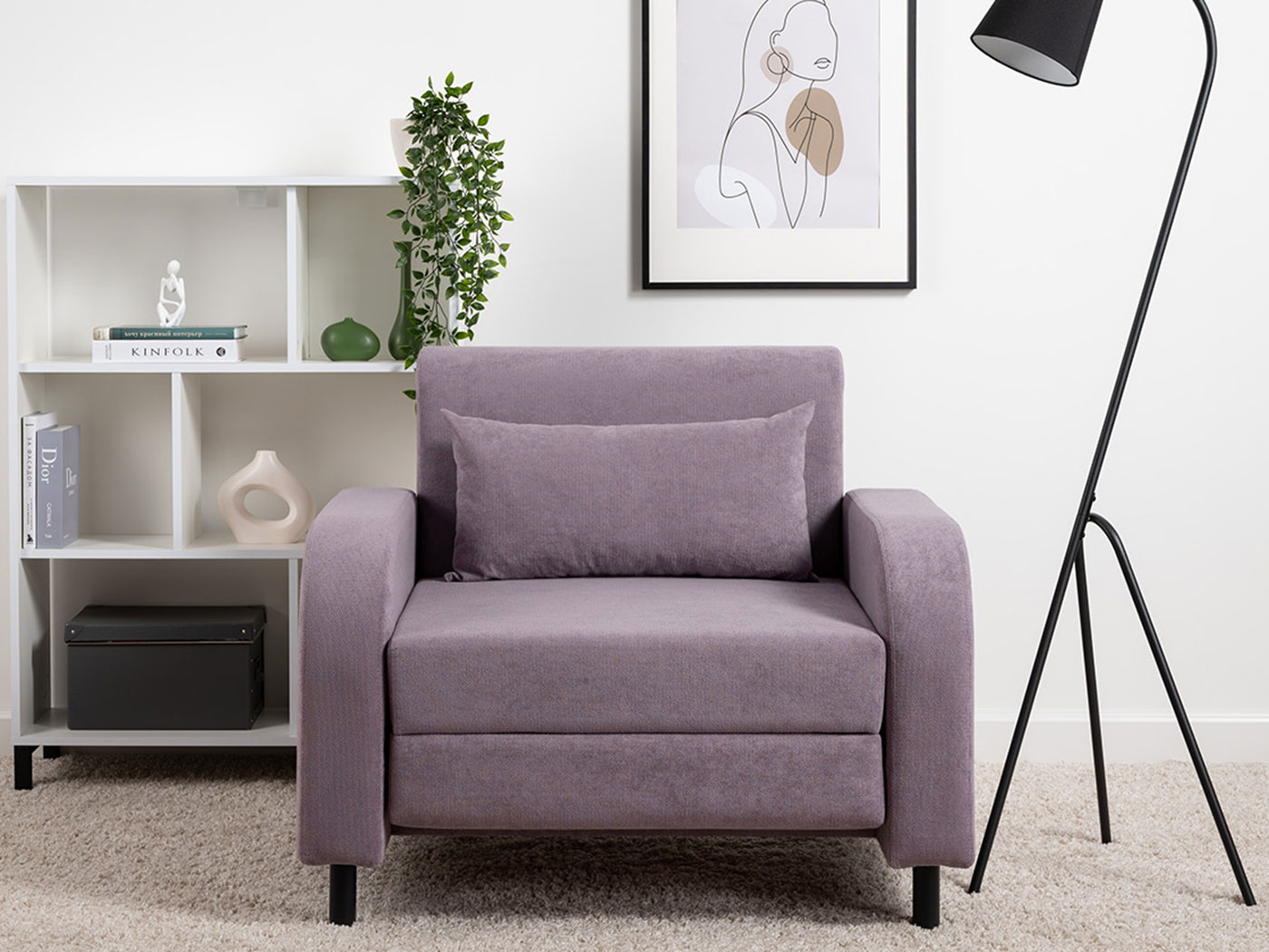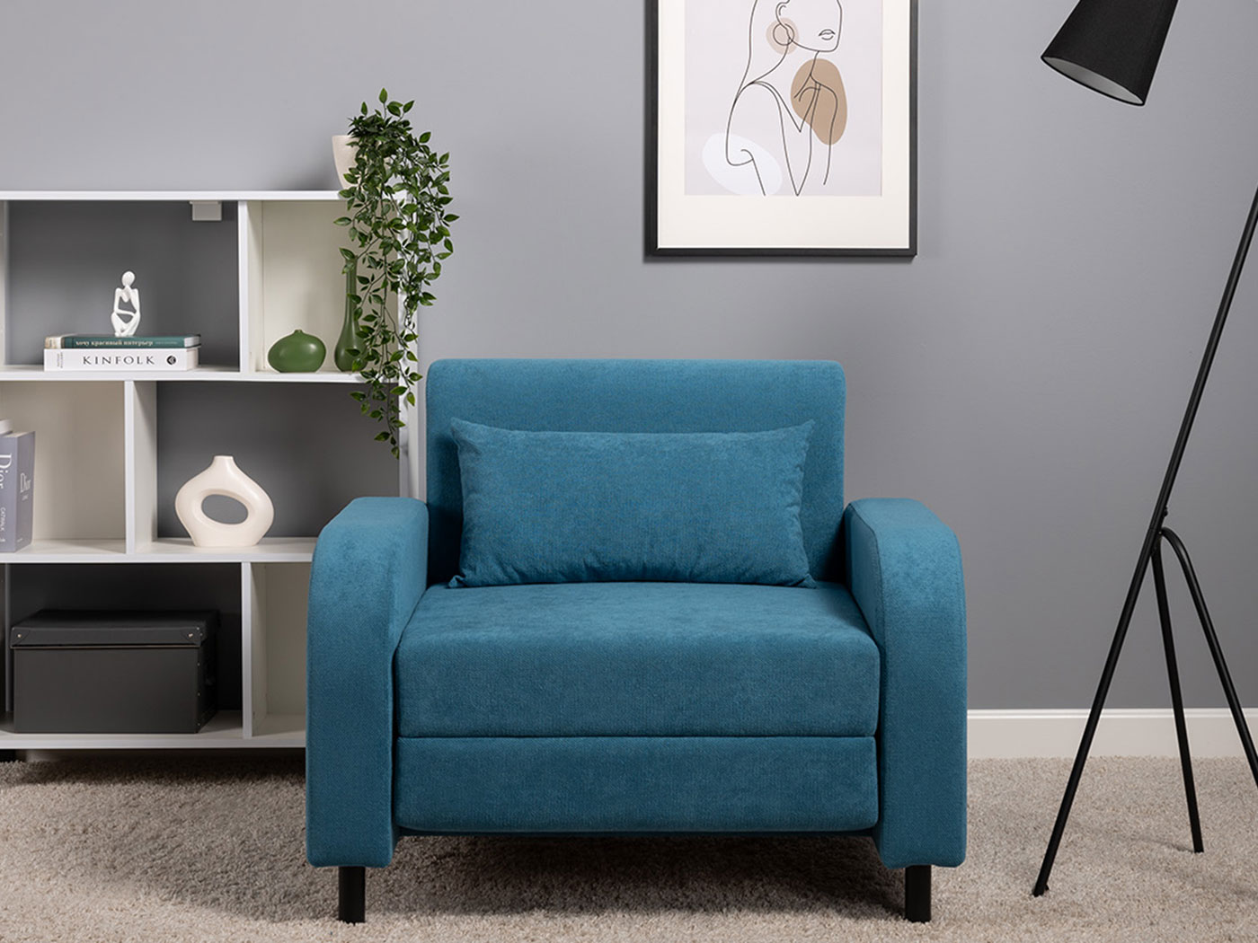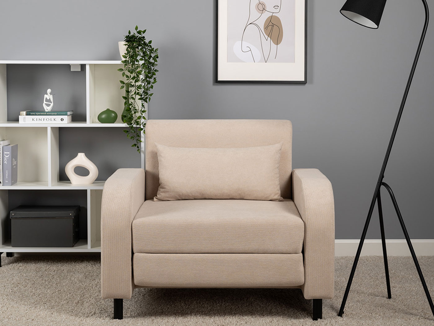 Кресло-кровать Киото дополнит интерьер спальни или гостиной и обеспечит уютное место для отдыха. Плавная форма подлокотников, а также мягкие линии спинки и сиденья создают гармоничный и актуальный силуэт. Со всех сторон кресло смотрится эстетично, поэтому его можно использовать для зонирования пространства. Простой механизм быстро превращает модель в односпальную кровать. Износостойкая ткань с защитой от влаги долго сохраняет привлекательный вид, а небольшие ножки облегчают уборку.