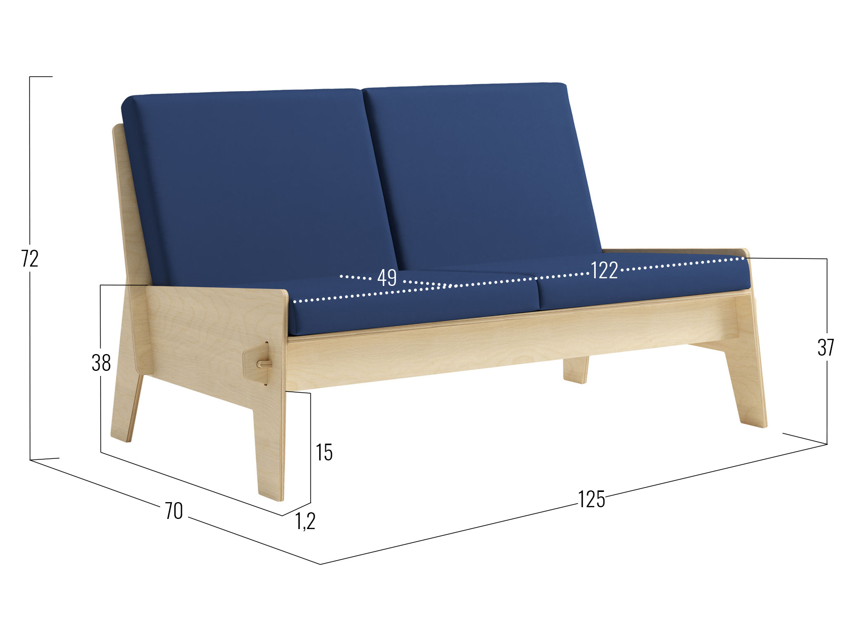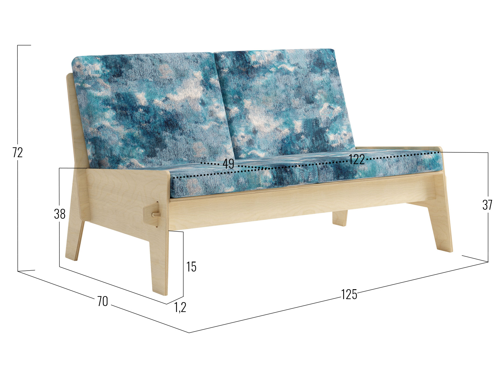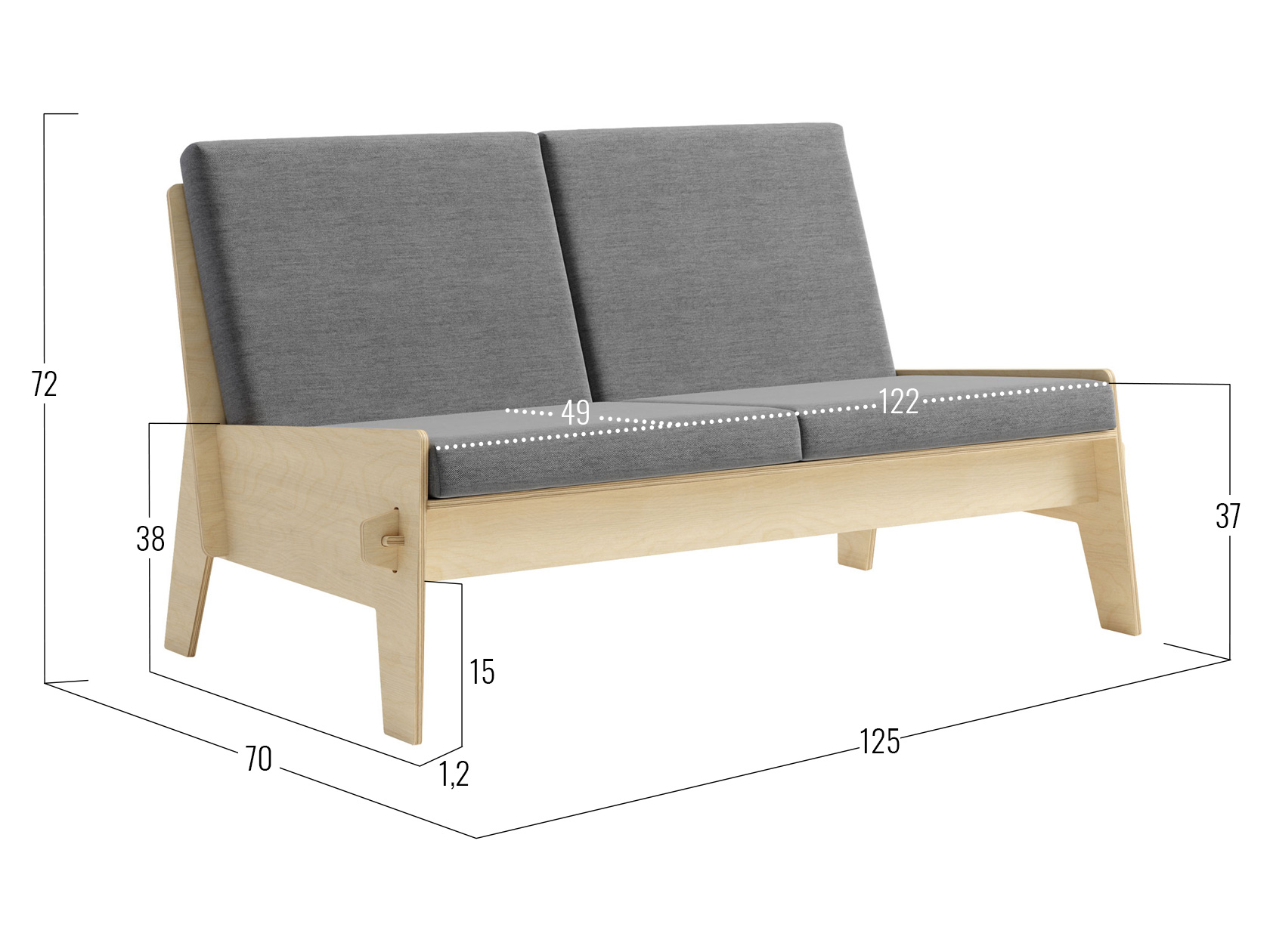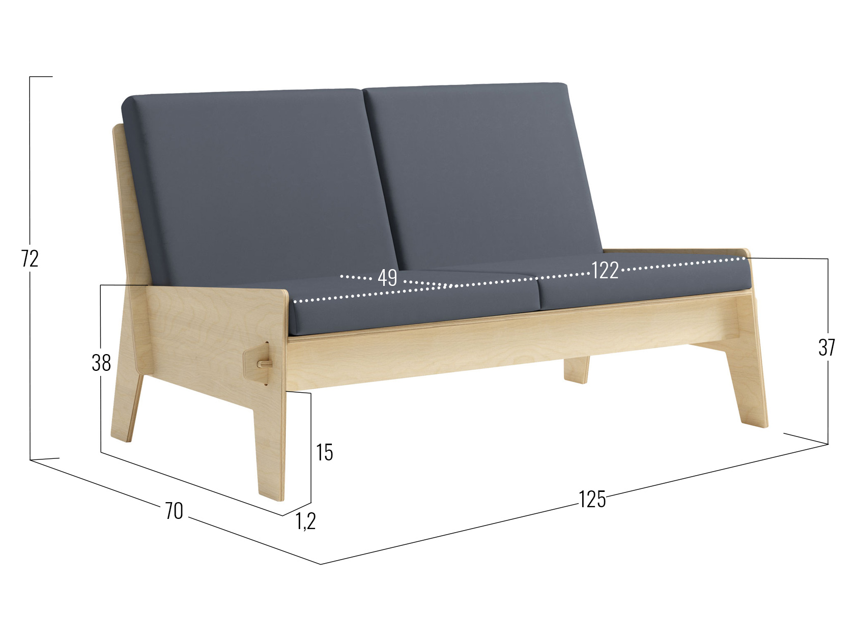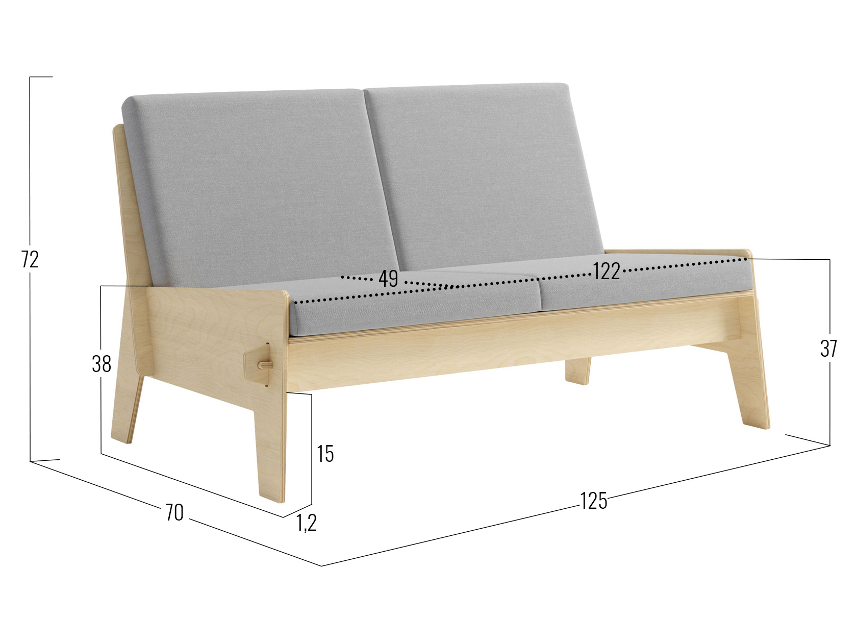 Посадочное место без подушек (ШхГ): 122 х 55 см.