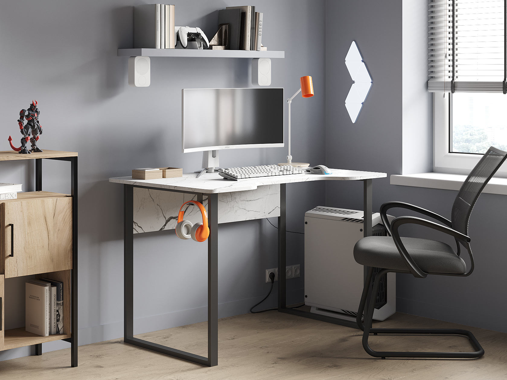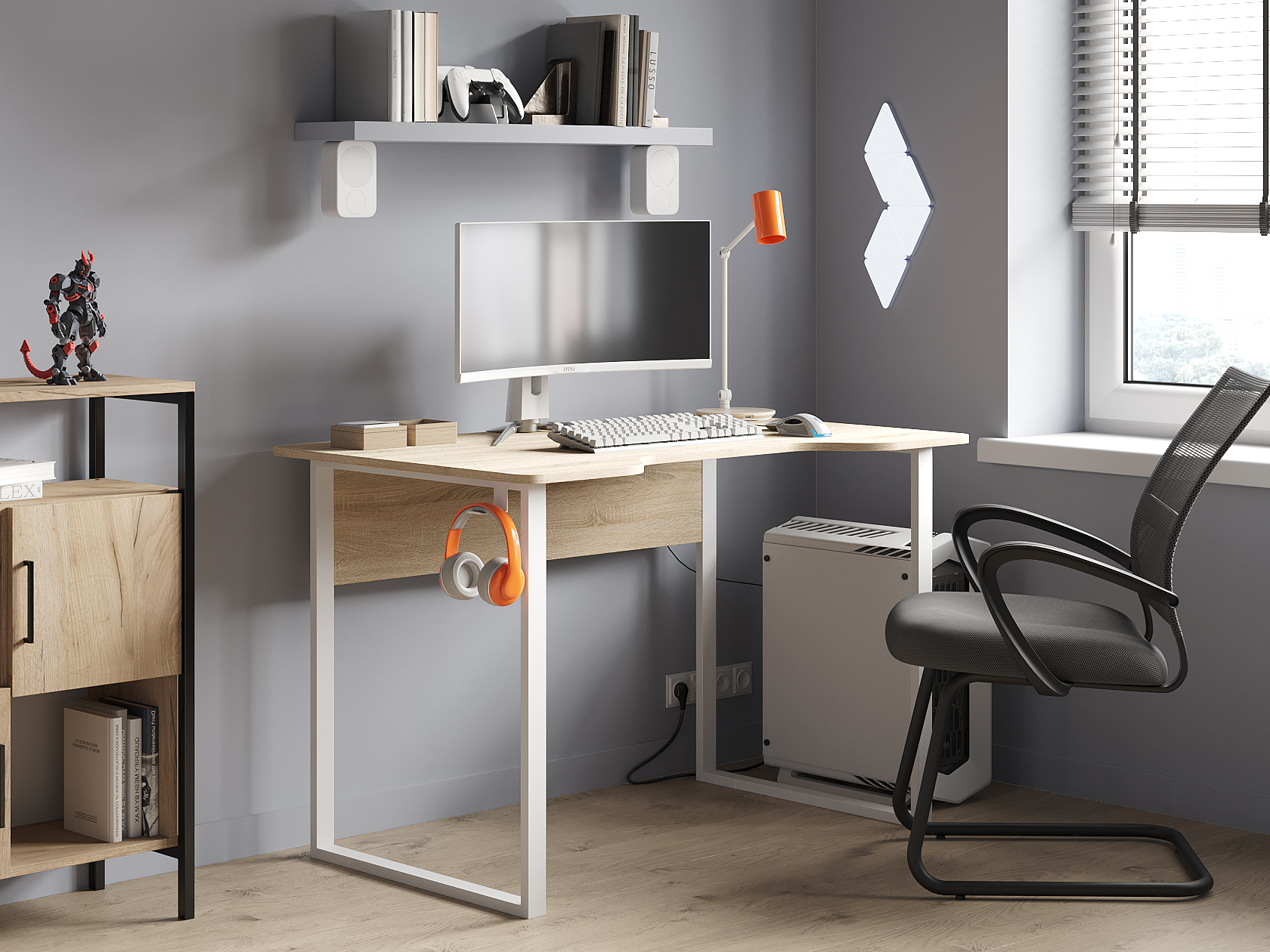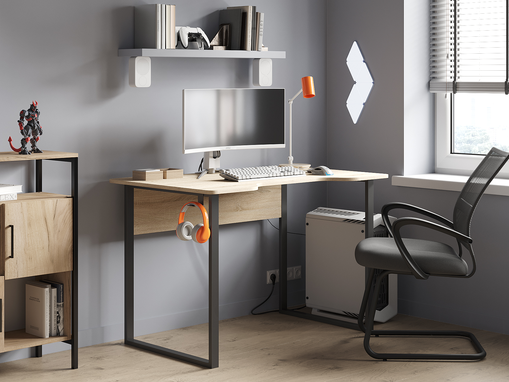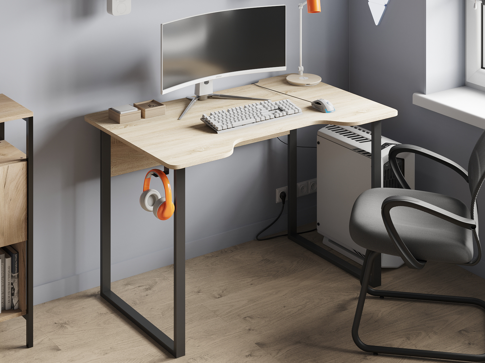 Компьютерный стол Эверест — эргономичная модель, которая отлично подходит для длительного времяпрепровождения за монитором. Анатомический вырез позволяет придвинуться вплотную и удобно расположить руки. Органайзер для проводов и держатель для наушников — практичные дополнения мебели.