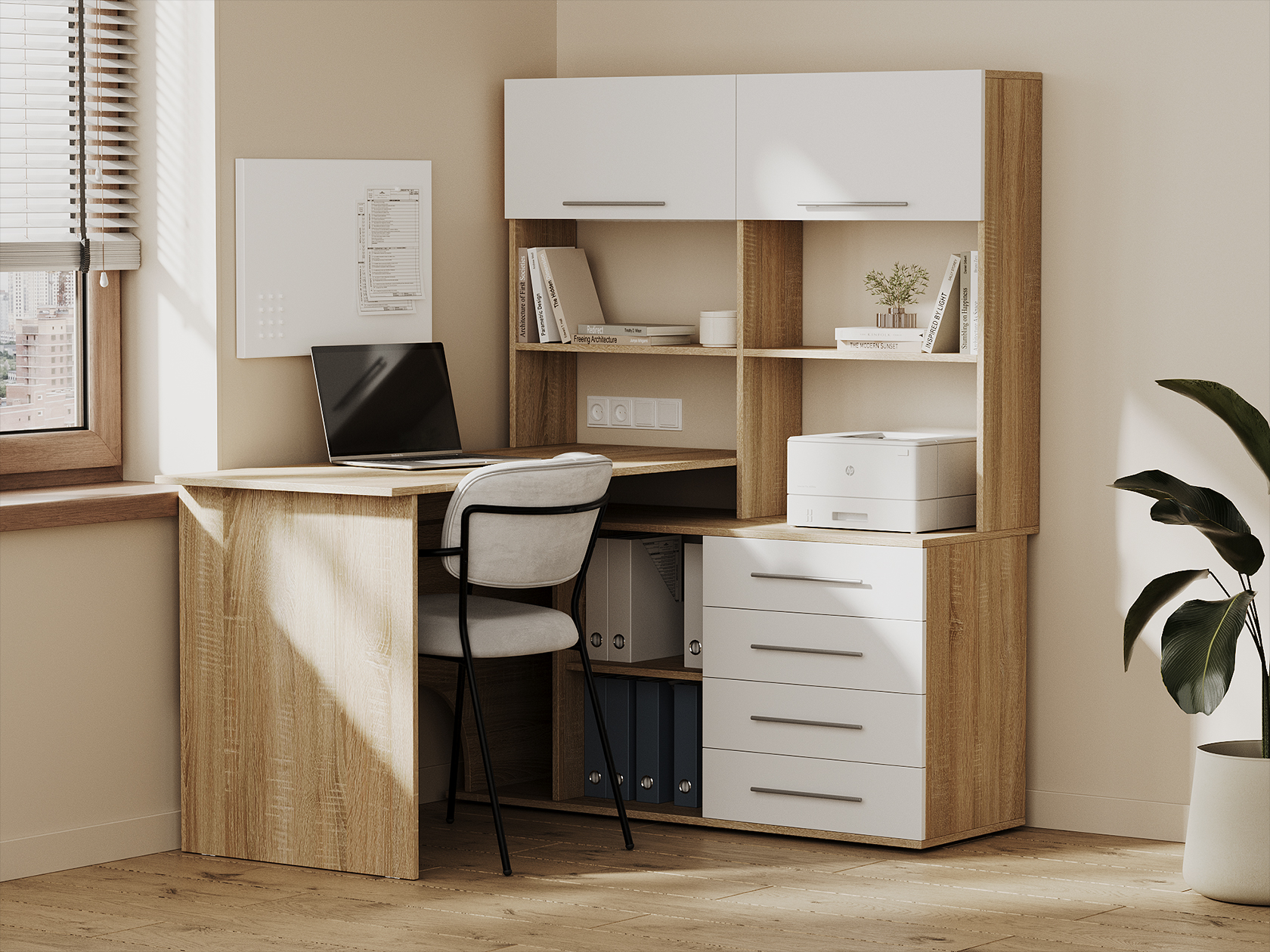 Компьютерный стол Астон — удобная и функциональная модель для домашнего кабинета или офиса. На просторной поверхности поместятся стационарный компьютер или ноутбук, а также оргтехника. В выдвижных ящиках удобно хранить канцелярию и прочие полезные мелочи. На открытых нишах можно расположить файлы с документацией, а за распашными дверцами — спрятать личные вещи.