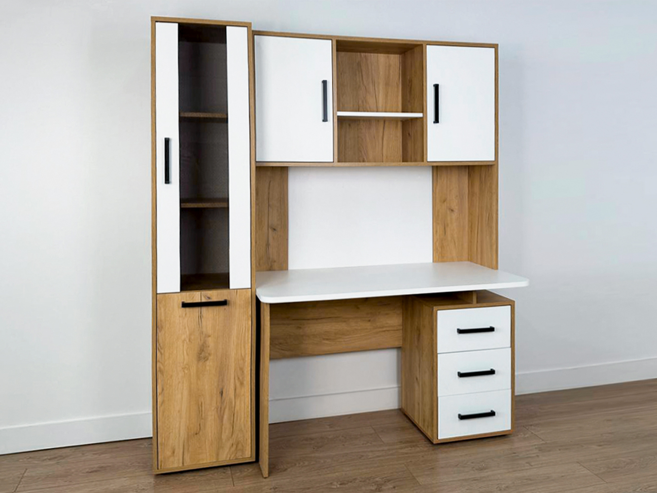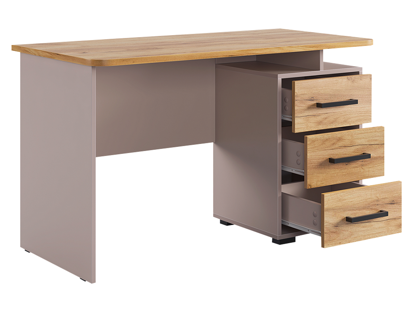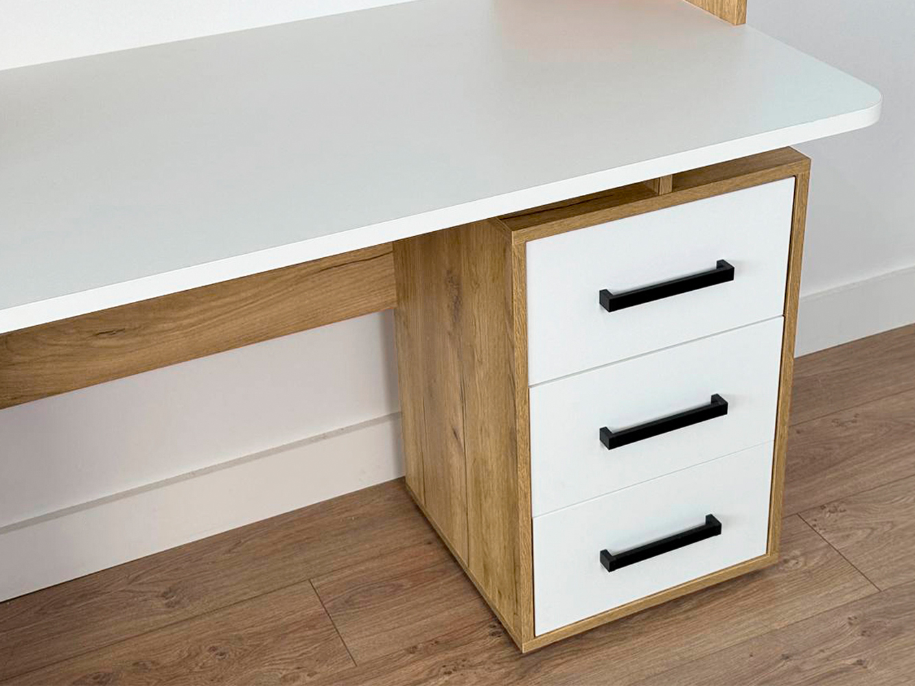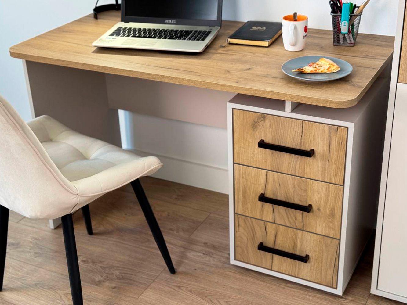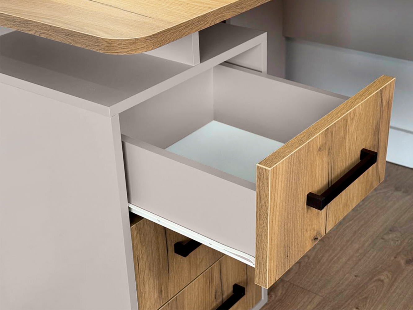 Компьютерный стол Лайт-2 станет незаменимым элементом рабочего пространства дома и в офисе. Просторная столешница обеспечит место для ноутбука или стационарного компьютера, а три выдвижных ящика позволят поддерживать порядок в документах и канцелярии. Сочетание светлых матовых фасадов с фактурой дерева добавляет интерьеру нотки уюта и создает визуальную легкость.