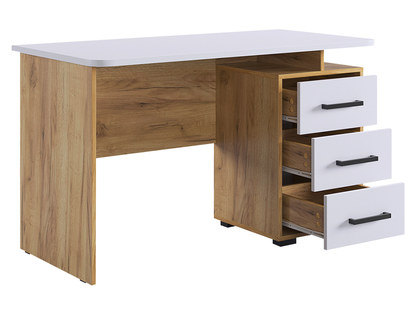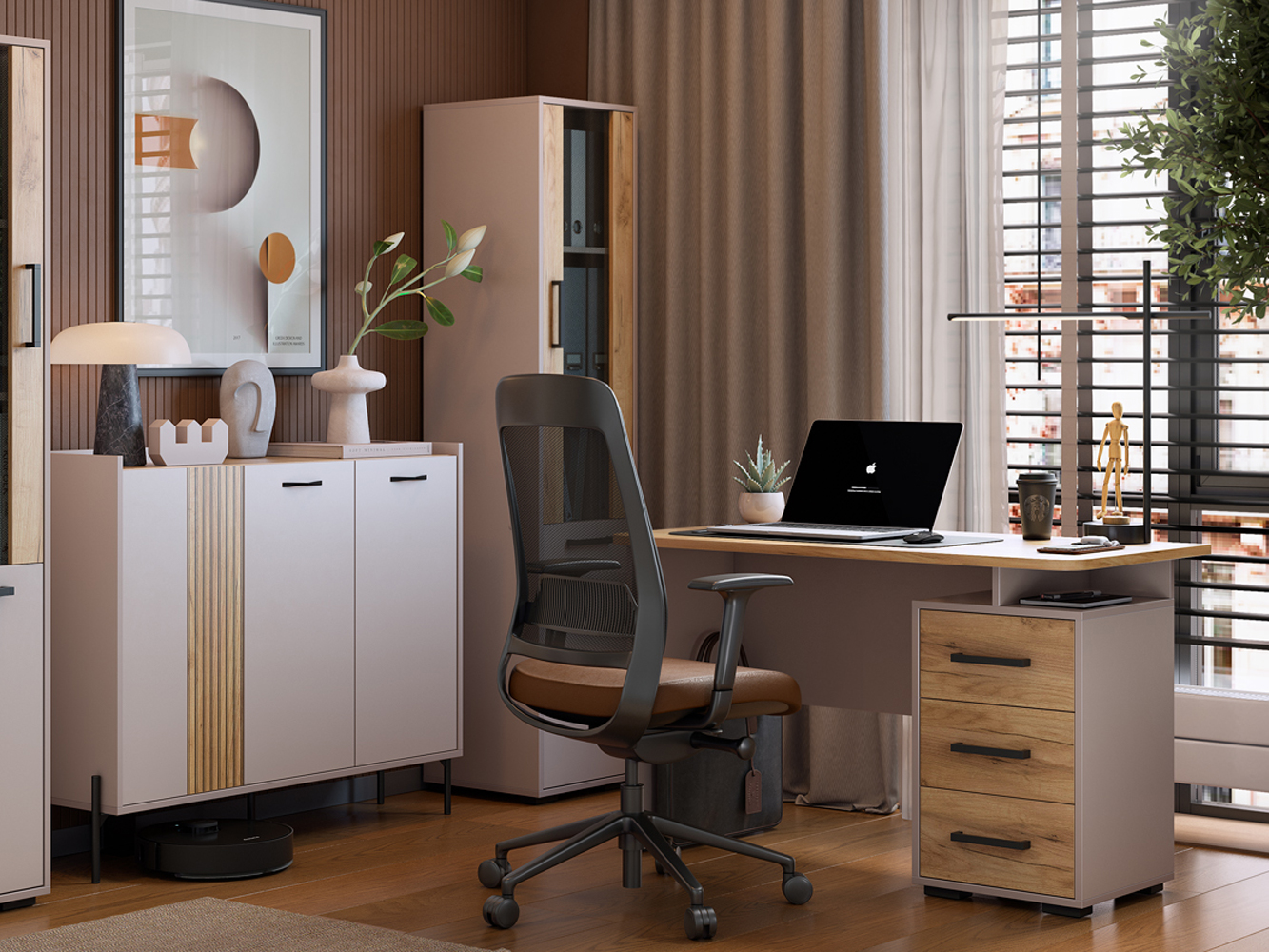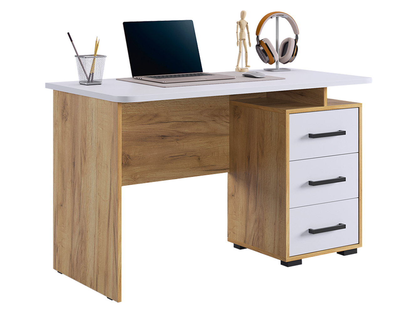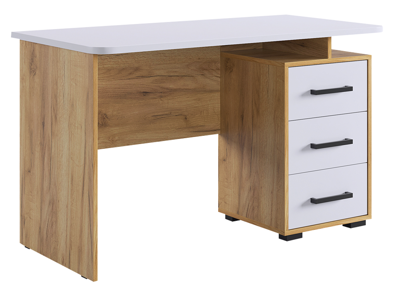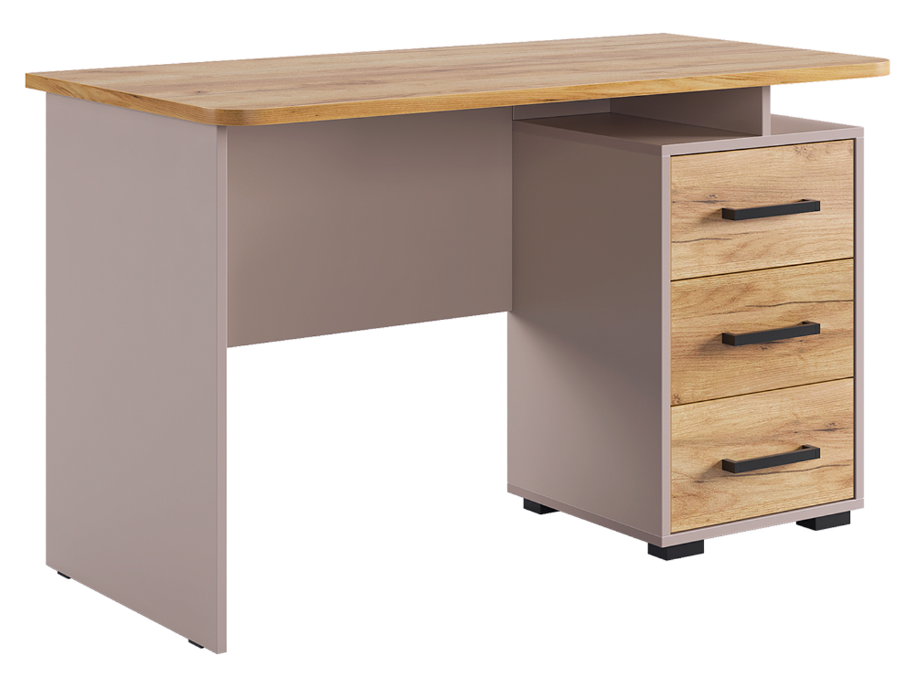 Компьютерный стол Лайт-2 станет незаменимым элементом рабочего пространства дома и в офисе. Просторная столешница обеспечит место для ноутбука или стационарного компьютера, а три выдвижных ящика позволят поддерживать порядок в документах и канцелярии. Сочетание светлых матовых фасадов с фактурой дерева добавляет интерьеру нотки уюта и создает визуальную легкость.