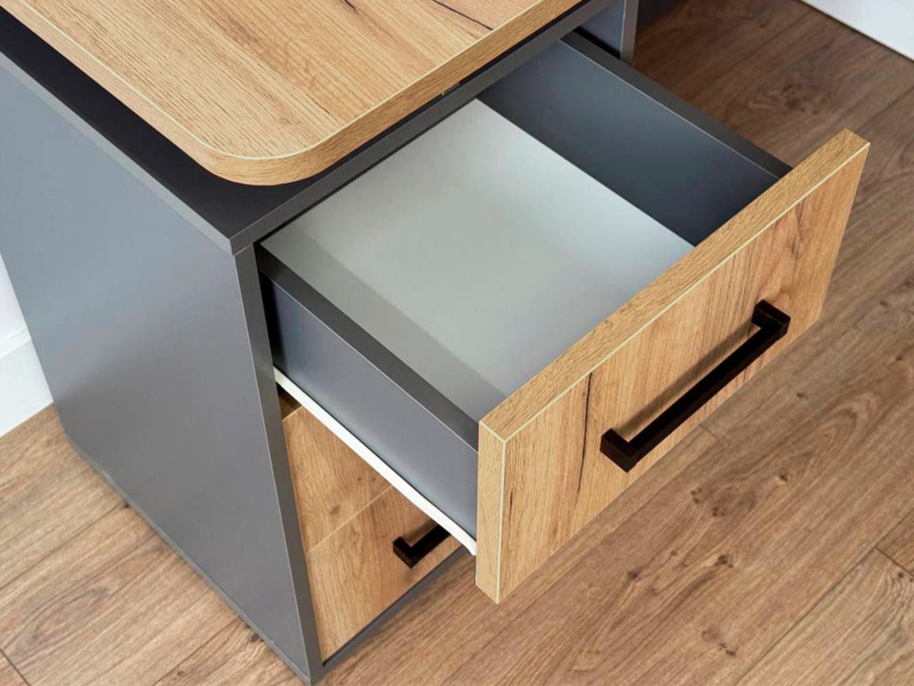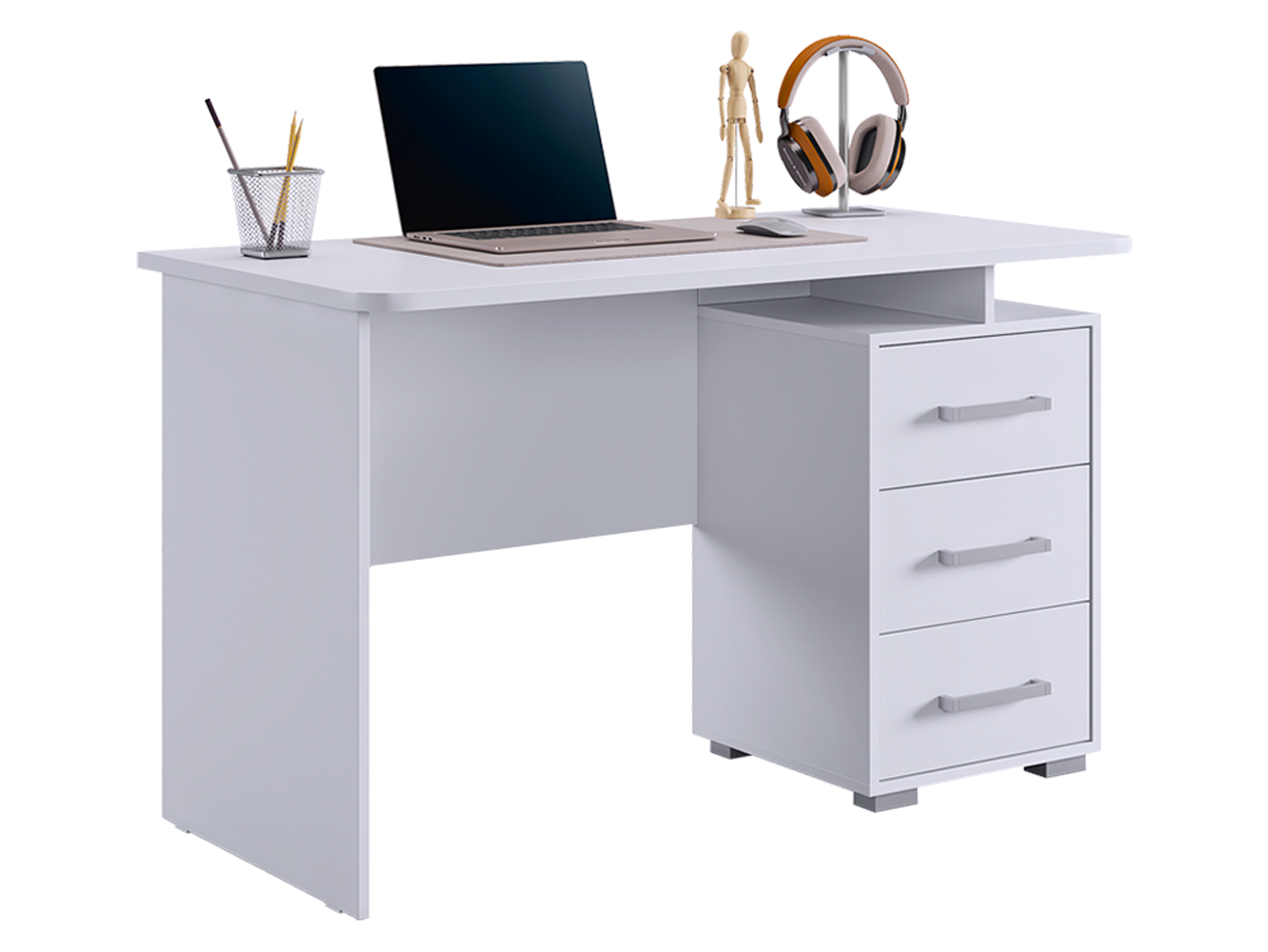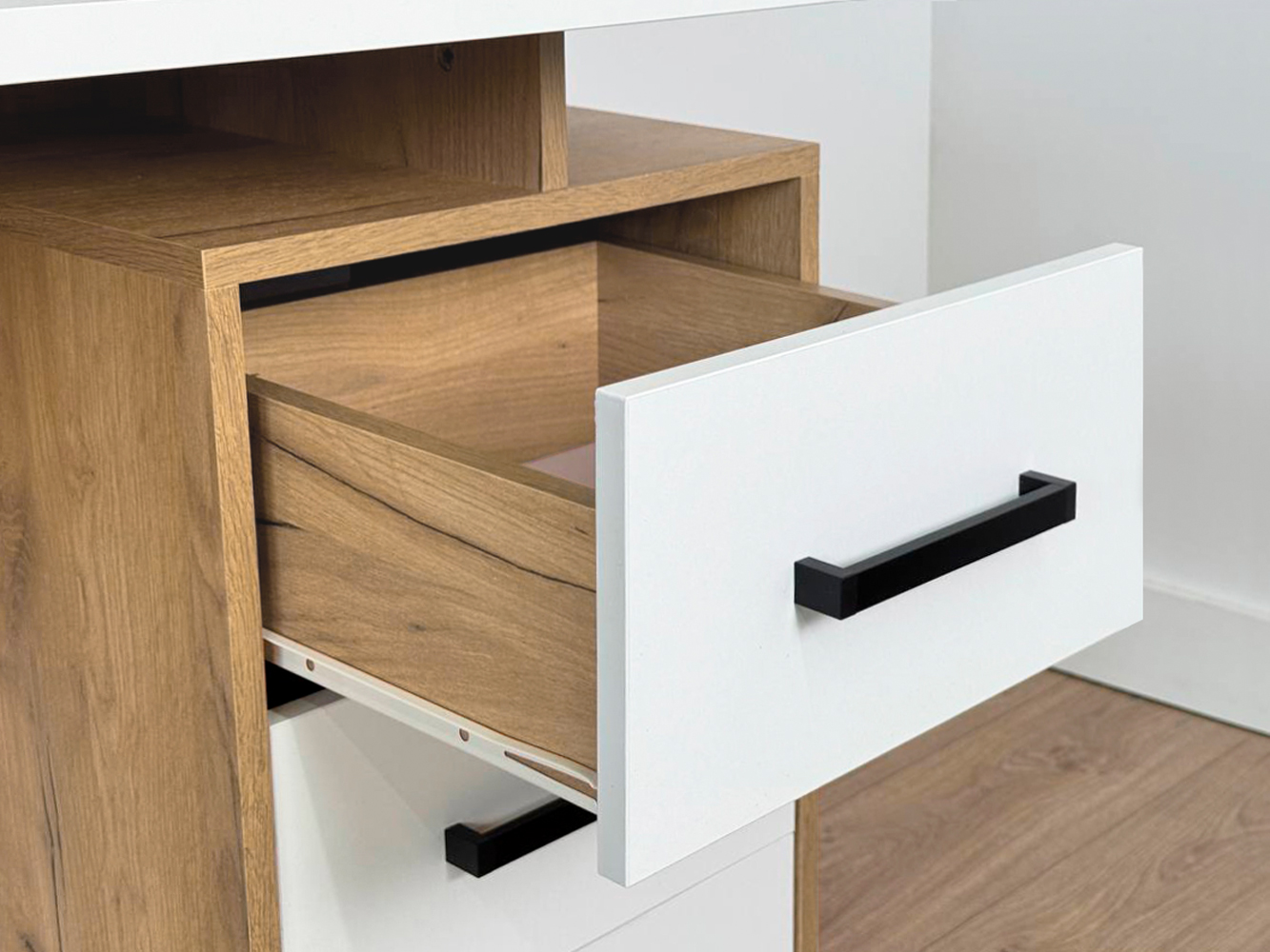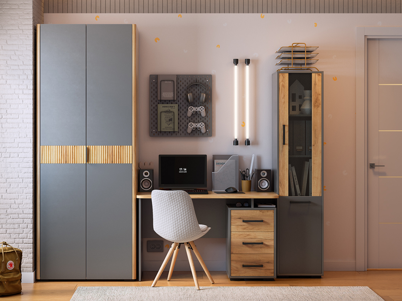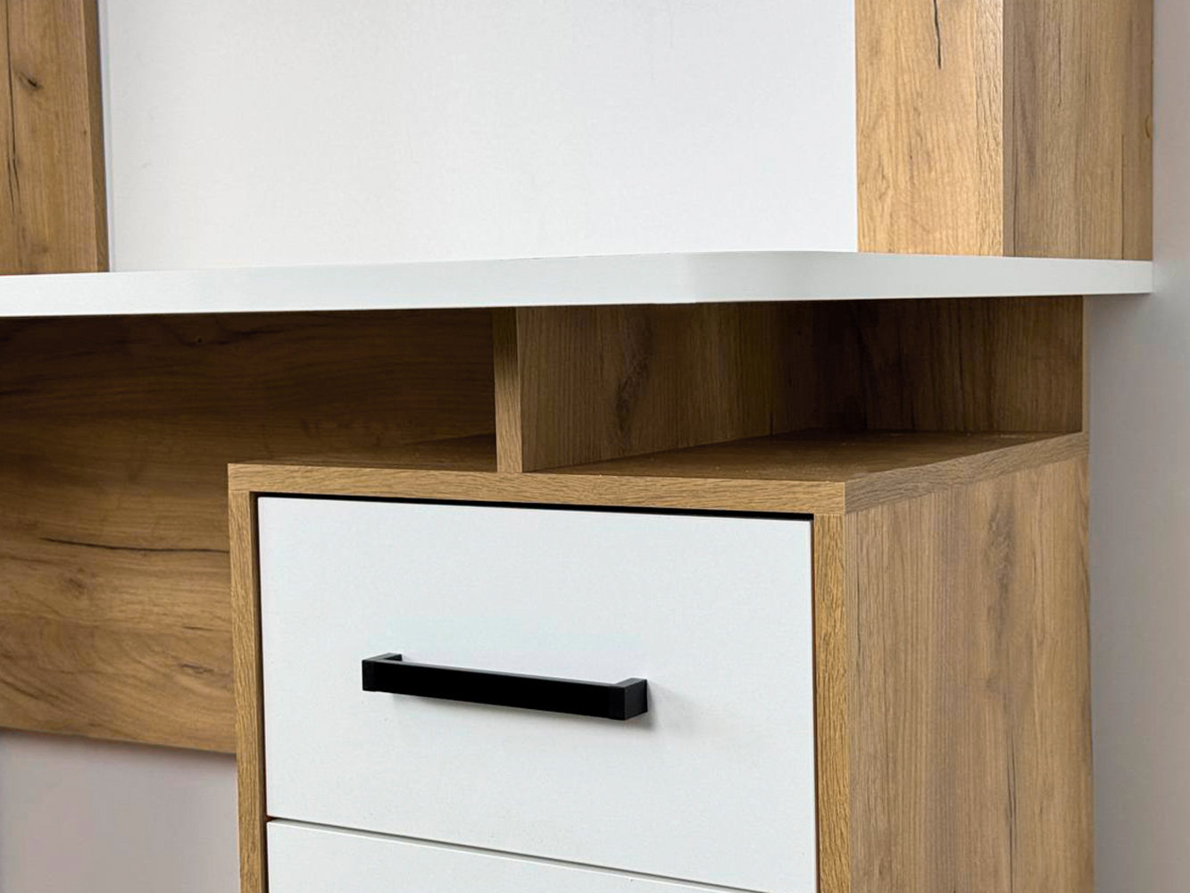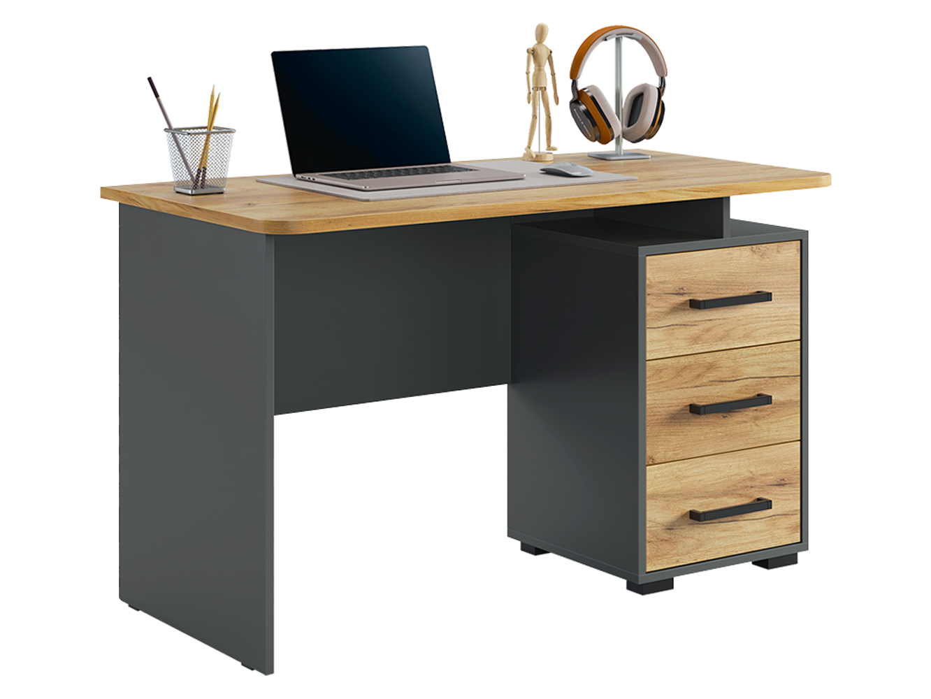 Компьютерный стол Лайт-2 станет незаменимым элементом рабочего пространства дома и в офисе. Просторная столешница обеспечит место для ноутбука или стационарного компьютера, а три выдвижных ящика позволят поддерживать порядок в документах и канцелярии. Сочетание светлых матовых фасадов с фактурой дерева добавляет интерьеру нотки уюта и создает визуальную легкость.