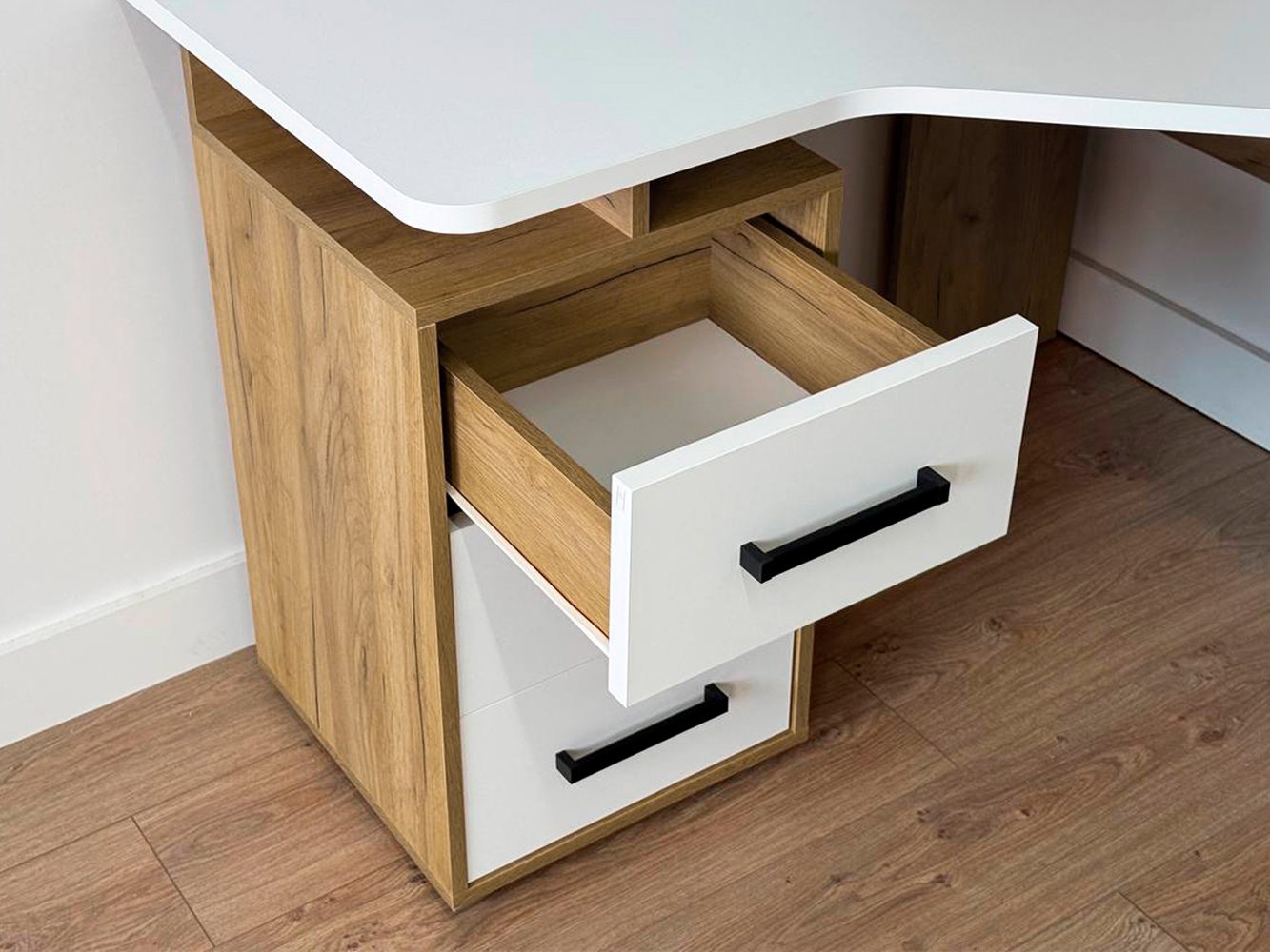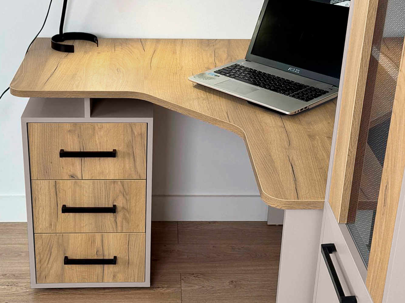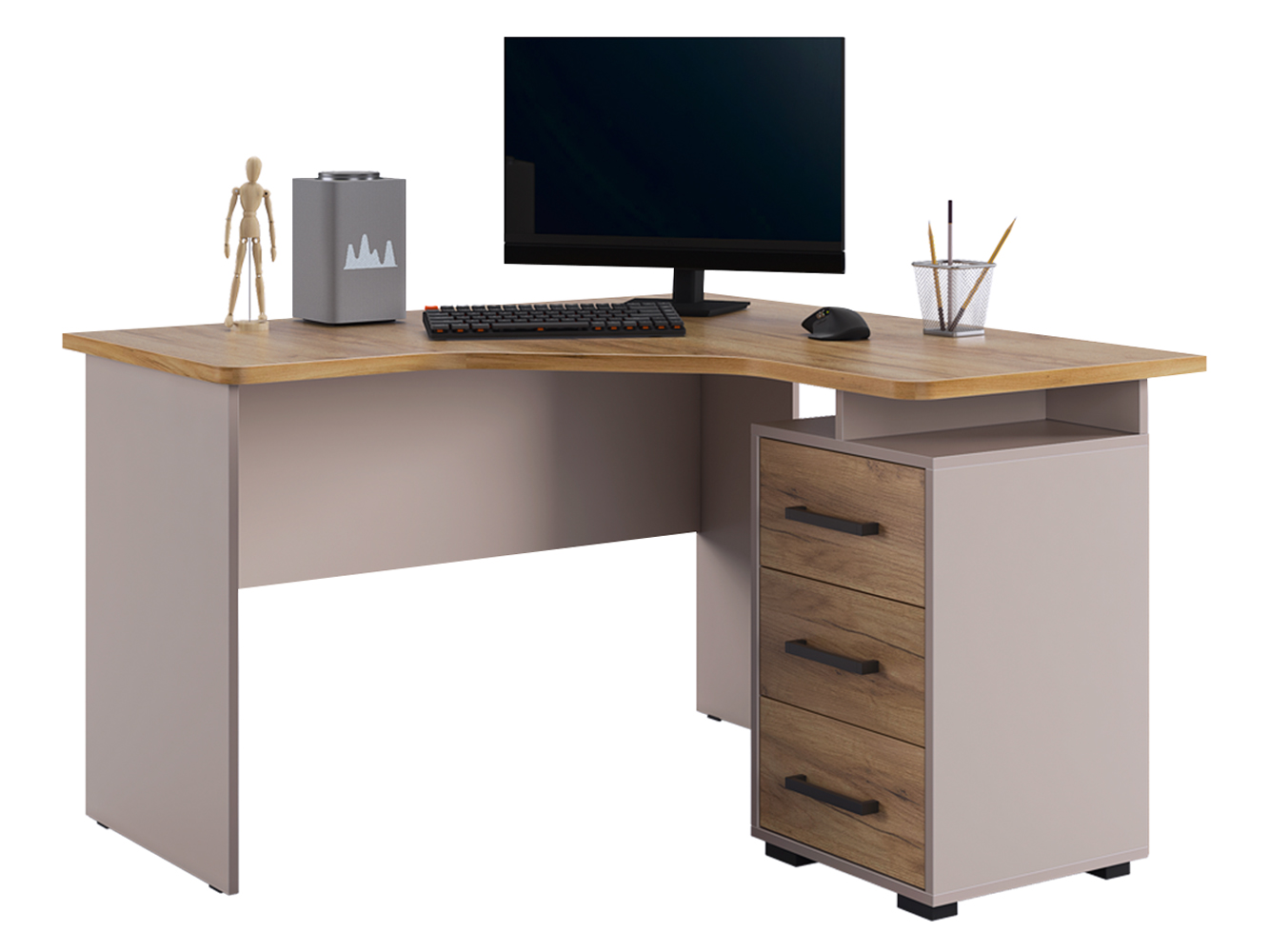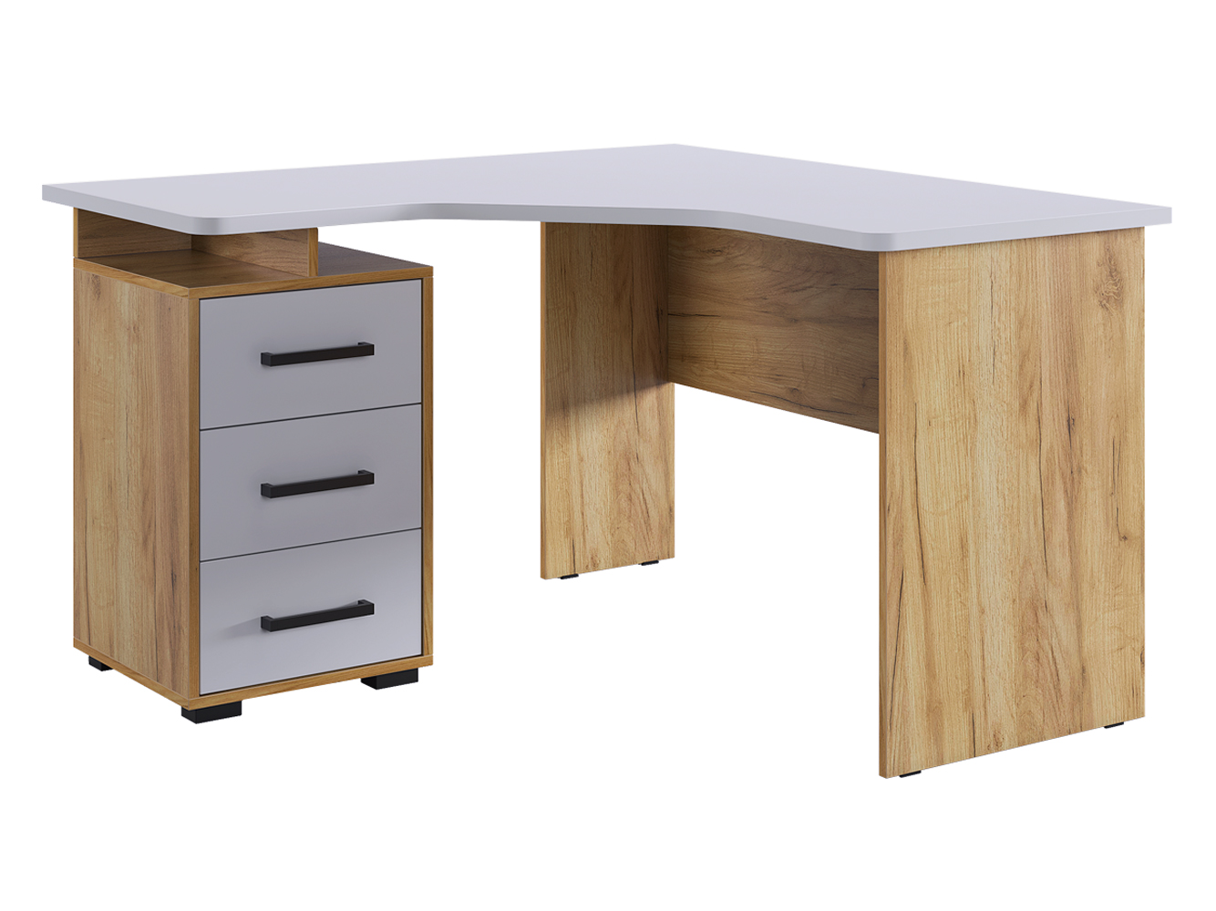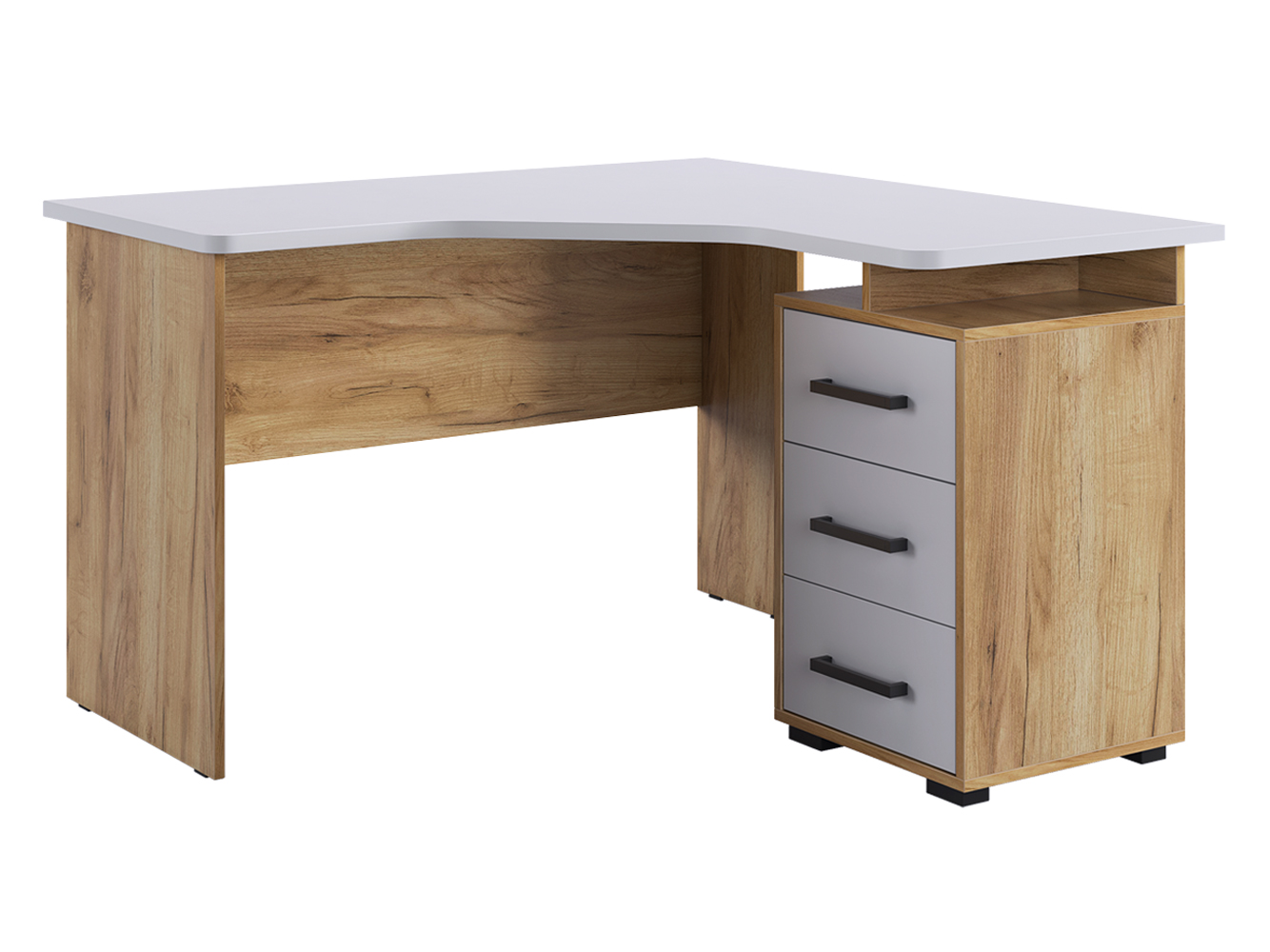 Письменный стол Лайт-2У — практичное и стильное решение для домашнего кабинета или офиса. Угловая конструкция экономит место и позволяет адаптировать модель даже в небольшом пространстве. Тумба с выдвижными ящиками и открытой нишей прямо под столешницей позволяет организовать аккуратное хранение документов и канцелярии. Лаконичный дизайн с сочетанием светлых фасадов и фактуры дерева гармонично смотрится в большинстве современных интерьеров.