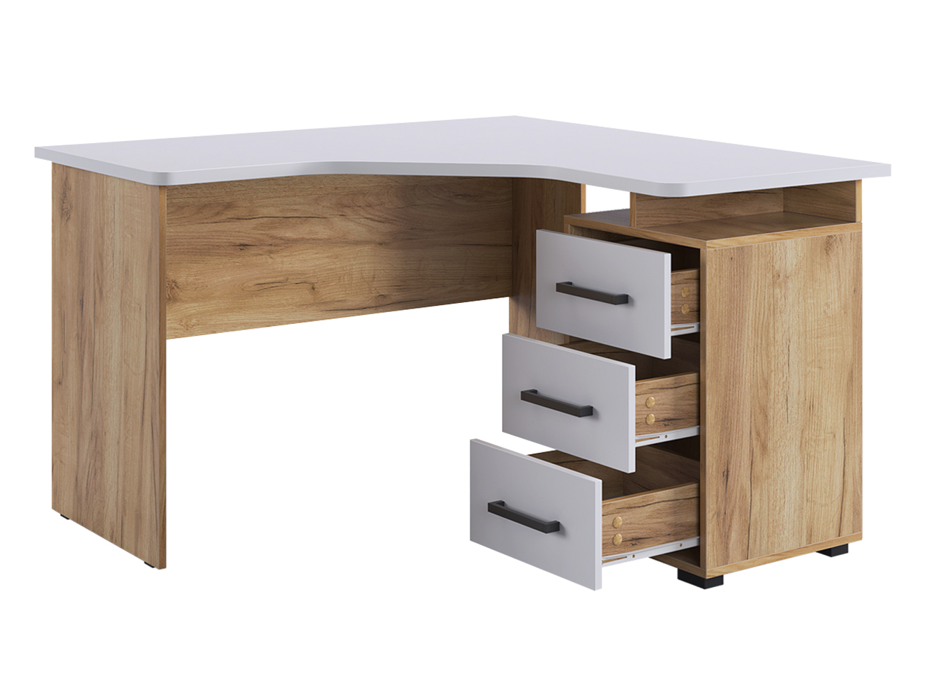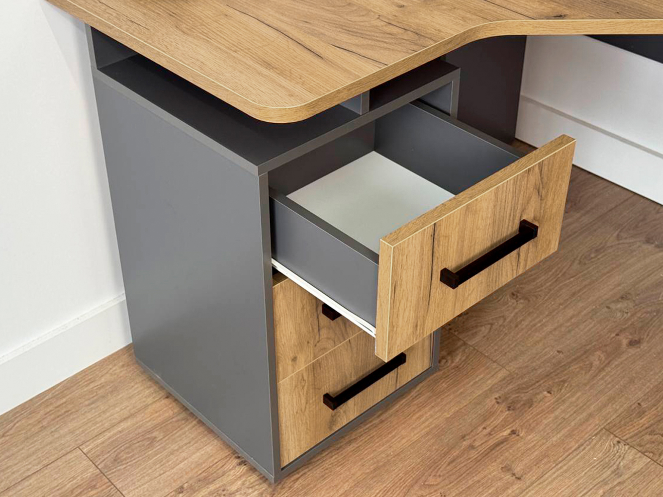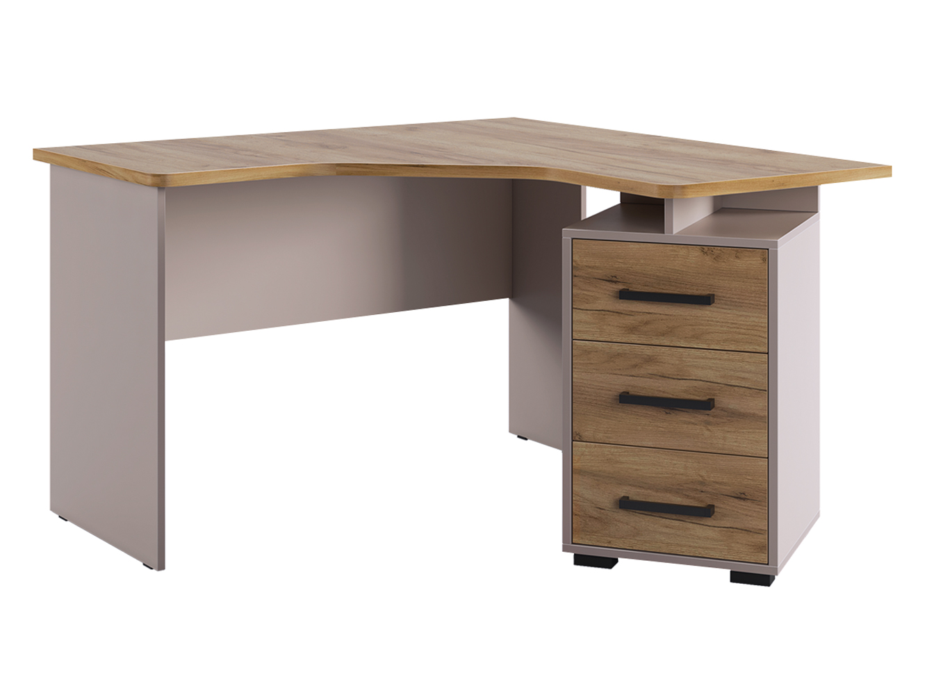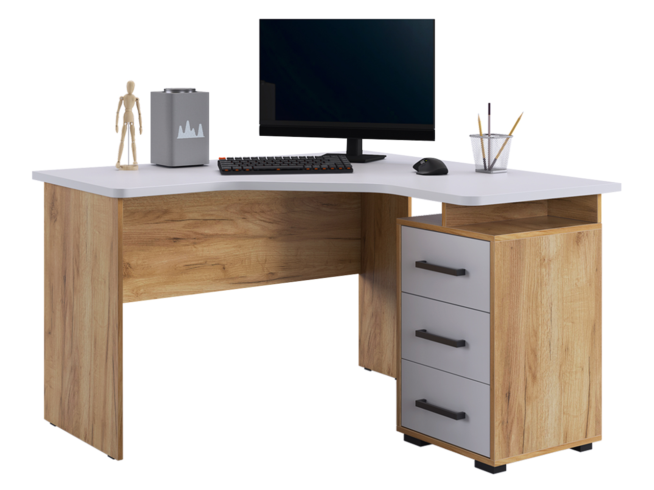 Письменный стол Лайт-2У — практичное и стильное решение для домашнего кабинета или офиса. Угловая конструкция экономит место и позволяет адаптировать модель даже в небольшом пространстве. Тумба с выдвижными ящиками и открытой нишей прямо под столешницей позволяет организовать аккуратное хранение документов и канцелярии. Лаконичный дизайн с сочетанием светлых фасадов и фактуры дерева гармонично смотрится в большинстве современных интерьеров.