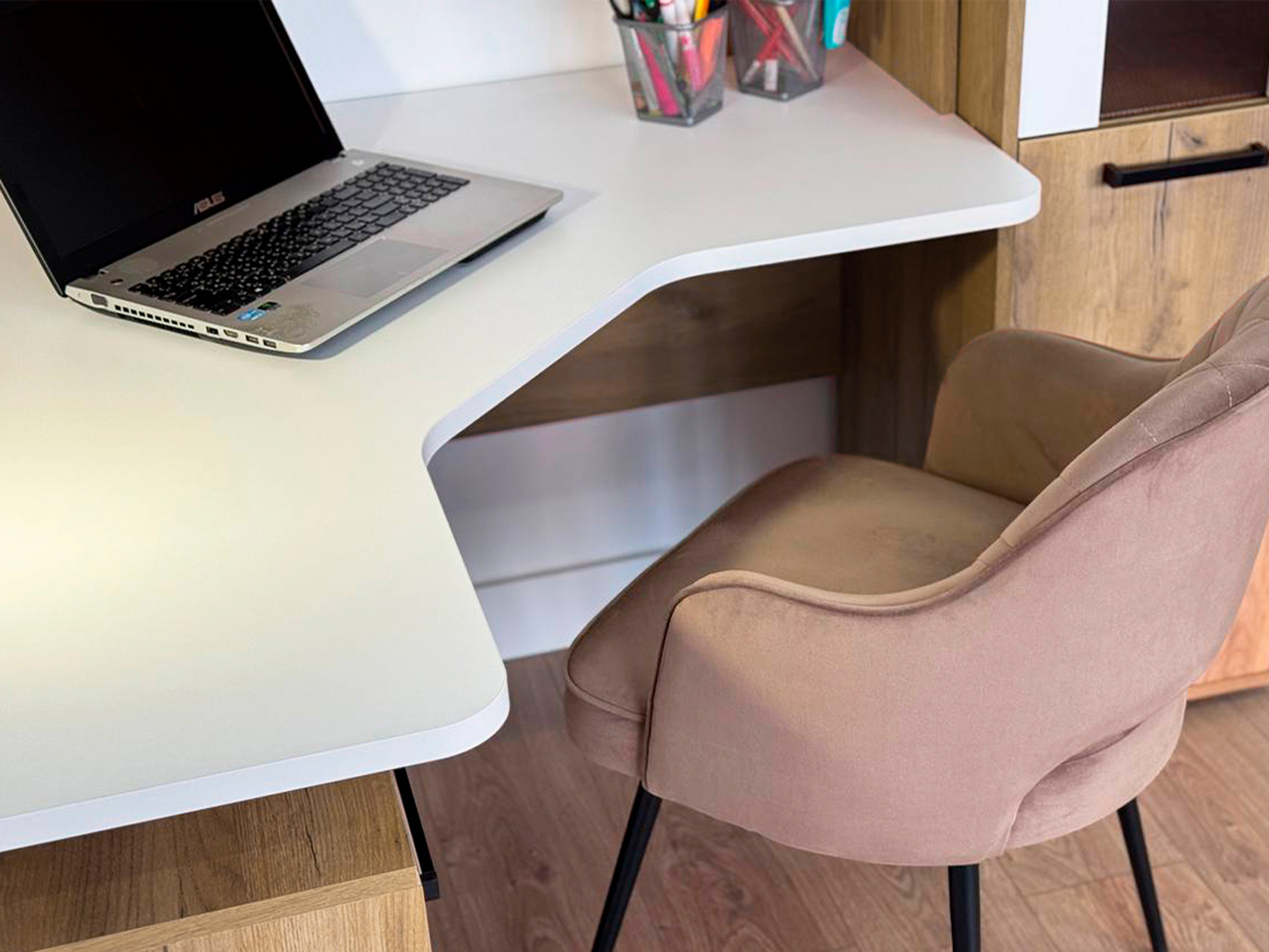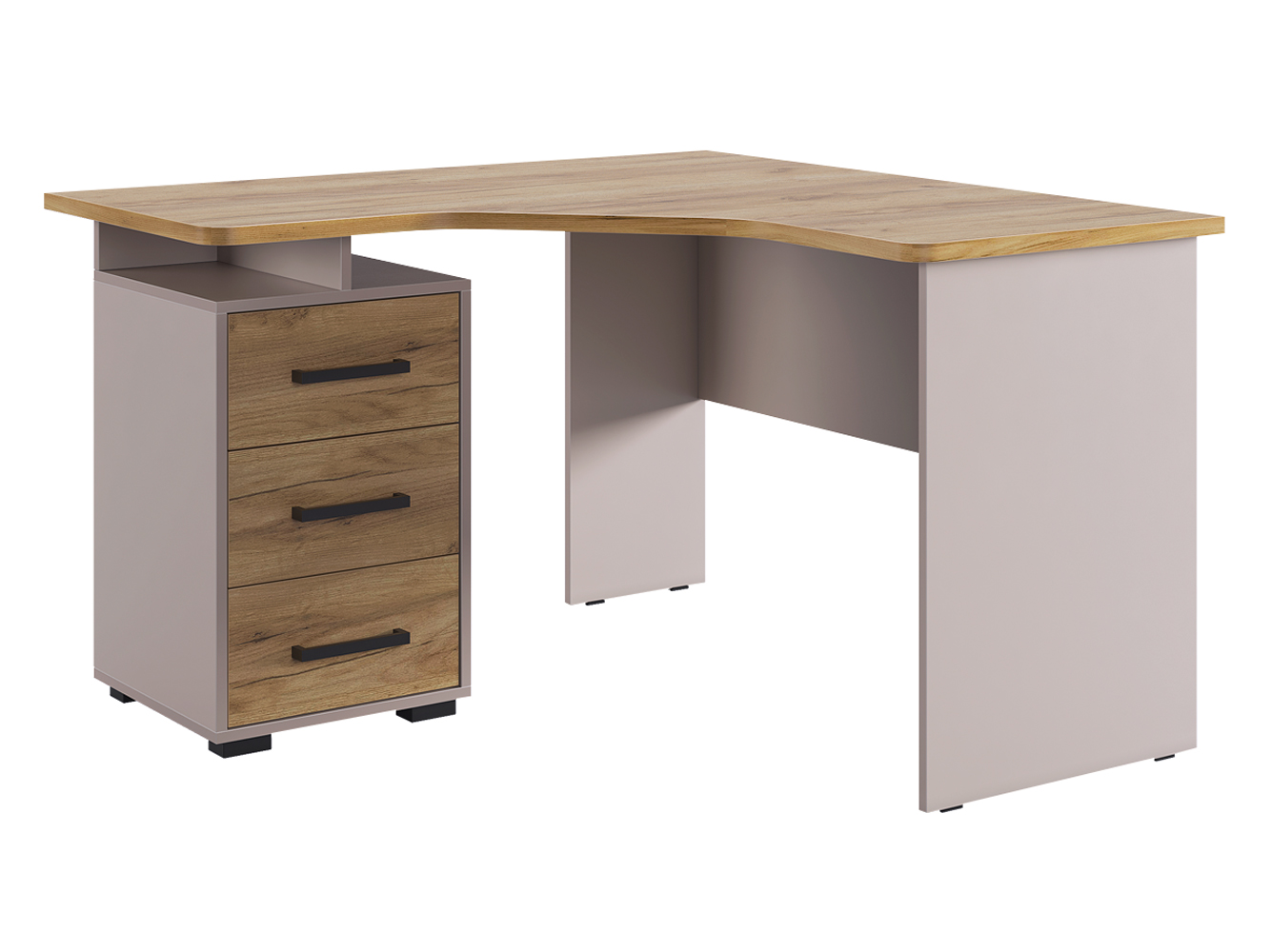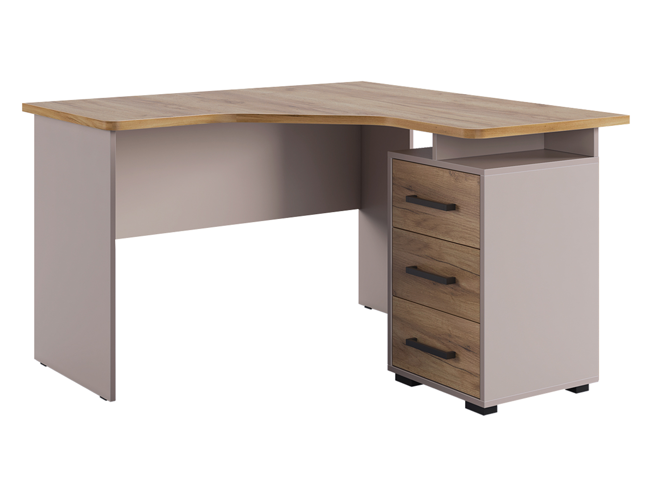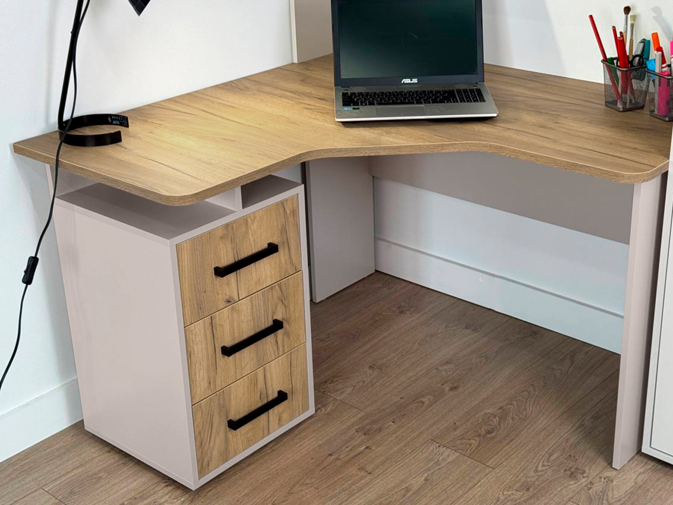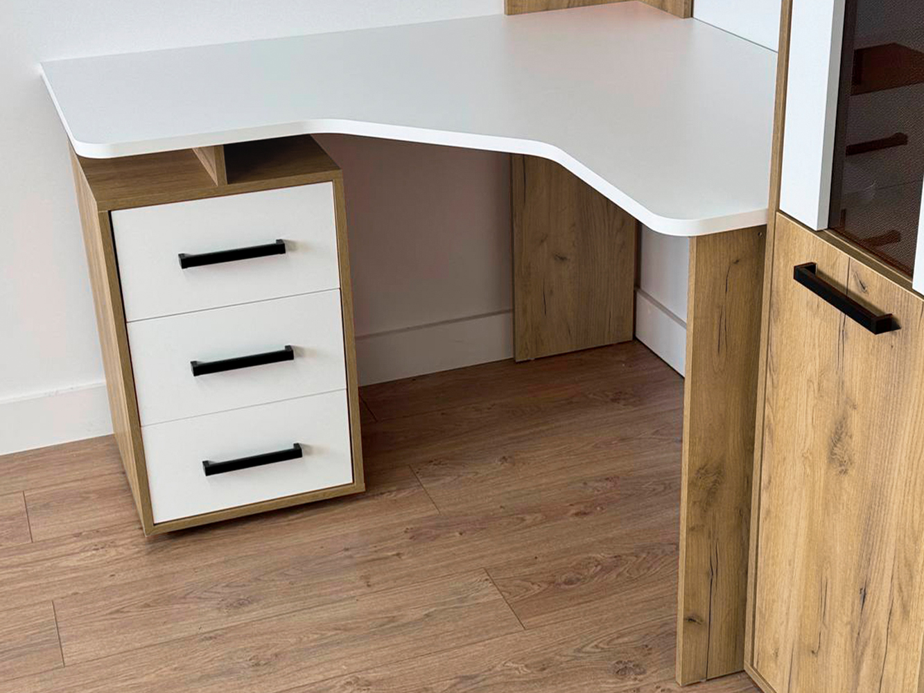 Письменный стол Лайт-2У — практичное и стильное решение для домашнего кабинета или офиса. Угловая конструкция экономит место и позволяет адаптировать модель даже в небольшом пространстве. Тумба с выдвижными ящиками и открытой нишей прямо под столешницей позволяет организовать аккуратное хранение документов и канцелярии. Лаконичный дизайн с сочетанием светлых фасадов и фактуры дерева гармонично смотрится в большинстве современных интерьеров.