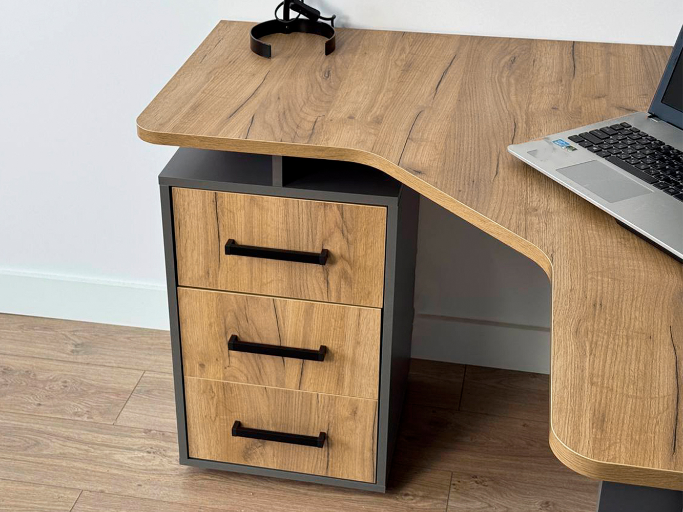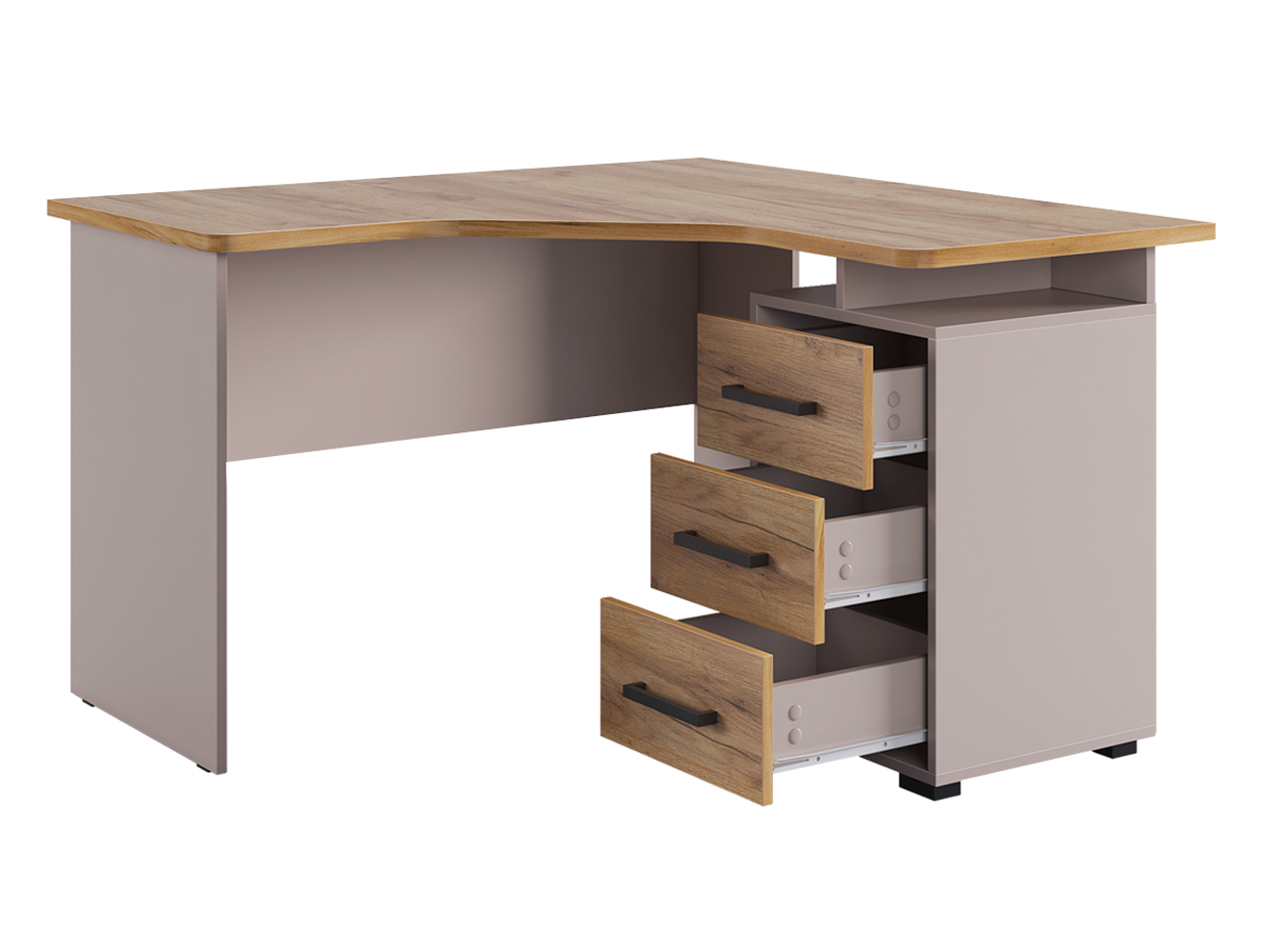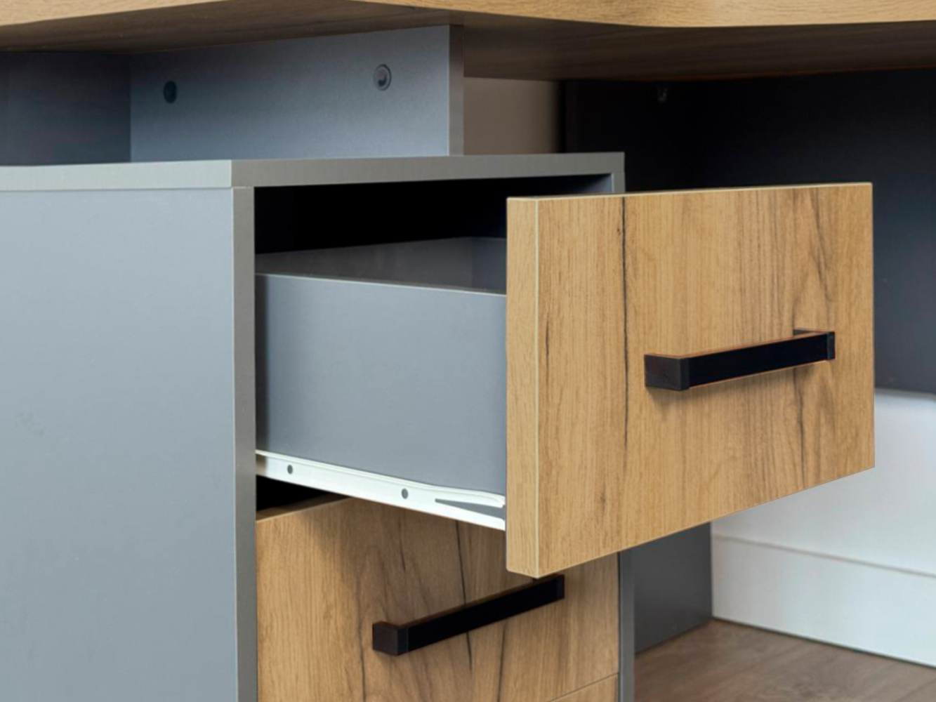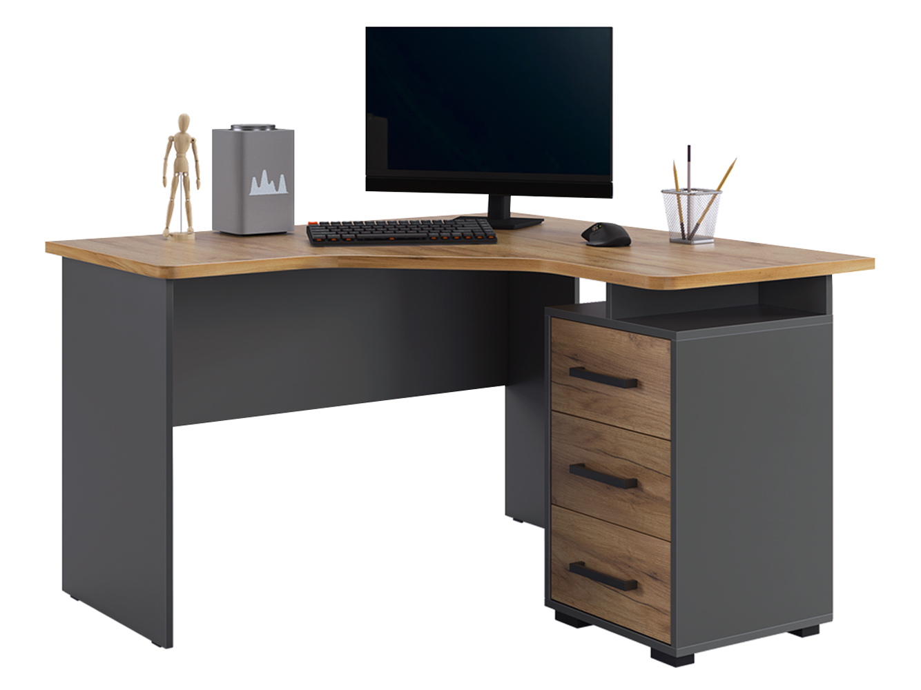 Письменный стол Лайт-2У — практичное и стильное решение для домашнего кабинета или офиса. Угловая конструкция экономит место и позволяет адаптировать модель даже в небольшом пространстве. Тумба с выдвижными ящиками и открытой нишей прямо под столешницей позволяет организовать аккуратное хранение документов и канцелярии. Лаконичный дизайн с сочетанием светлых фасадов и фактуры дерева гармонично смотрится в большинстве современных интерьеров.