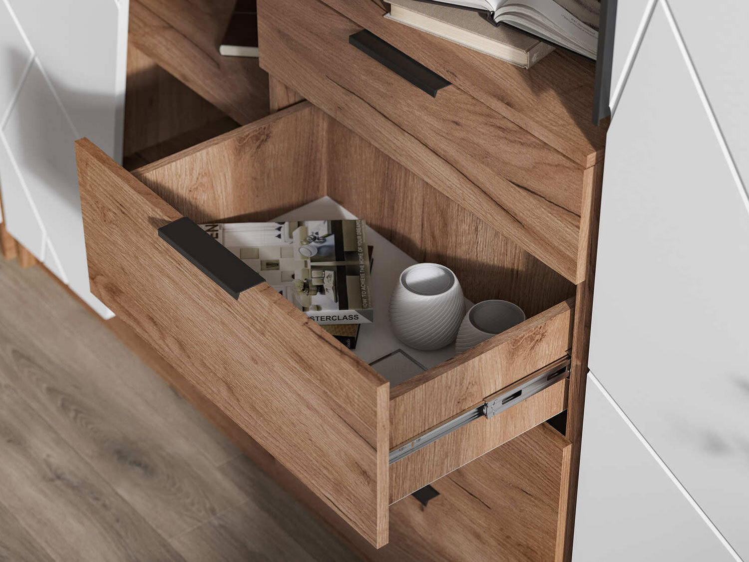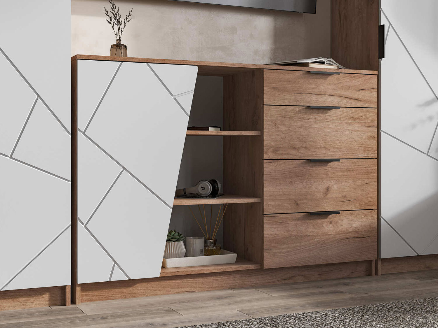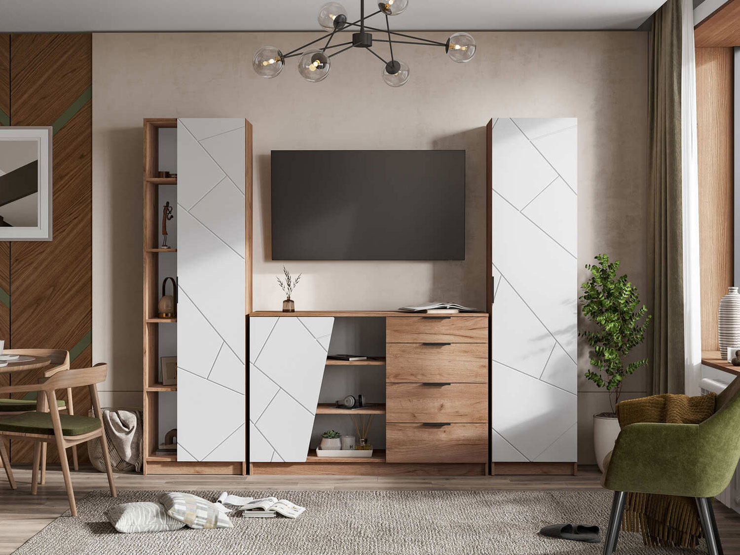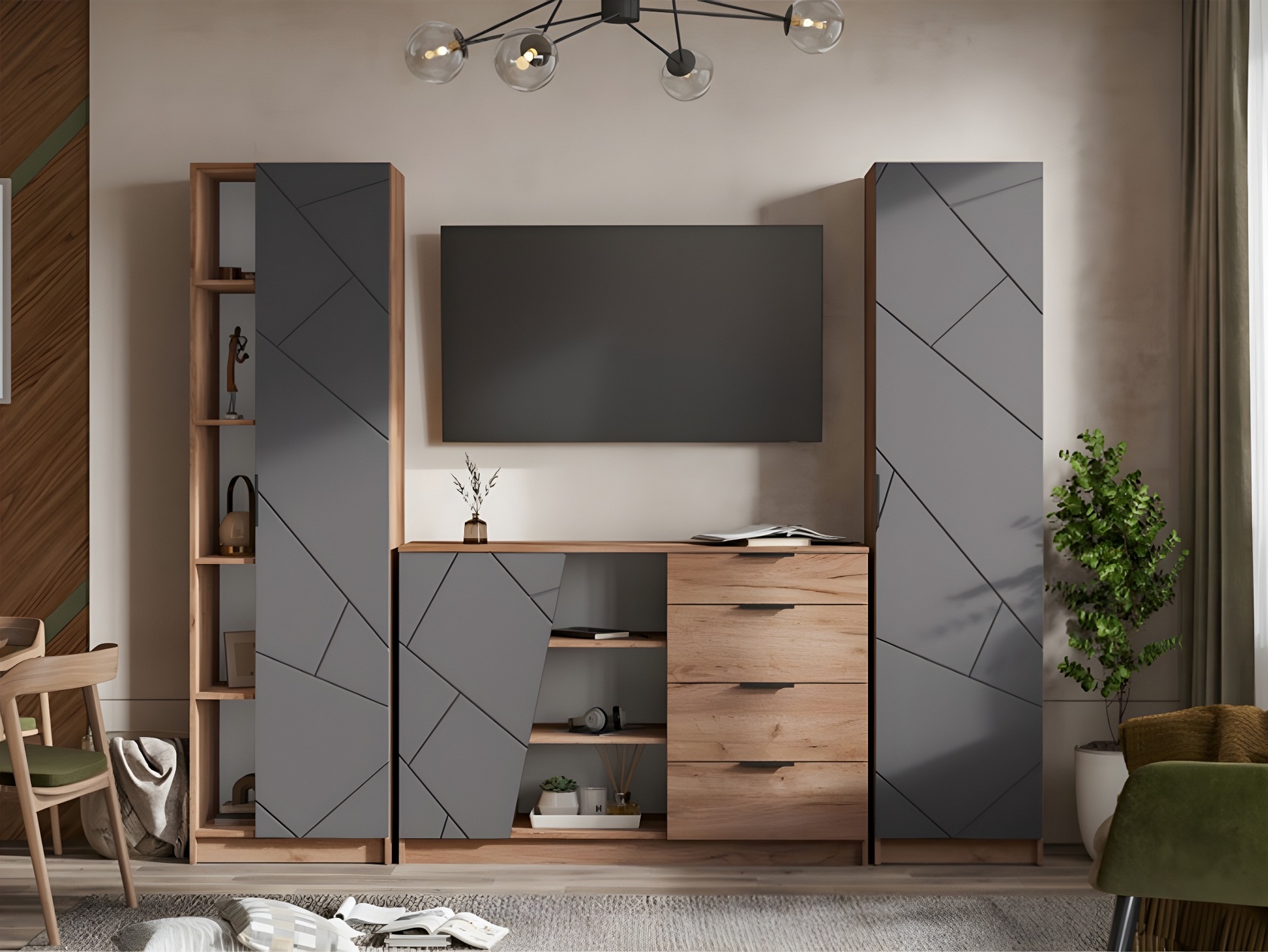 Гостиная Орегон украсит интерьер и добавит динамики пространству, где будет приятно провести время за просмотром любимого фильма или сериала. Ассиметричная фрезеровка на дверцах добавляет обстановке яркий акцент. Сочетание открытых полок и ниш за глухими фасадами позволяет аккуратно хранить самые разные вещи: от одежды до книг и декора.